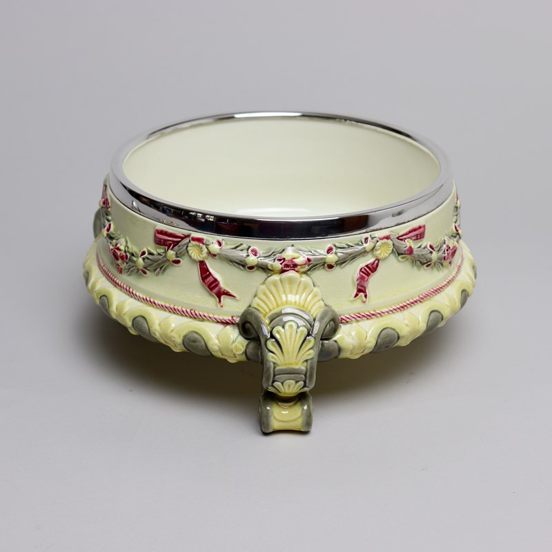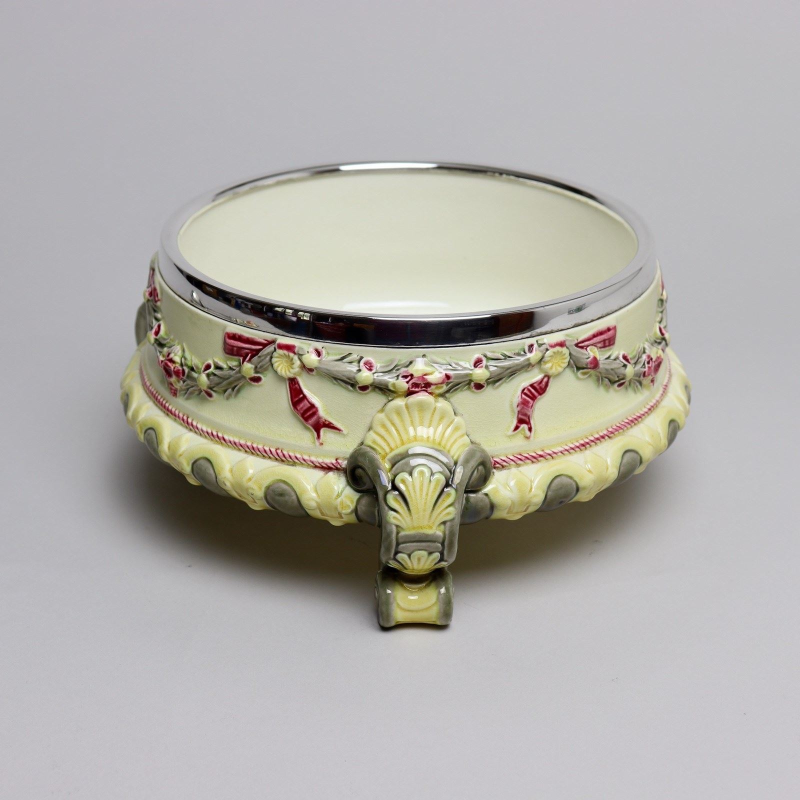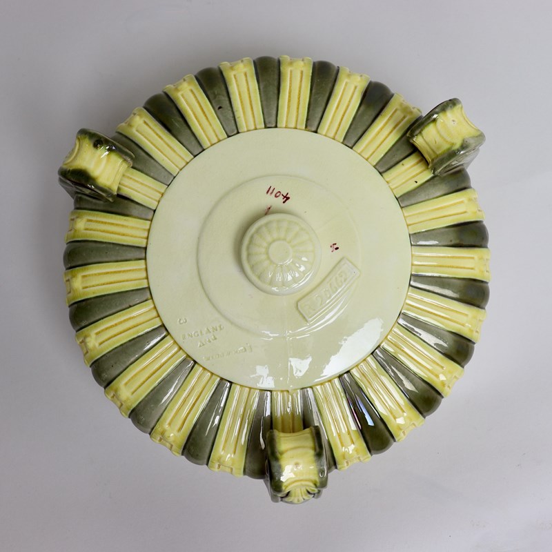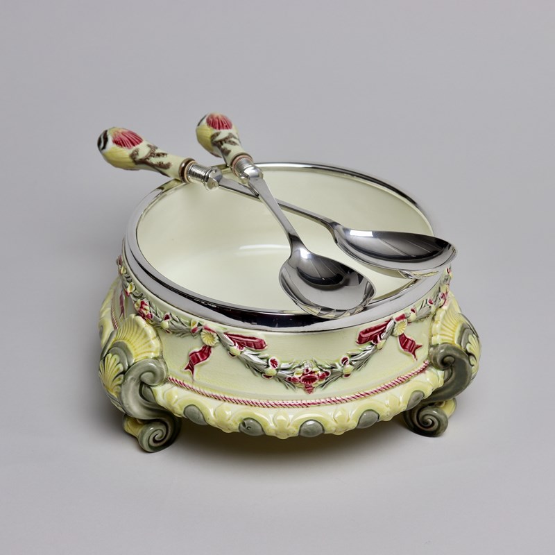An unusual, Wedgwood majolica salad bowl and servers. This is marked ”WEDGWOOD ENGLAND” and it is also impressed with the letters “BNV”. This is the date code letters for the year 1893. There is a further impressed mark in the form of a registered design number “Rd206621” and the pattern number “4011” is painted in iron red. The elaborate design is moulded in a heavy earthenware and then coloured in red, yellow and grey majolica glazes. The matching servers are moulded with shells and seaweed and both the bowl and the servers have silver plated fittings. This is a really good looking set and it is in excellent condition.