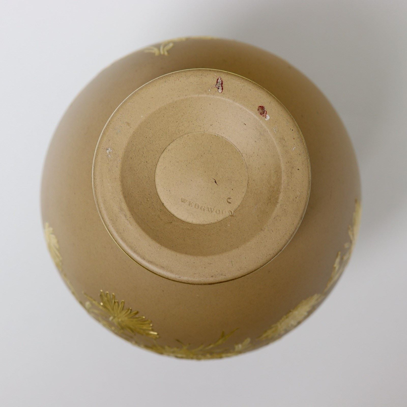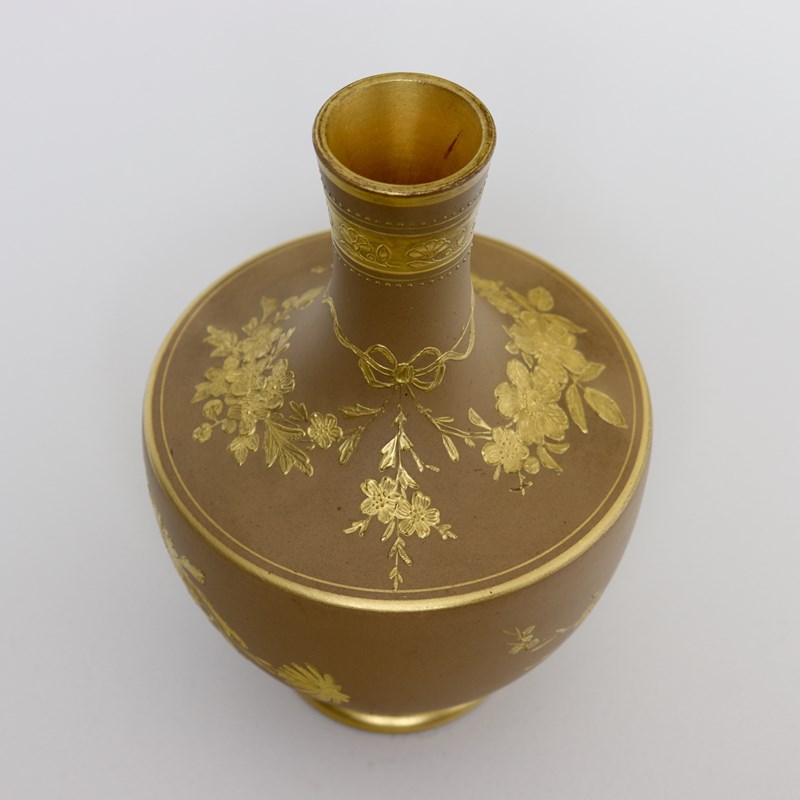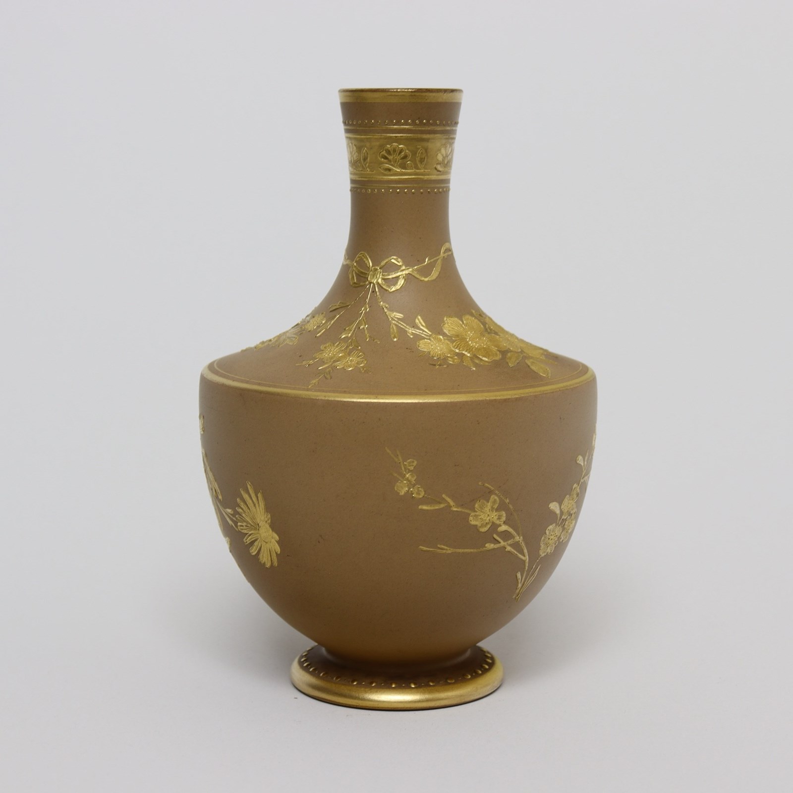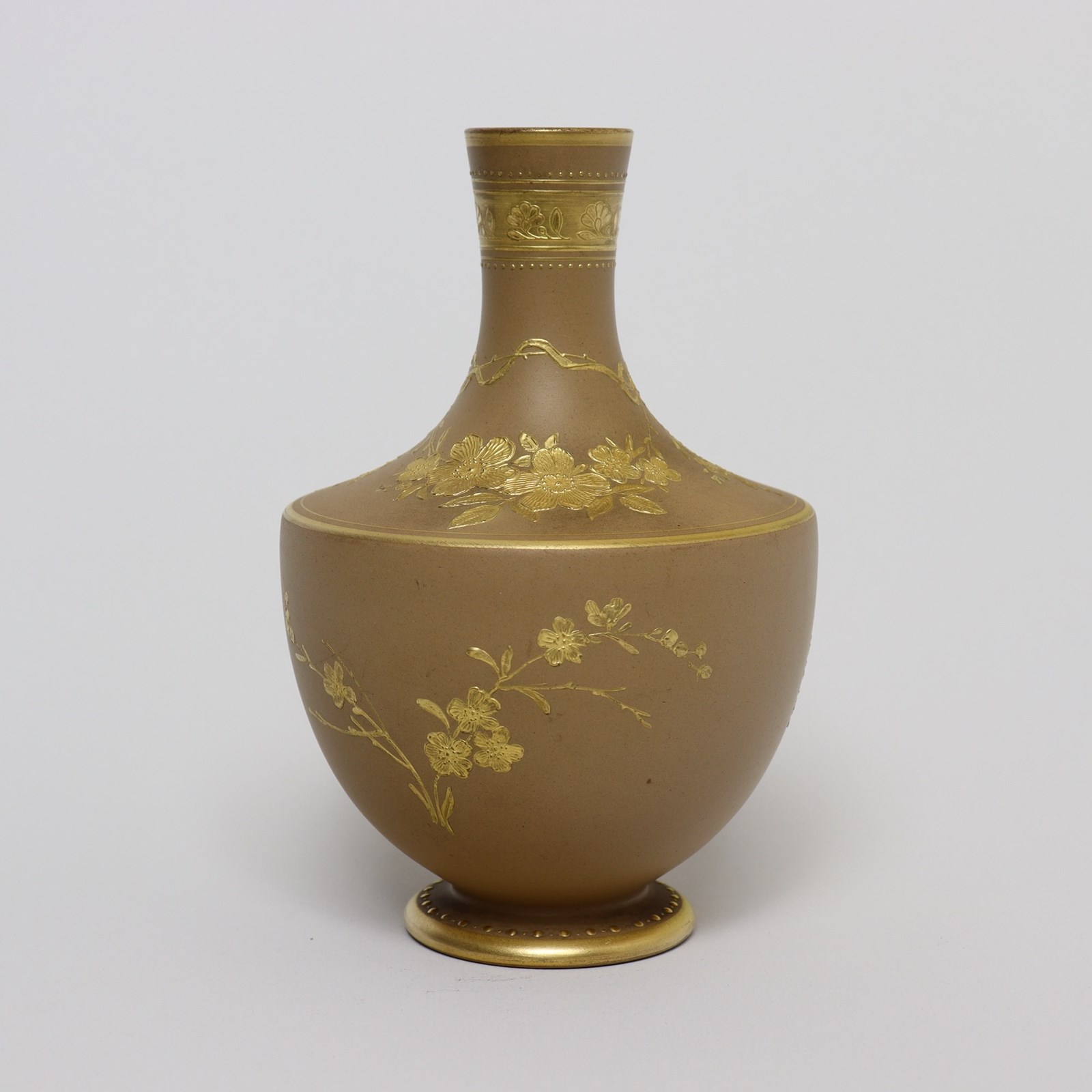 A very unusual, Wedgwood, buff coloured stoneware vase with raised gilt decoration. This is marked “WEDGWOOD” and it dates from c.1870. Raised gilt decoration, in the oriental manner, was used by Wedgwood on basalt and also on Ivory ware but it is rarely seen on other bodies and this combination is both subtle and also very attractive. The vase is in excellent condition.