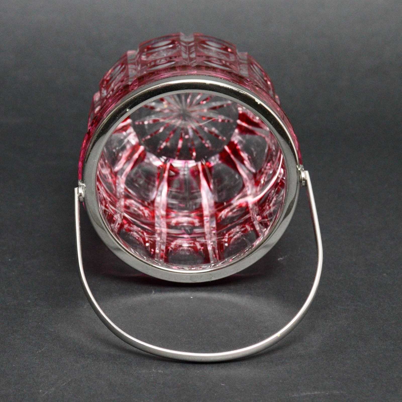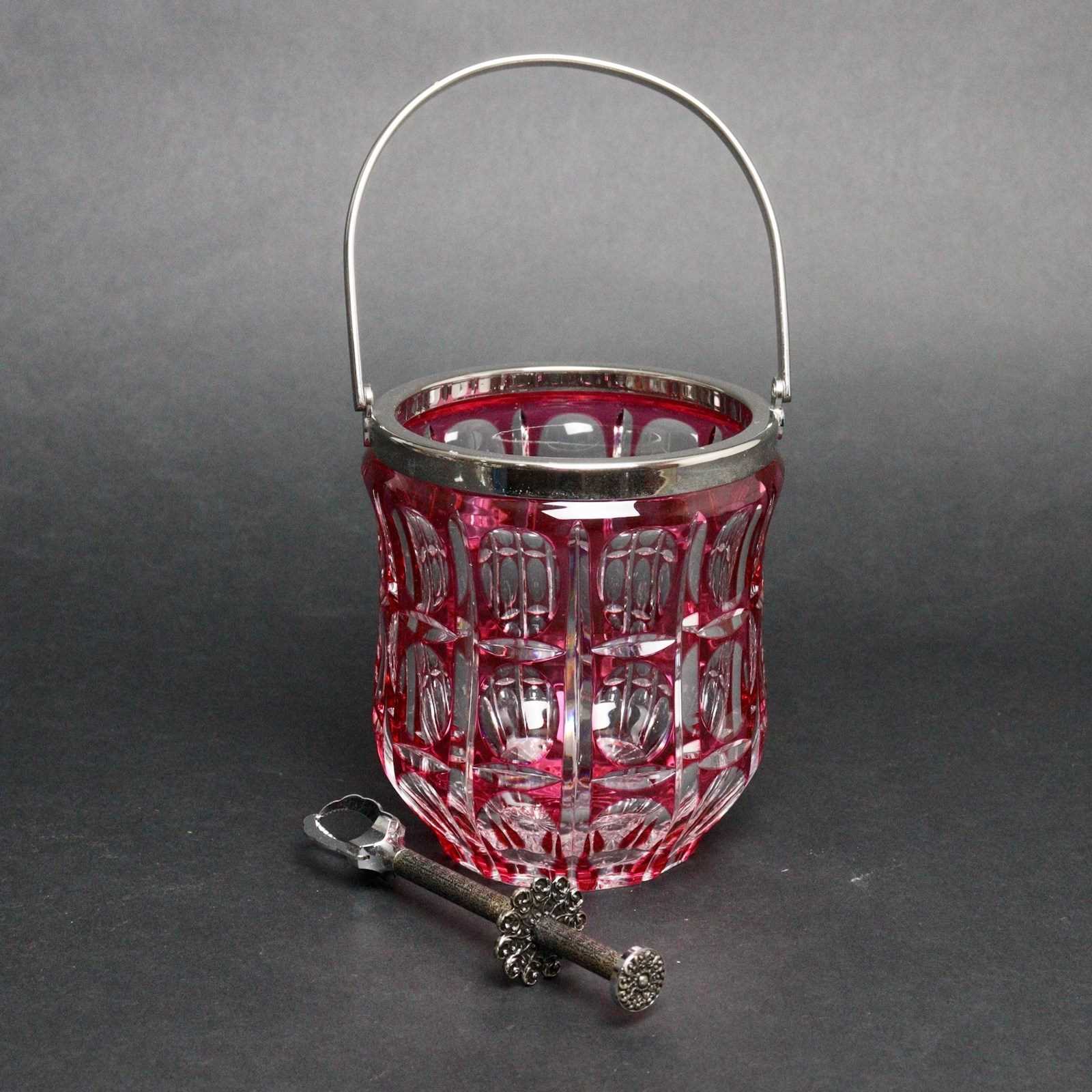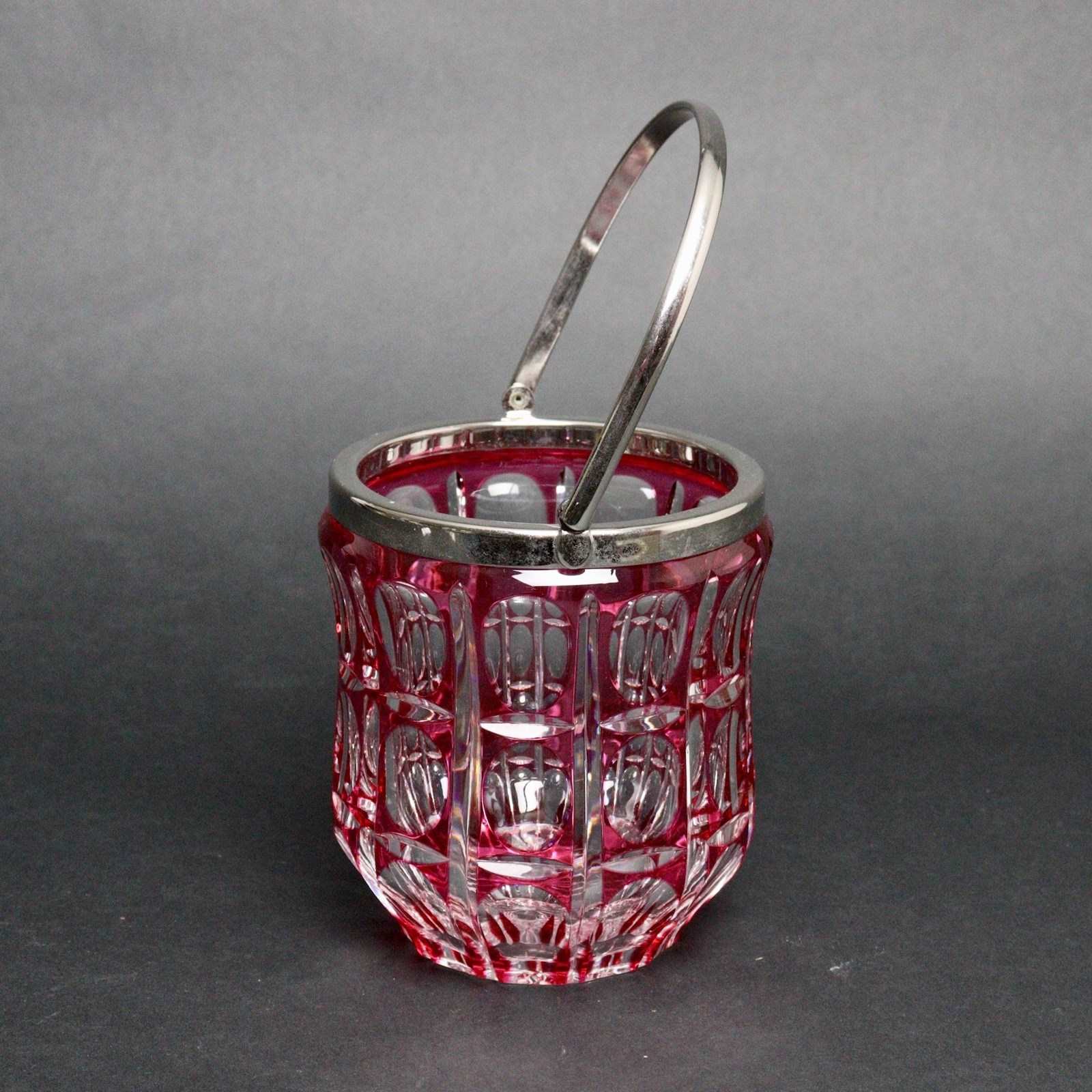 A fabulous quality, Belgian crystal ice bucket. This is made by Val St. Lambert and it dates from c. 1920. It is decorated with a typical Art Deco design, combining ovals and elliptical shapes, in ruby overlay. The simple mounts are silver plated and the piece is in excellent condition.