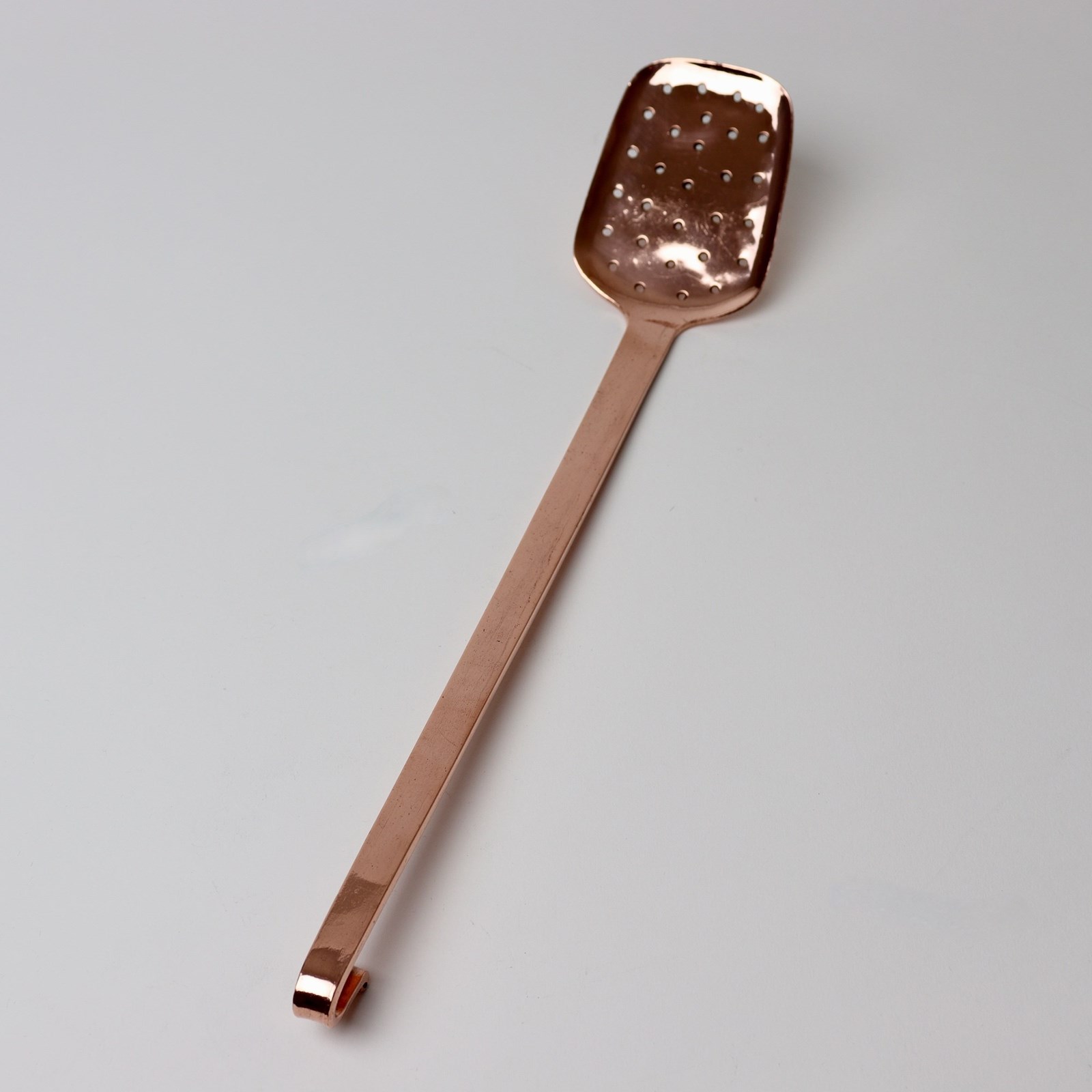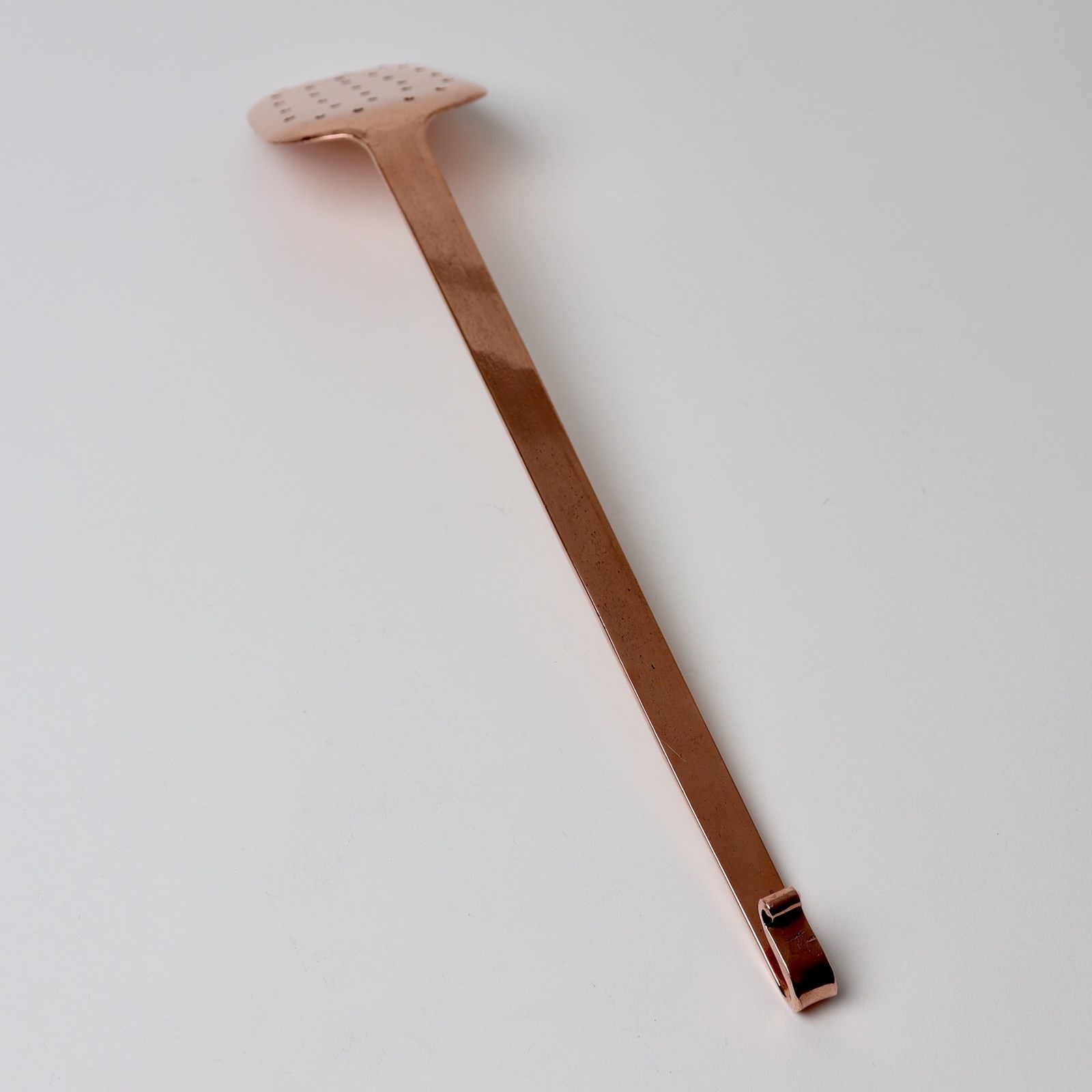 A very small, 19th century, copper skimmer or fish slice. This is French and it dates from c.1880. It is made from a heavy gauge of copper and the end of the handle is turned, resembling a shepherd’s crook, so that it can hang when not in use. It is in excellent condition.