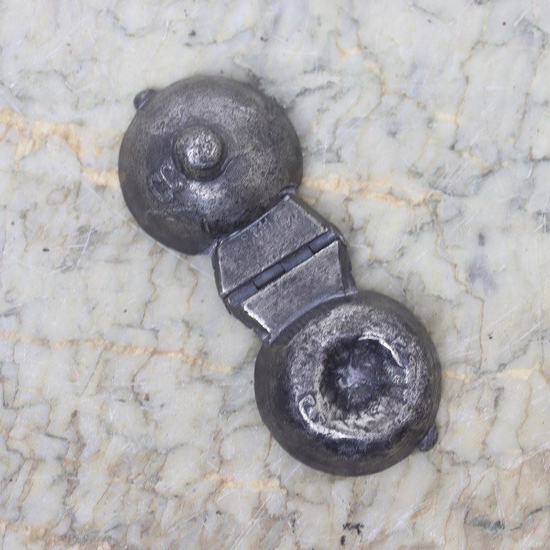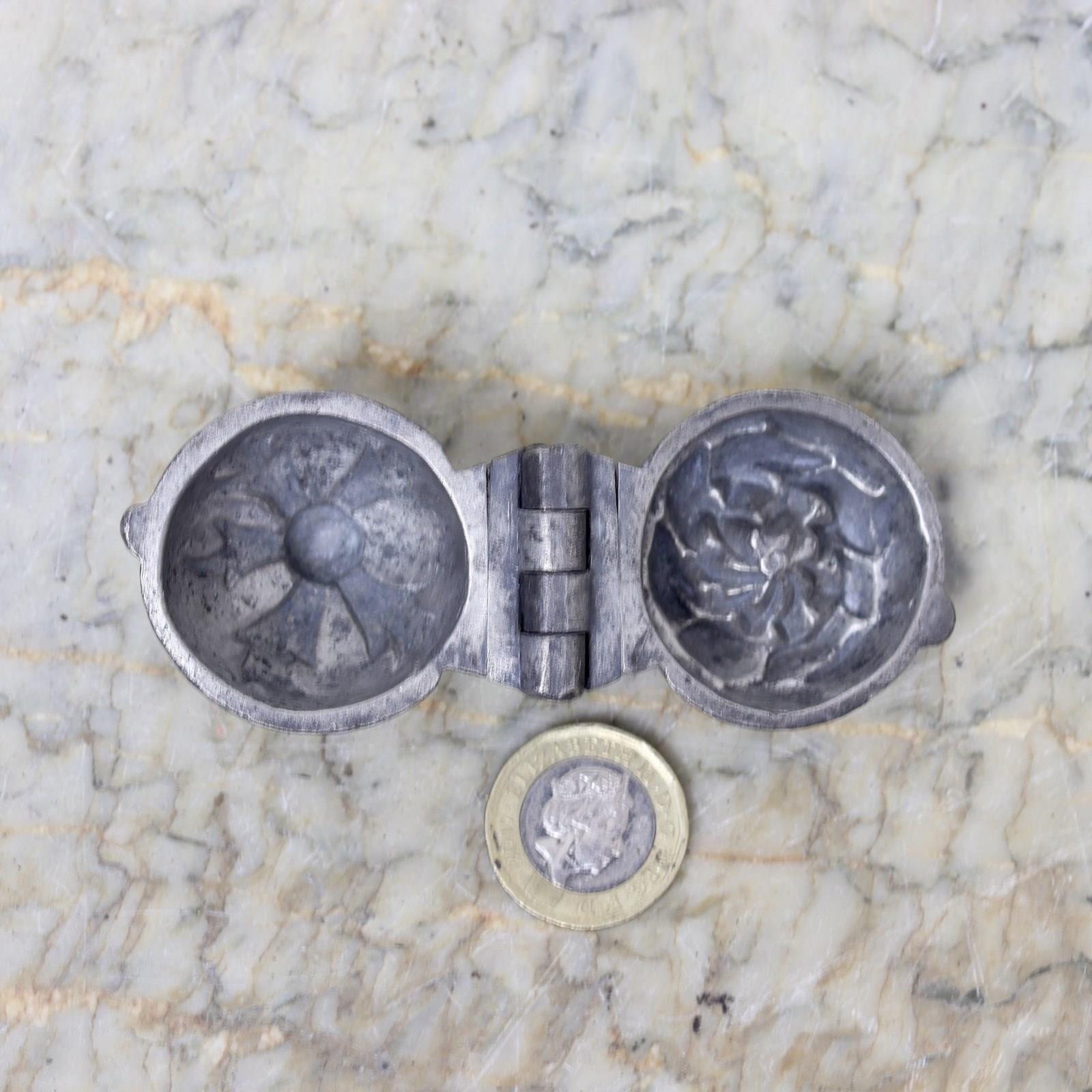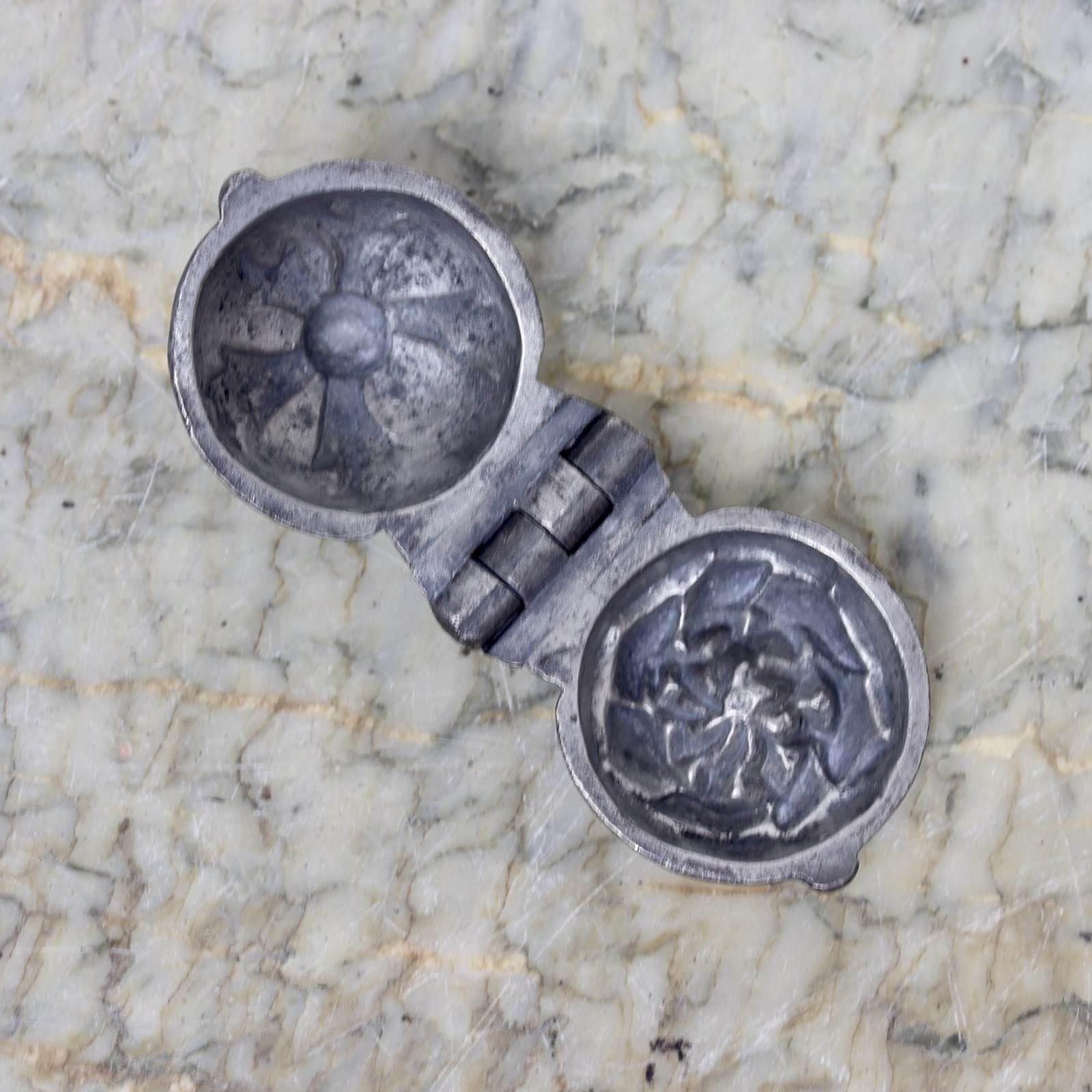 A very small, pewter ice cream mould in the shape of a rose. This is marked, in the casting, “C.C” which is the mark of the French company Cadot. It is also marked on the hinge but part of this mark is illegible. The end of the mark reads “**ESCH FILS”. The mould dates from c.1870. The rose is well detailed and the mould is in good condition. The interior is in usable condition and the exterior has a dark patina.
