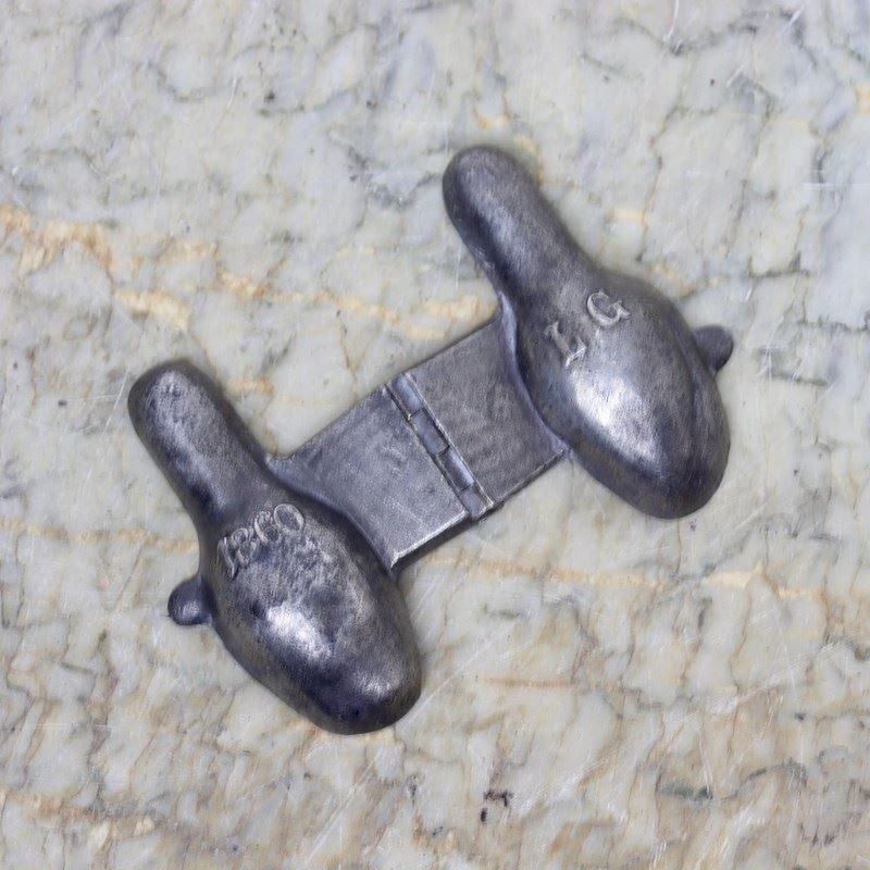 A very small, pewter ice cream mould in the shape of a tulip. This is marked, in the casting, “L.G” and “1860”. L.G is the mark of the French company Letang and 1860 is the pattern number. It is also marked, on the interior of the hinge, “LETANG FILS PARIS”. The mould dates from c.1880. The tulip is extremely well detailed and the mould is in good condition. The interior is in very good, bright, usable condition and the exterior has a dark patina.
