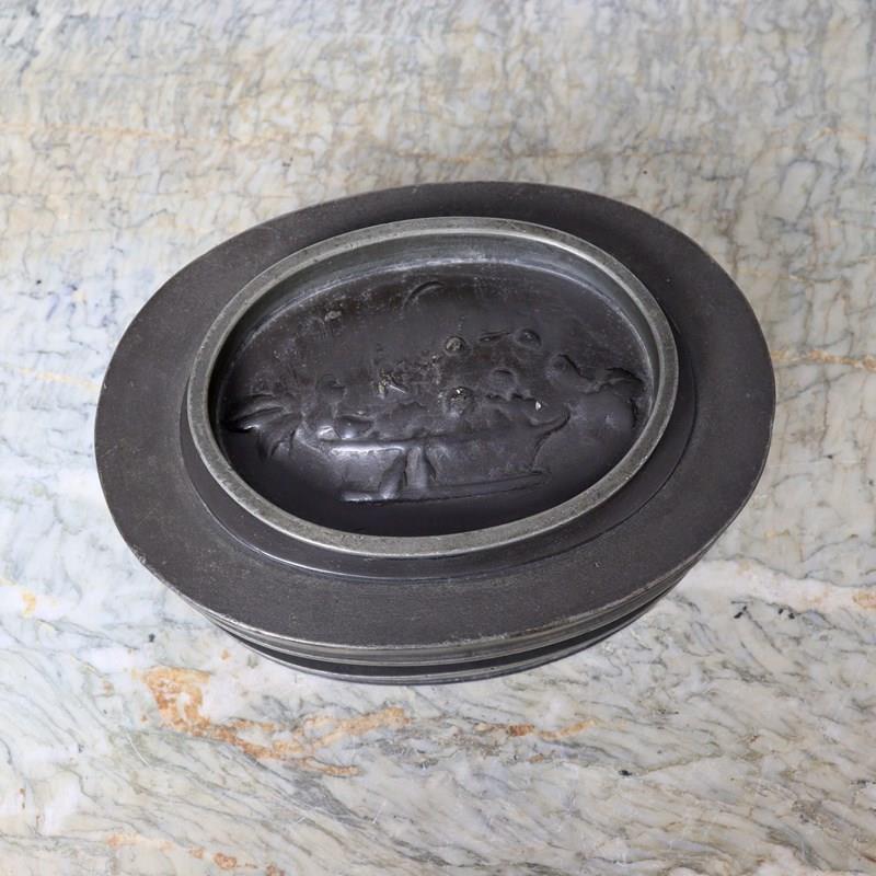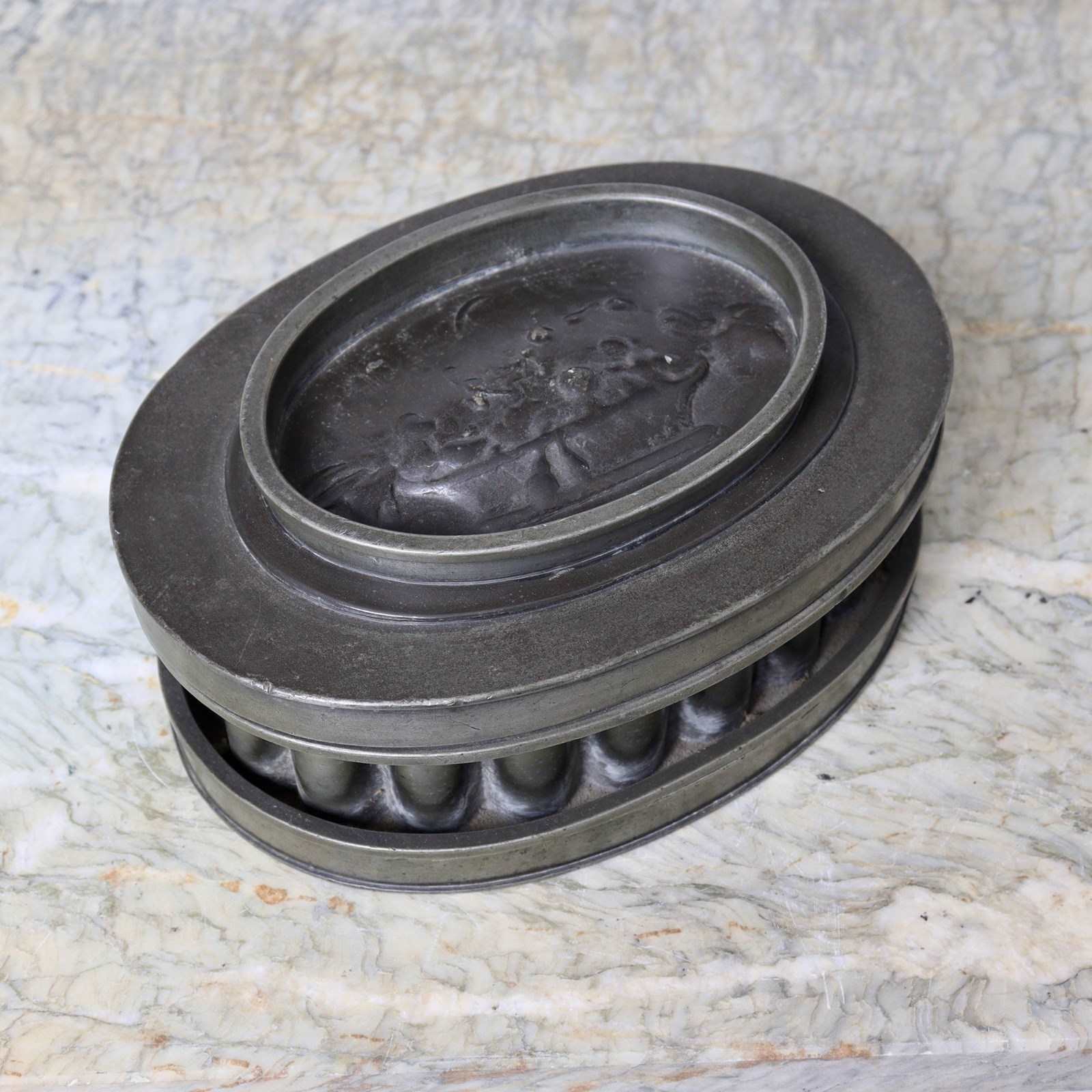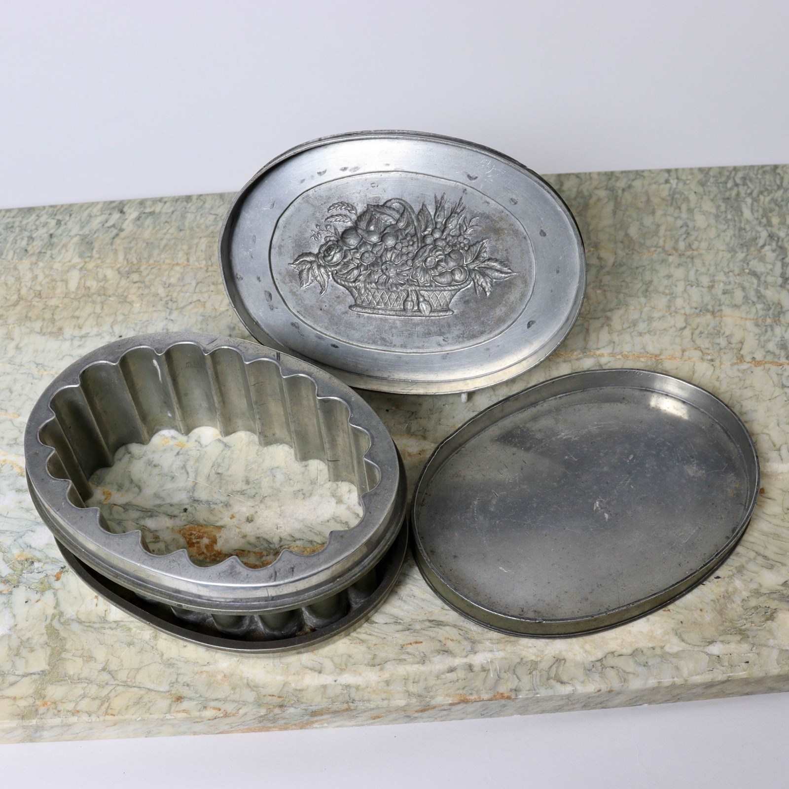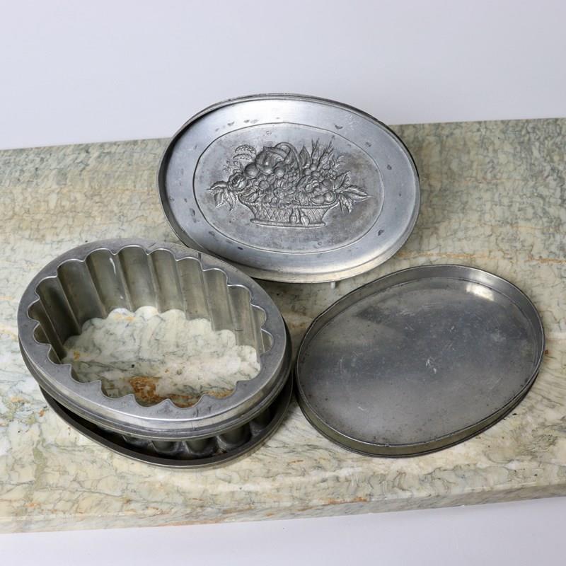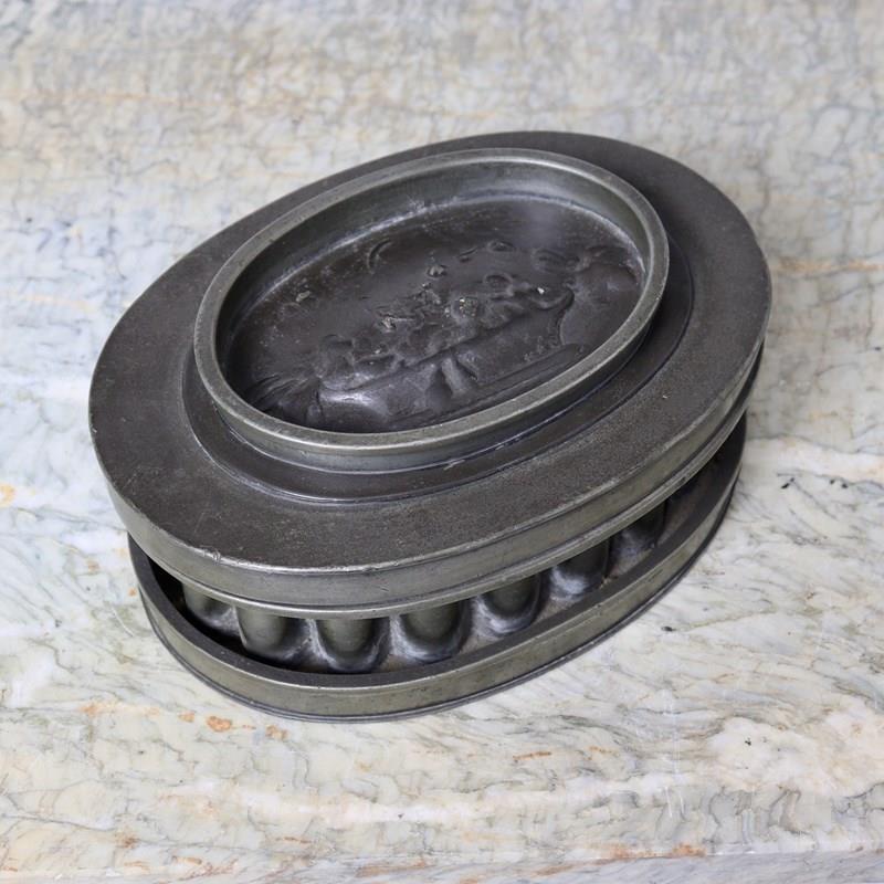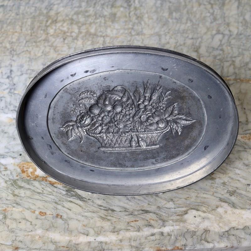 A very unusual, 19th century, pewter ice cream banquet mould. This bears no manufacturers marks but it is English and dates from c.1870. The top is beautifully moulded, with a very detailed basket of fruit, and this sits above fluted sides. The mould is in excellent condition and would turn out very easily. The interior is in very good, bright, usable condition and the exterior has a dark patina.