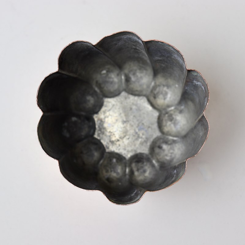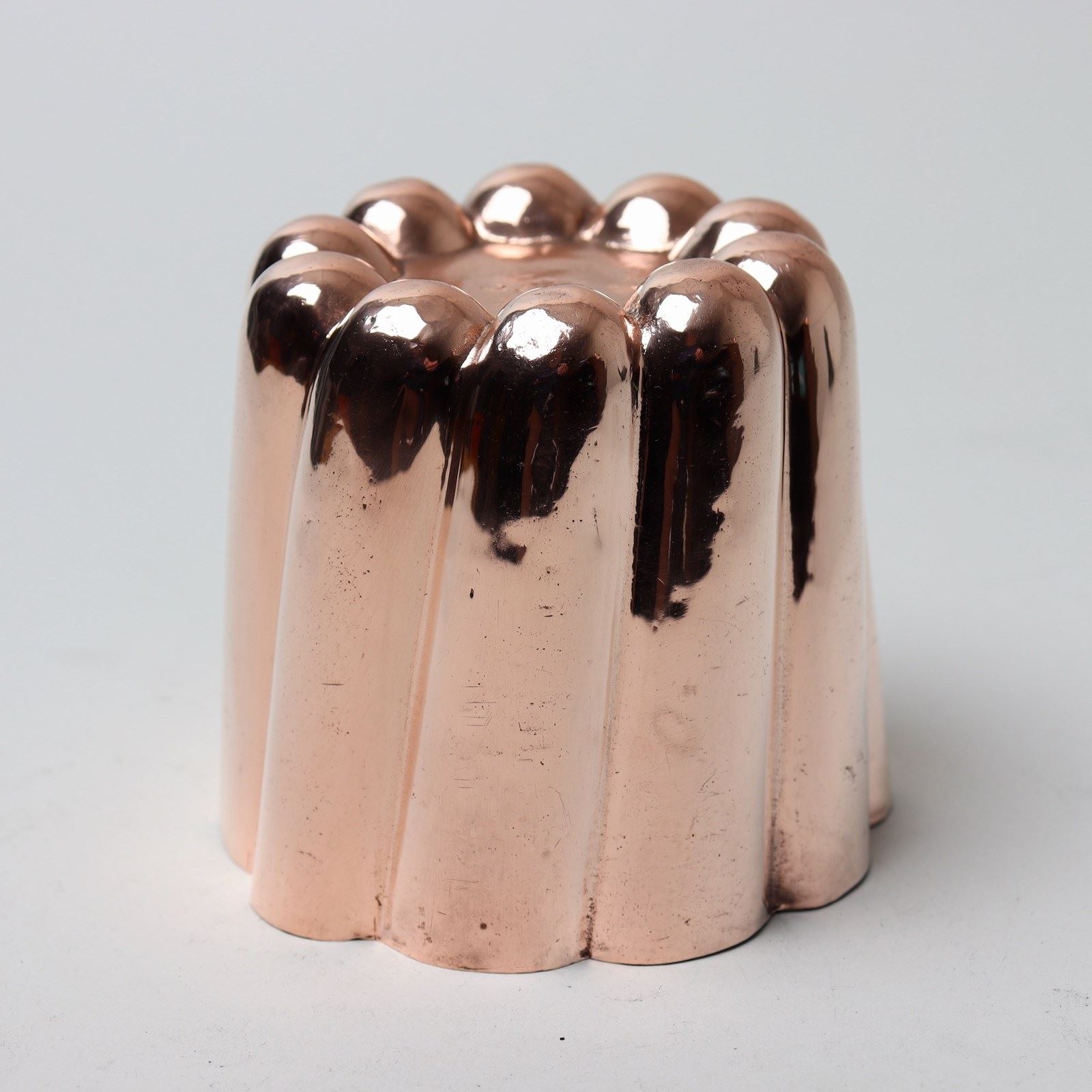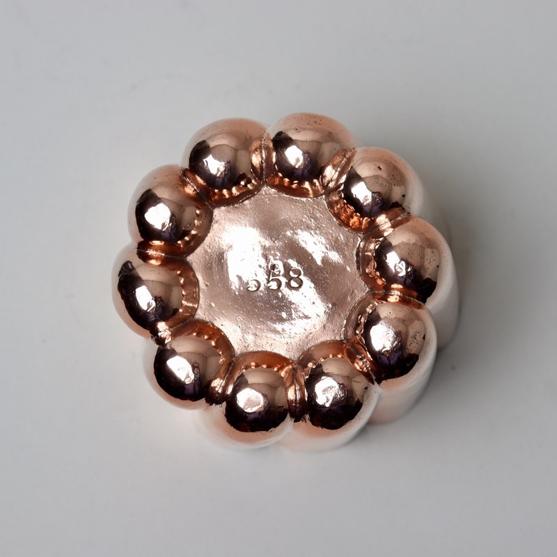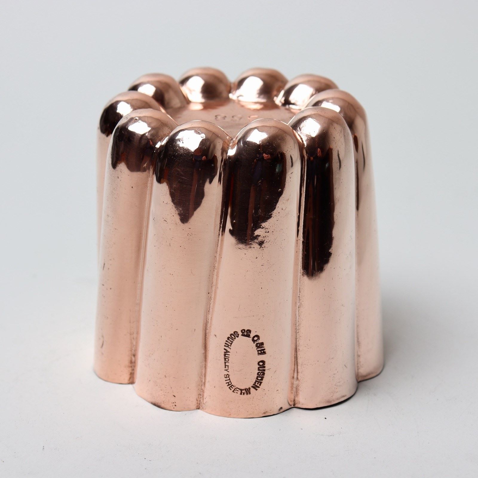 A mid sized, Victorian copper jelly mould. This is stamped “G & H CUSDEN 33 SOUTH AUDLEY STREET W.” and it dates from c.1880. The top is stamped with a pattern number “558” which corresponds with Benhams pattern number for this design so the mould was probably made by Benhams for retail by Cusdens. The simple design consists of ten dome topped, wrythen columns. The mould is in very good condition and the tinning, to the interior, is slightly worn but still usable.
