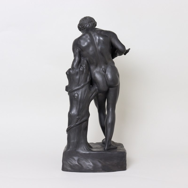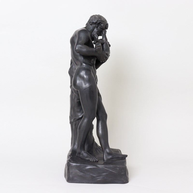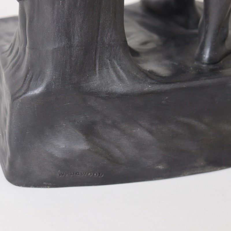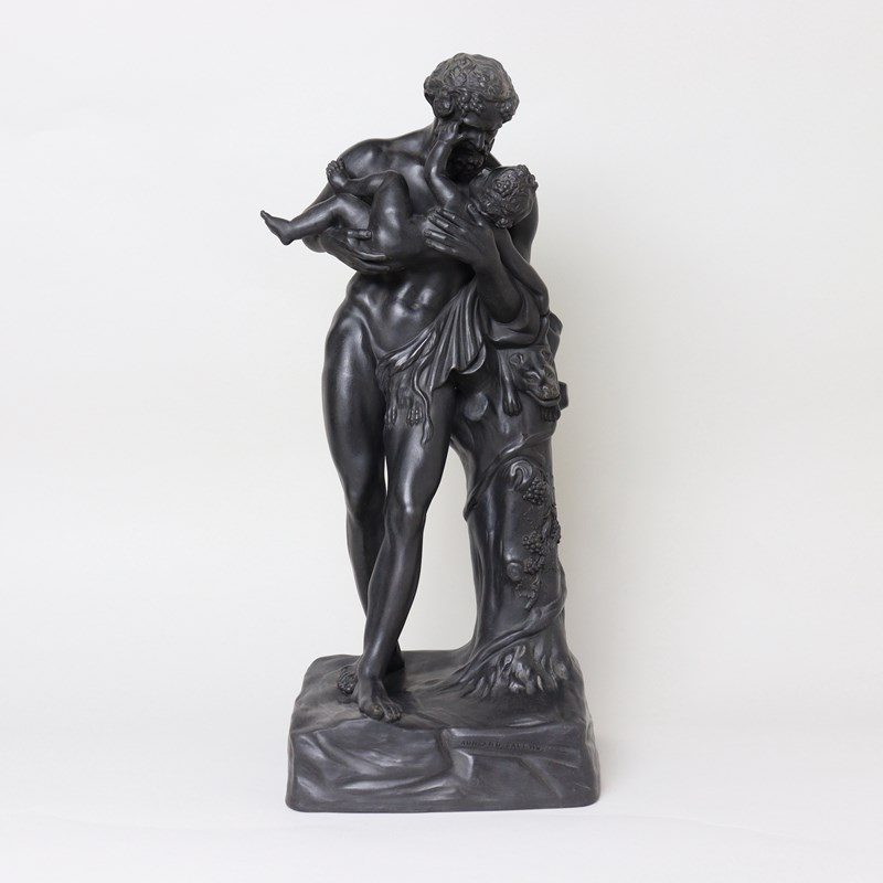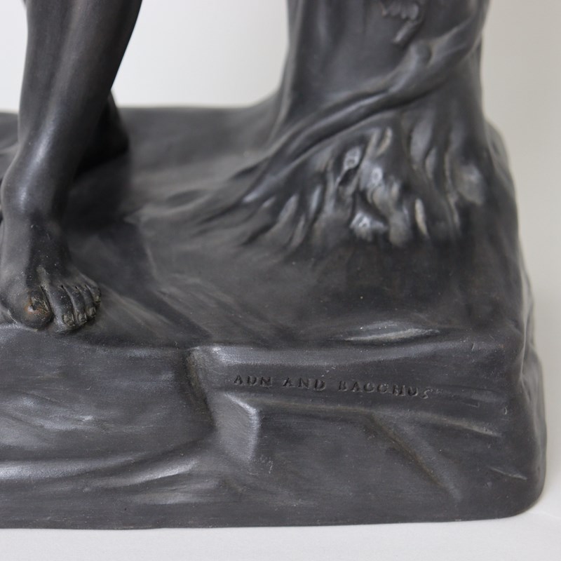 A fine and large, 19th century, Wedgwood black basalt figure of Bacchus and the Faun. This is marked “WEDGWOOD” and it dates from c.1860. It is also impressed with the name of the figure “FAUN AND BACCHUS” but the F has not been properly impressed. The form of the figure is quite exceptional, with superb attention to detail, showing the rippling muscles of Bacchus’s body and fine details to the facial features and hair of both characters.