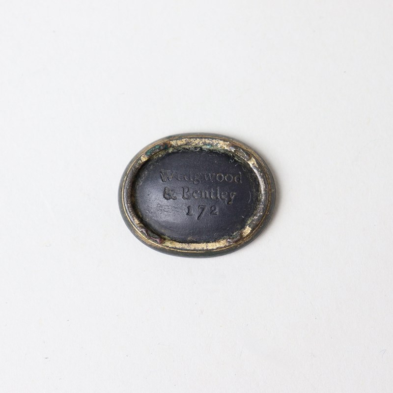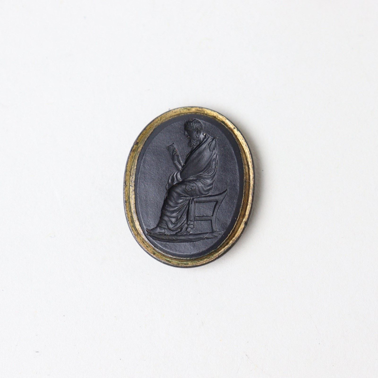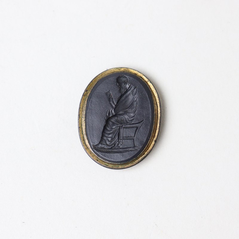 Wedgwood and Bentley, black basalt intaglio impressed with a male figure, in a toga, seated and reading. Marked “Wedgwood & Bentley” with a catalogue number “172”. This is set in a gilt metal rim. Date c.1775. Perfect condition.