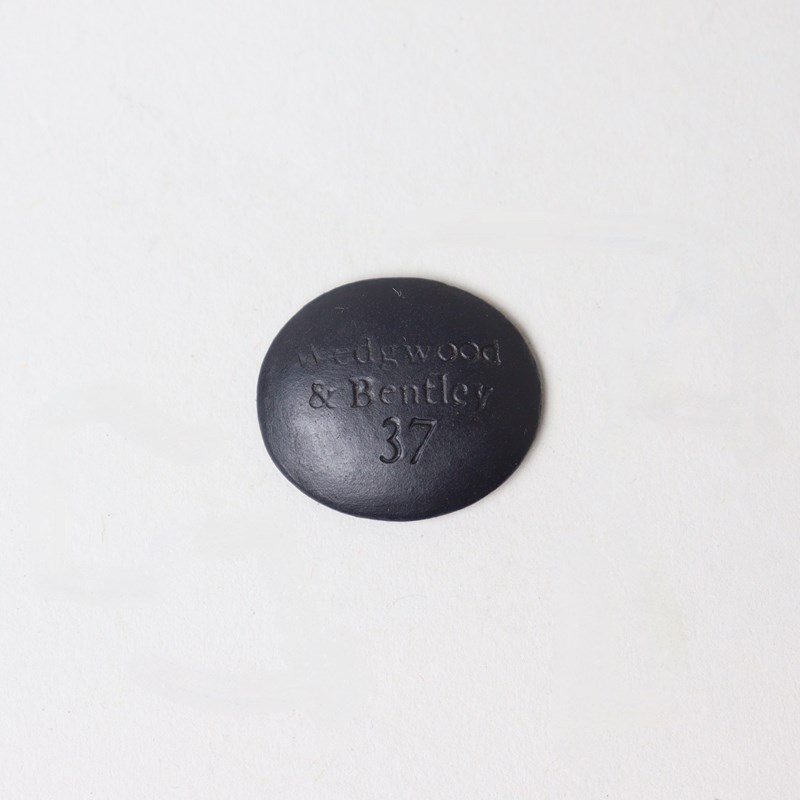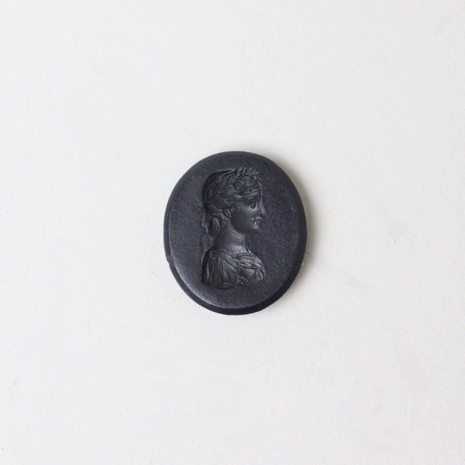 Wedgwood and Bentley, black basalt intaglio impressed with a female head. Marked “Wedgwood & Bentley” with a catalogue number “37”. Date c.1775. Tiny chip to left hand side of head.