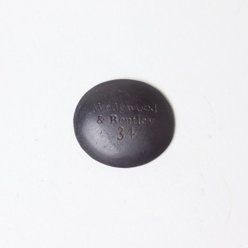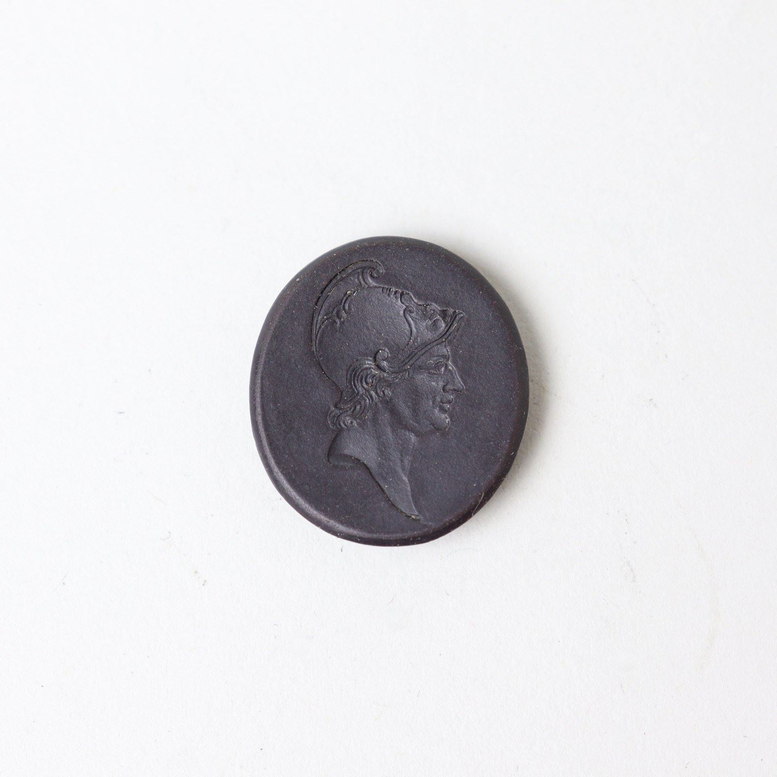 Wedgwood and Bentley, black basalt intaglio impressed with a male head wearing a Roman helmet. Marked “Wedgwood & Bentley” with a catalogue number “34”. Date c.1775. Perfect condition.