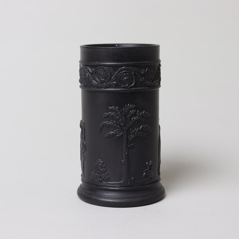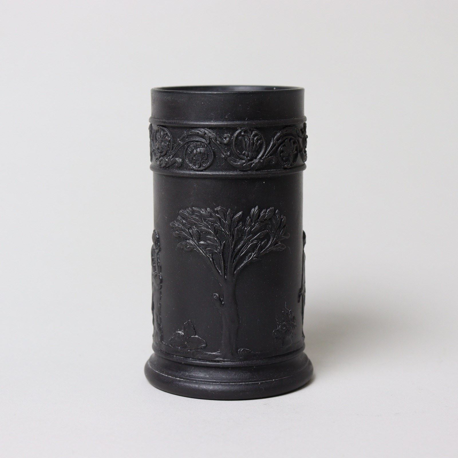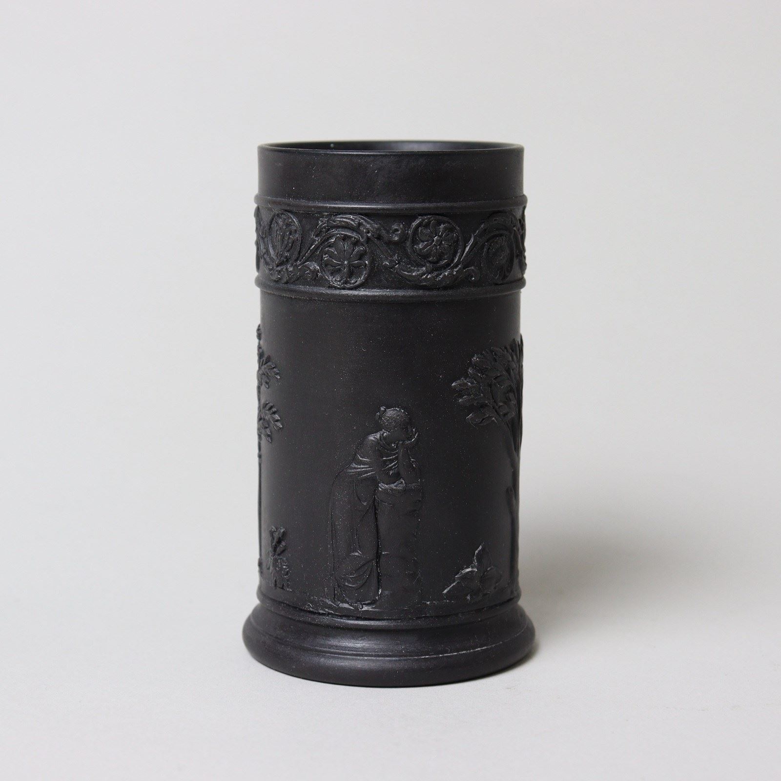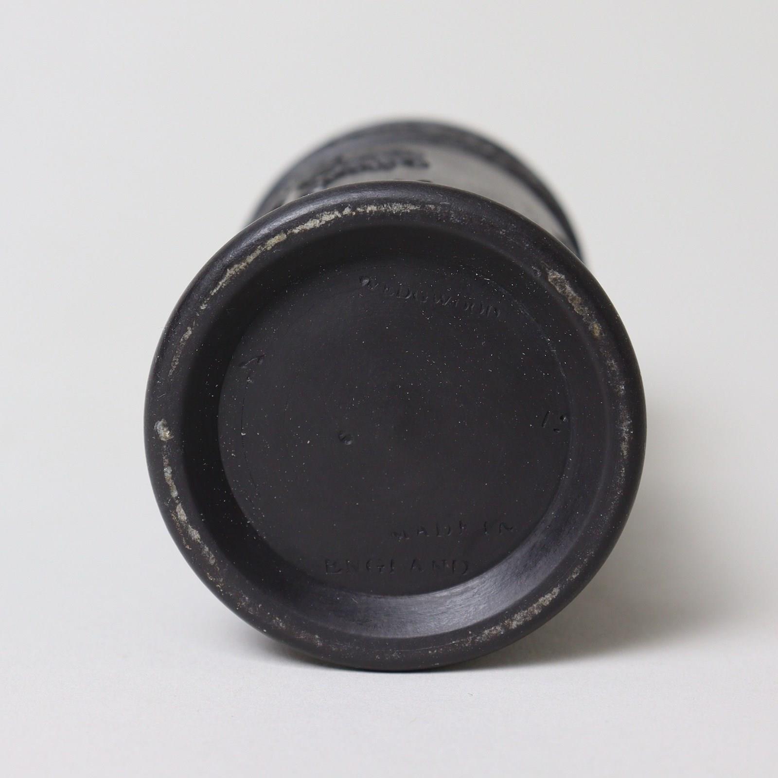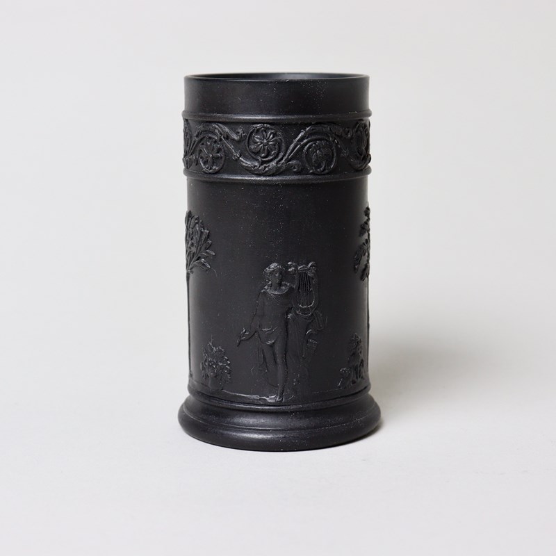 A small, Wedgwood, black basalt spill vase. This is marked ”WEDGWOOD MADE IN ENGLAND” and it dates from c.1920. It is also impressed with a number ”4” which relates to the height in inches. It is decorated, in relief, with Apollo and one of the Muses standing between trees and foliage. To the rim is a border of scrolls and flowers. The reliefs are all good quality and the vase is in excellent condition.