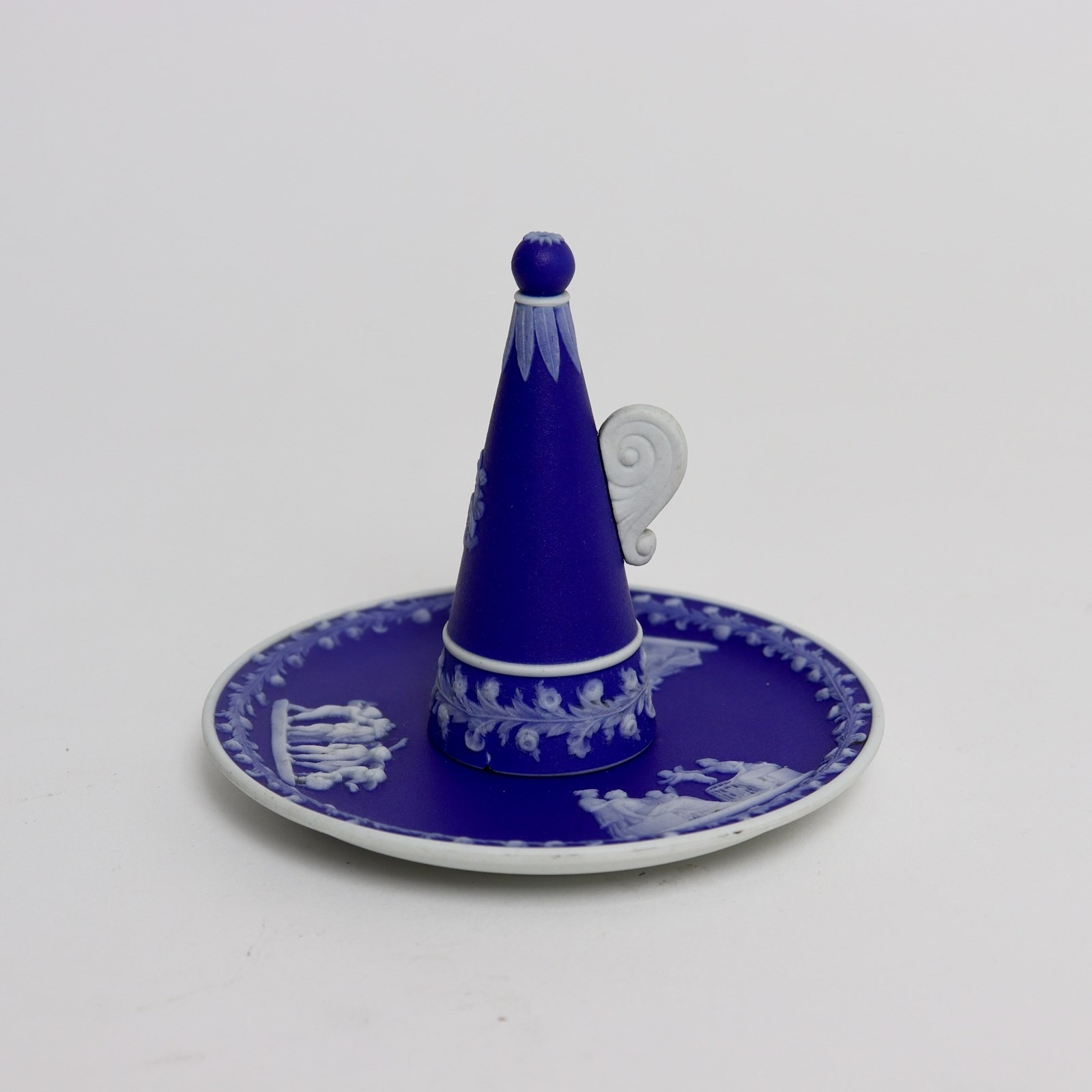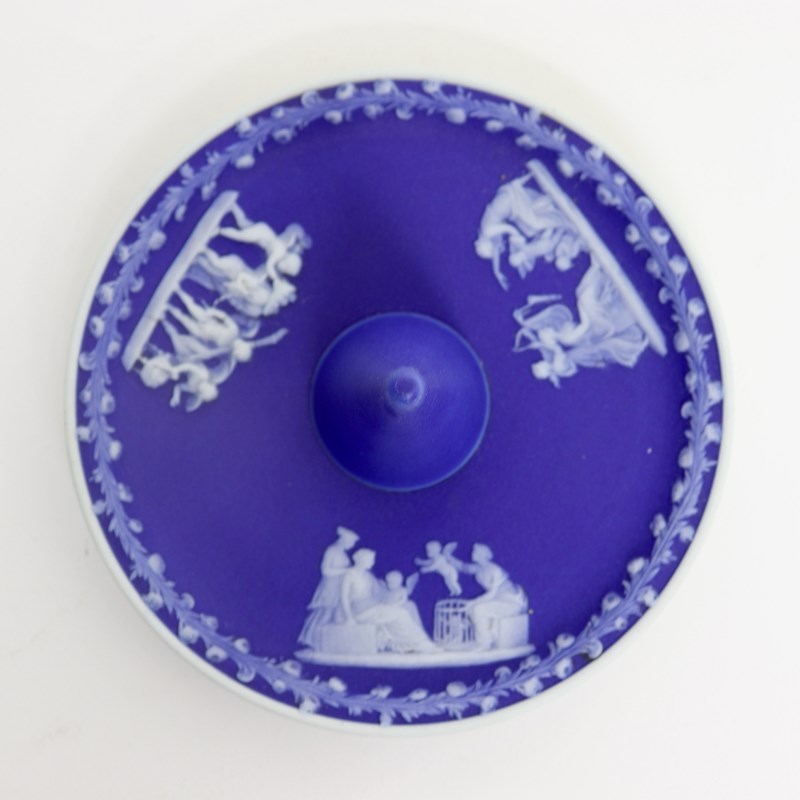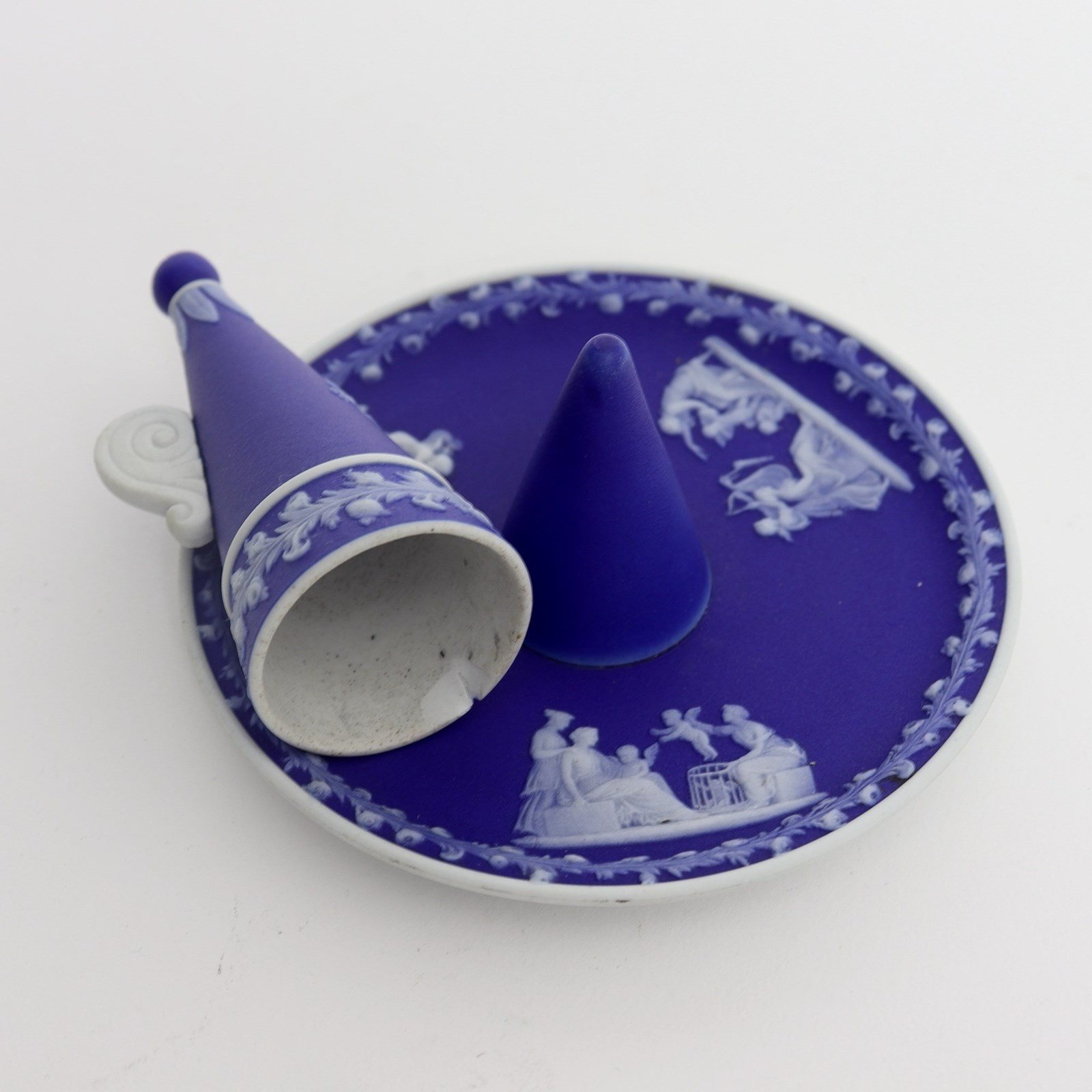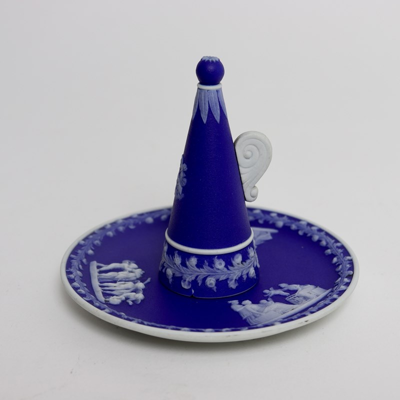 A Wedgwood, dark blue jasper dip, candle snuffer and stand. This is marked “WEDGWOOD” and it is also impressed with the letter “O”, which would be the workman’s mark, and a number ”2”. The stand is decorated, in white relief, with three different classical subjects surrounded by a narrow border of convolvulus and the snuffer has the same border design with a single, very small relief showing one of the Gods riding a chariot. All of the reliefs are very good quality and the jasper dip is a rich shade of blue. There is a large chip to the snuffer, which can be seen in the images but the stand is in good condition.
