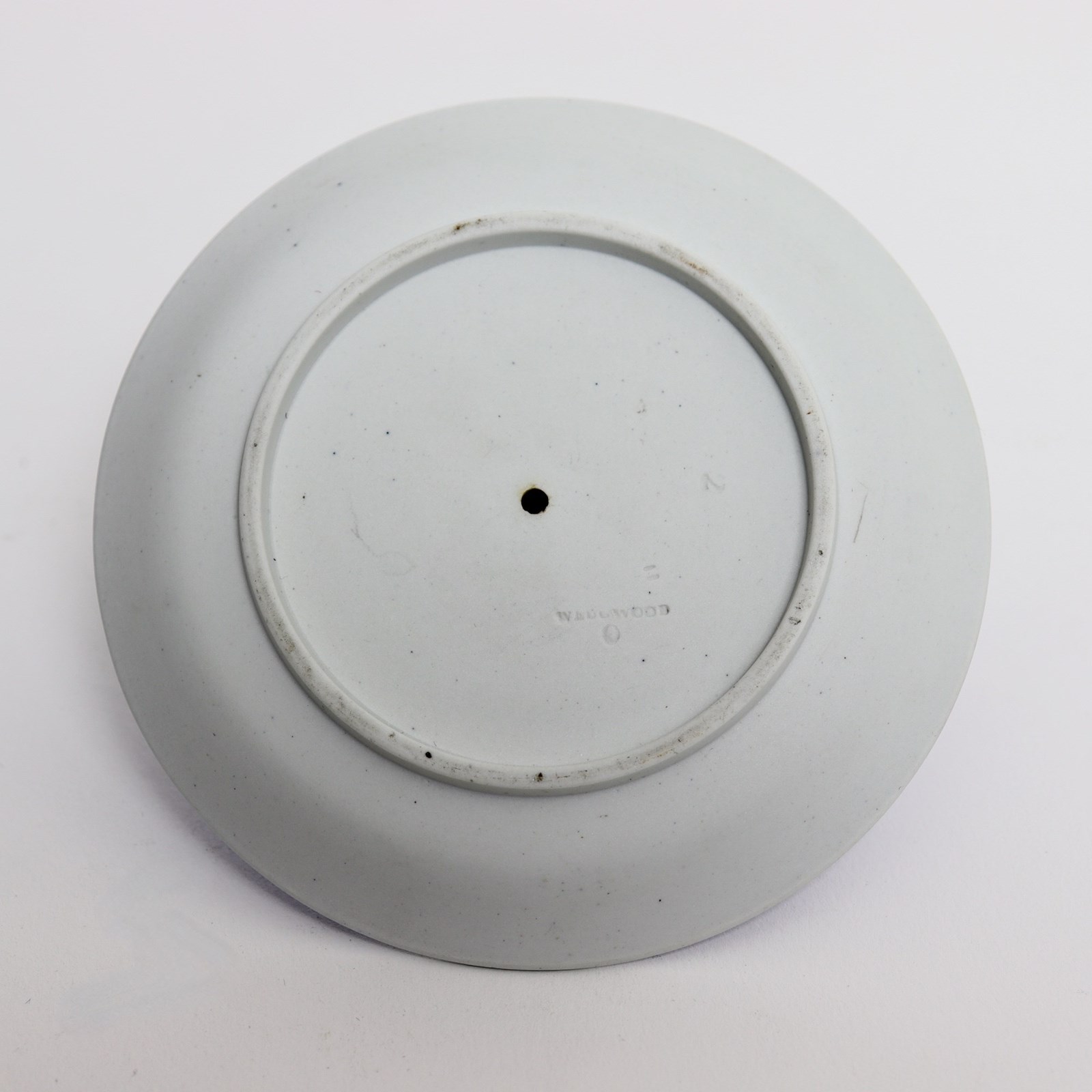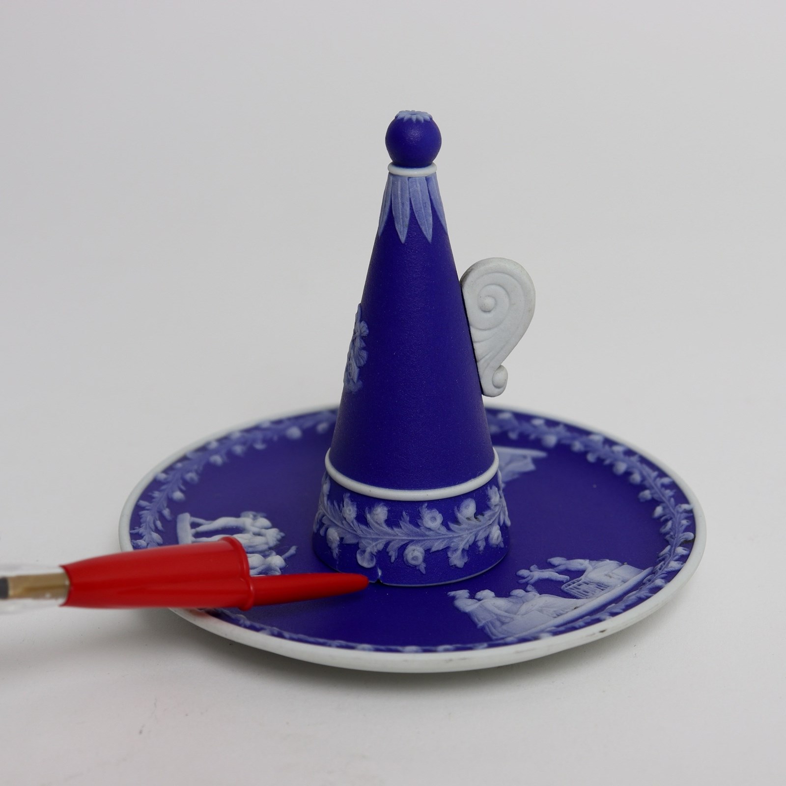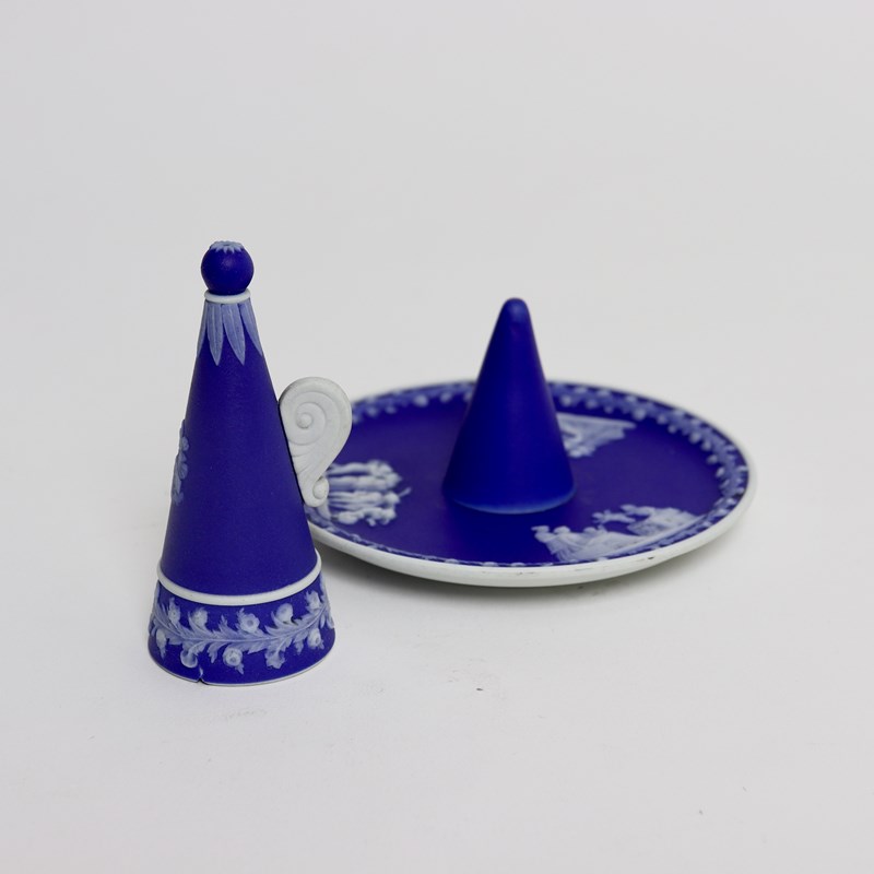 A Wedgwood, dark blue jasper dip, candle snuffer and stand. This is marked “WEDGWOOD” and it is also impressed with the letter “O”, which would be the workman’s mark, and a number ”2”. The stand is decorated, in white relief, with three different classical subjects surrounded by a narrow border of convolvulus and the snuffer has the same border design with a single, very small relief showing one of the Gods riding a chariot. All of the reliefs are very good quality and the jasper dip is a rich shade of blue. There is a large chip to the snuffer, which can be seen in the images but the stand is in good condition.