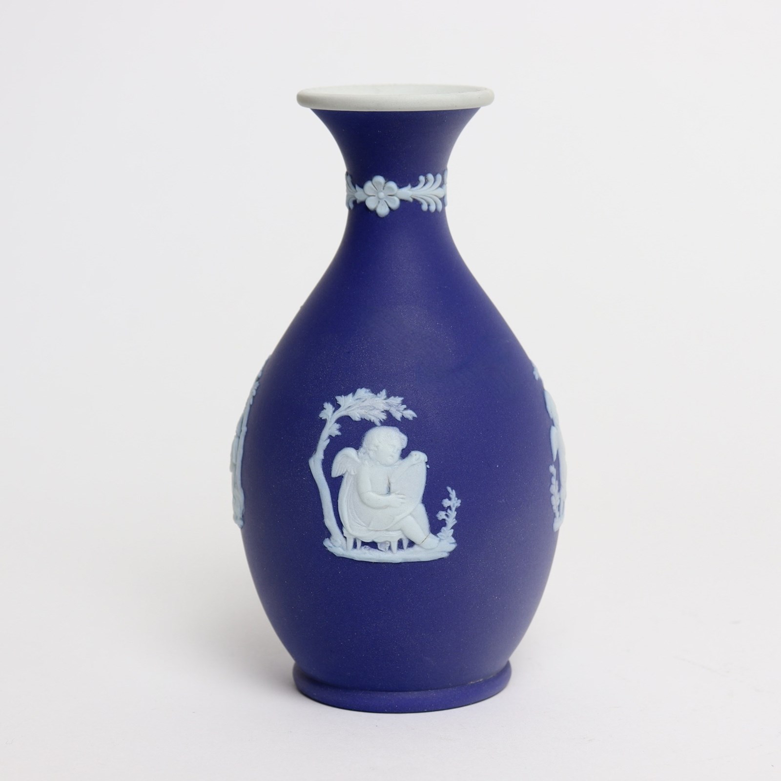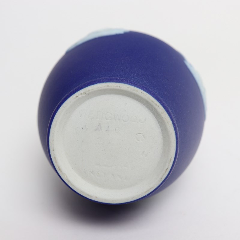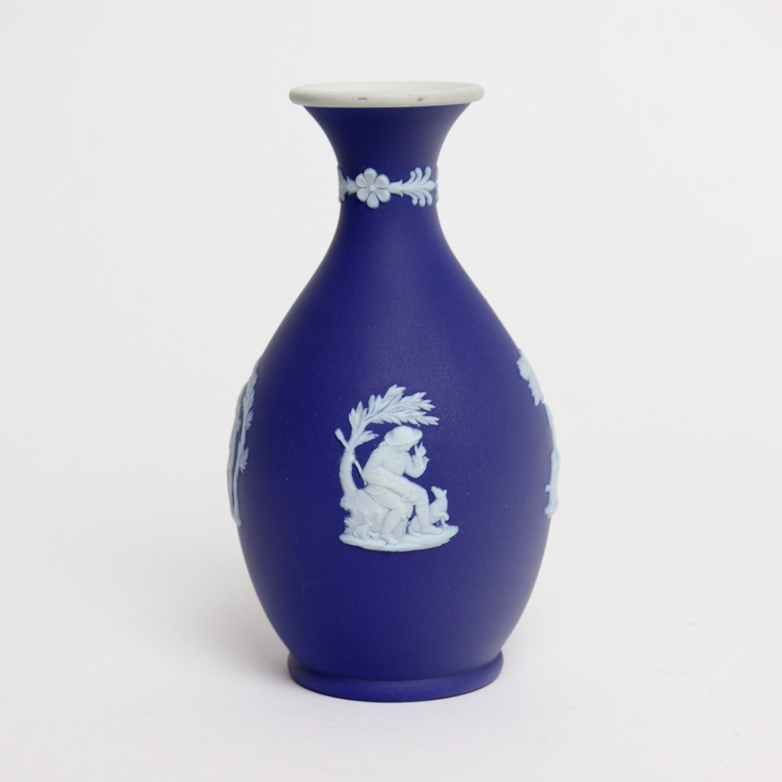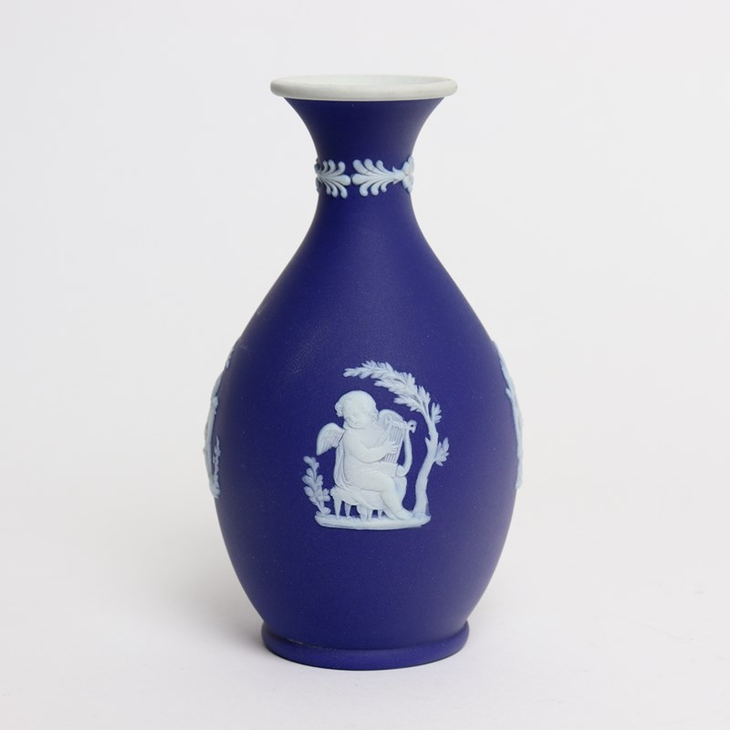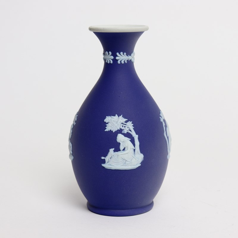A Wedgwood, dark blue jasper dip, bud vase. This is marked ”WEDGWOOD MADE IN ENGLAND” and it dates from c.1920. It is also impressed with a letter D. It is decorated, in white relief, with four different subjects including cherubs or rural figures. To the neck of the vase are small flowers and leaves. The reliefs are all good quality and the jasper dip is a good, rich shade of blue. The vase in excellent condition.