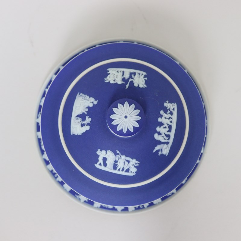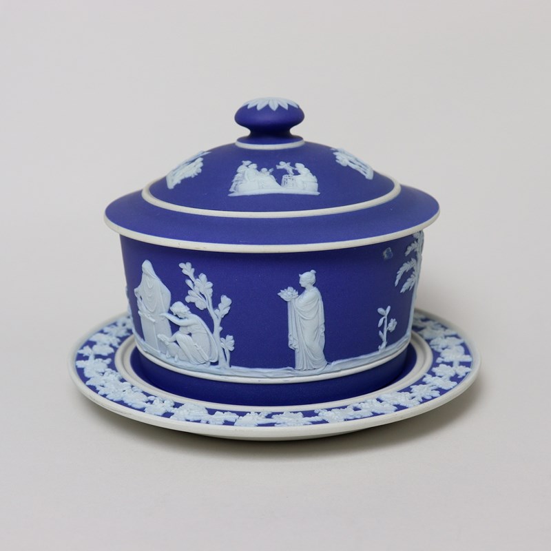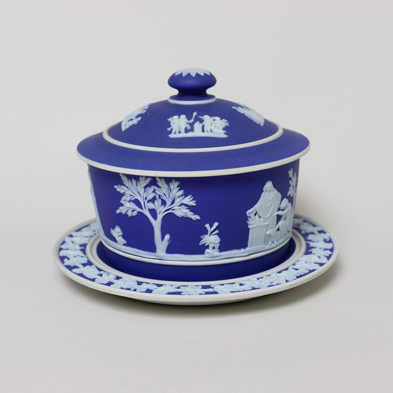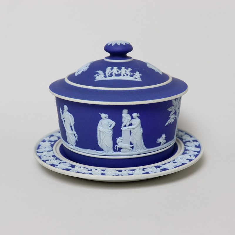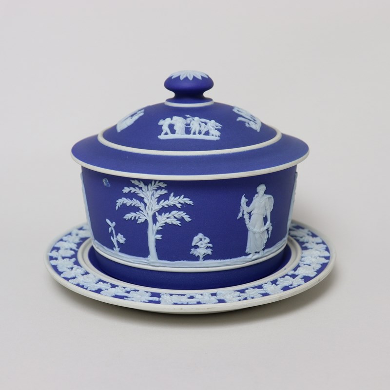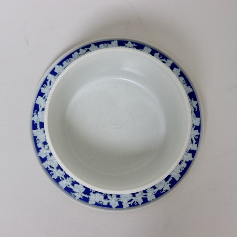 A late nineteenth century, Wedgwood, dark blue jasper dip butter tub, cover and stand. Both the tub and stand are marked “WEDGWOOD ETRURIA ENGLAND” and it dates from c.1895. There are also some small, impressed workman’s marks and the pot is impressed with the number ”4” which relates to the size in inches. The tub is decorated, in white relief, with a continuous band of classical figures, trees and foliage, the lid has four different classical scenes all including cherubs or putti, and the stand has a border of grapes and vines. All the reliefs are good quality and the jasper dip is a very deep, rich shade of blue. All three parts are in excellent condition.