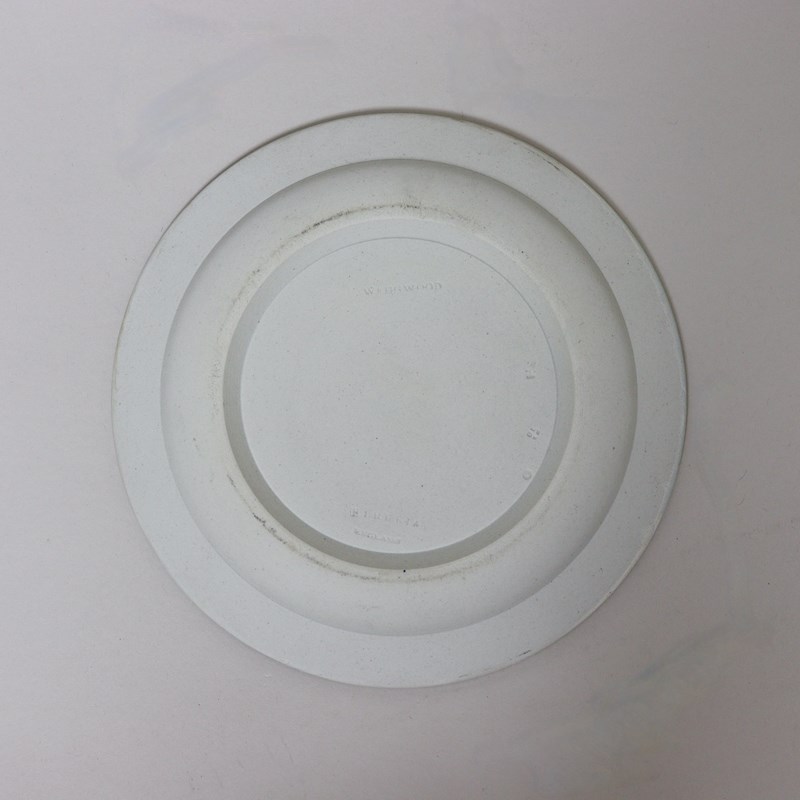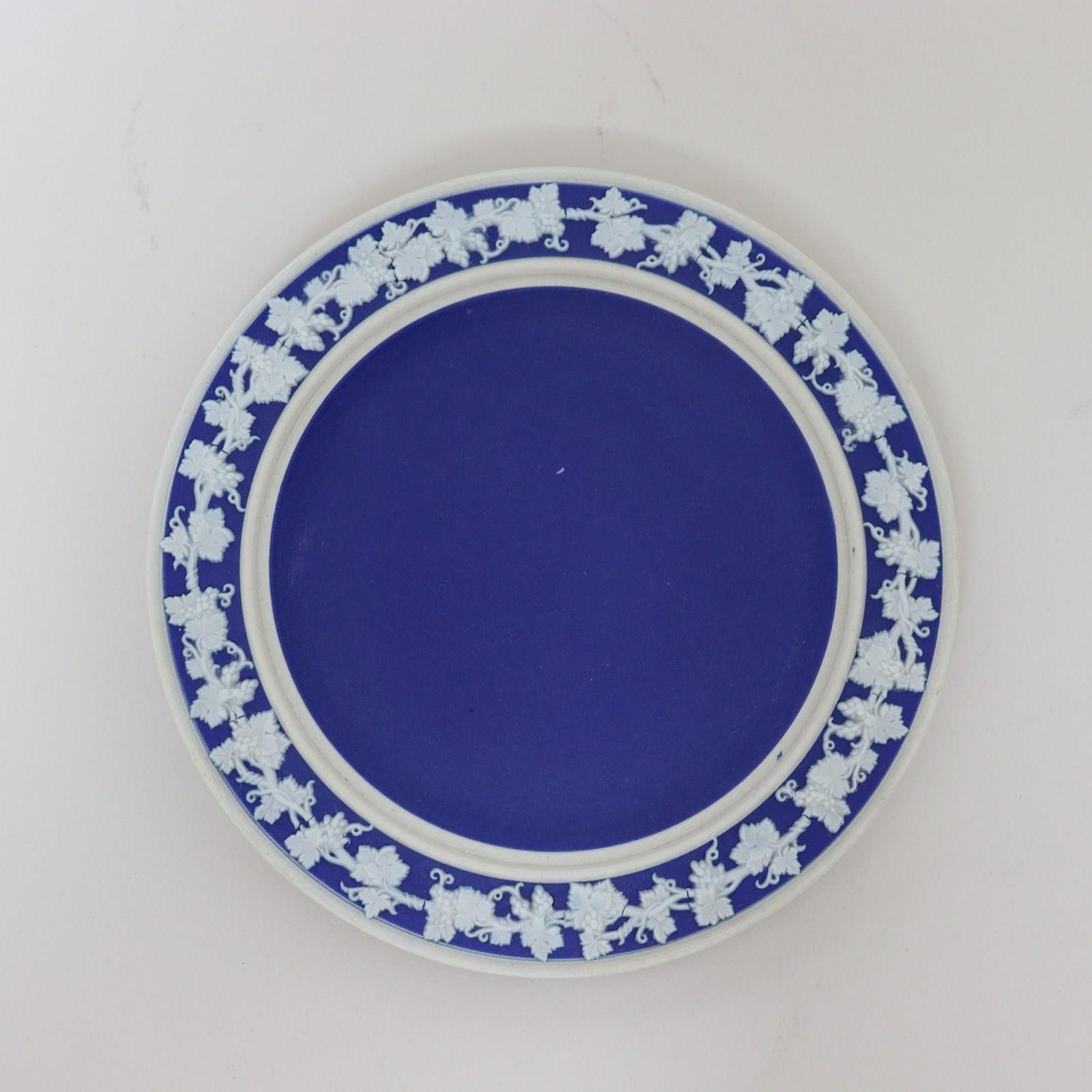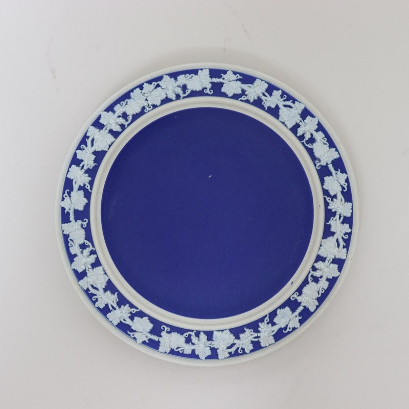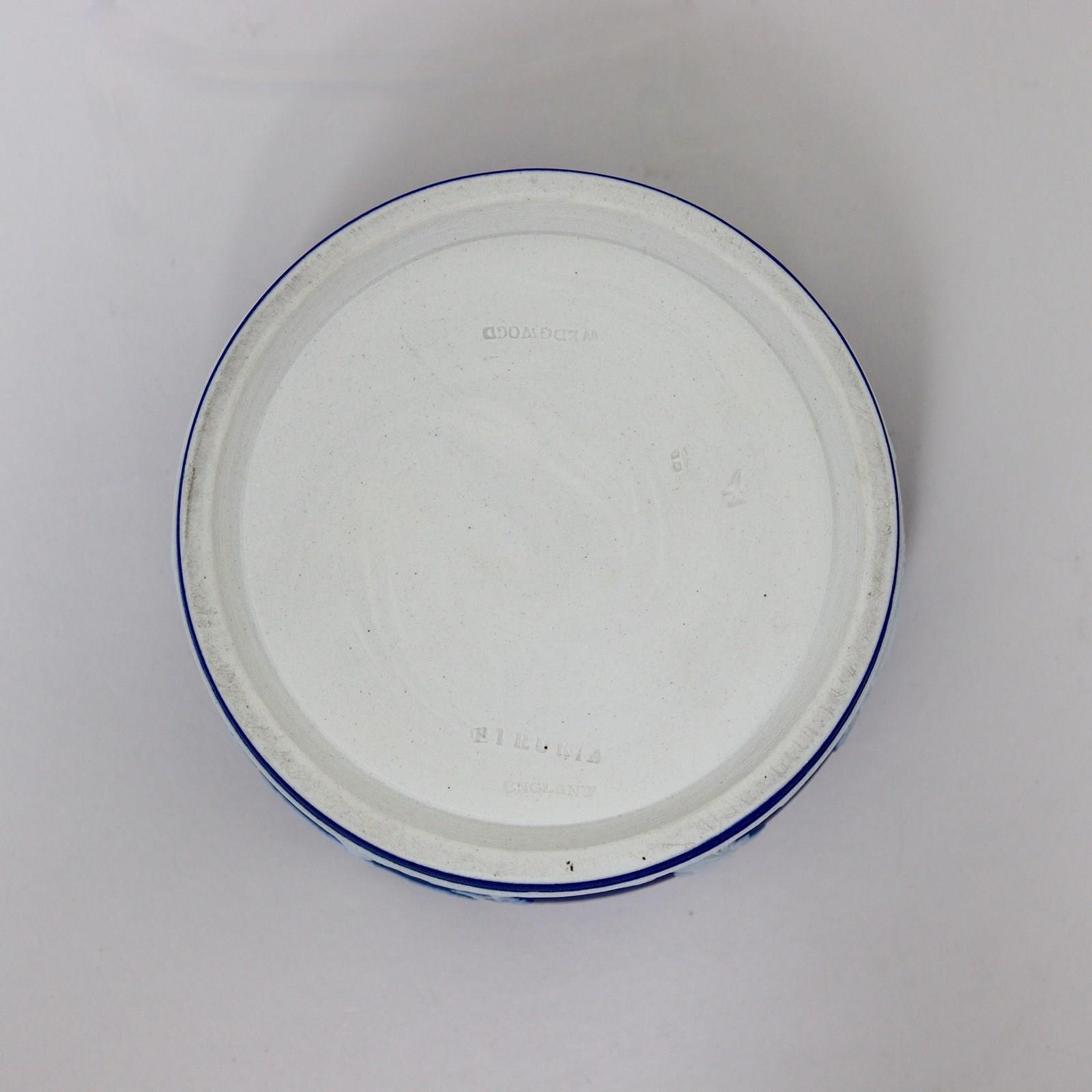 A late nineteenth century, Wedgwood, dark blue jasper dip butter tub, cover and stand. Both the tub and stand are marked “WEDGWOOD ETRURIA ENGLAND” and it dates from c.1895. There are also some small, impressed workman’s marks and the pot is impressed with the number ”4” which relates to the size in inches. The tub is decorated, in white relief, with a continuous band of classical figures, trees and foliage, the lid has four different classical scenes all including cherubs or putti, and the stand has a border of grapes and vines. All the reliefs are good quality and the jasper dip is a very deep, rich shade of blue. All three parts are in excellent condition.