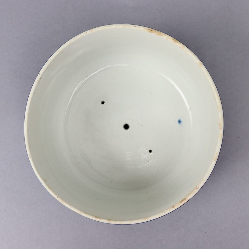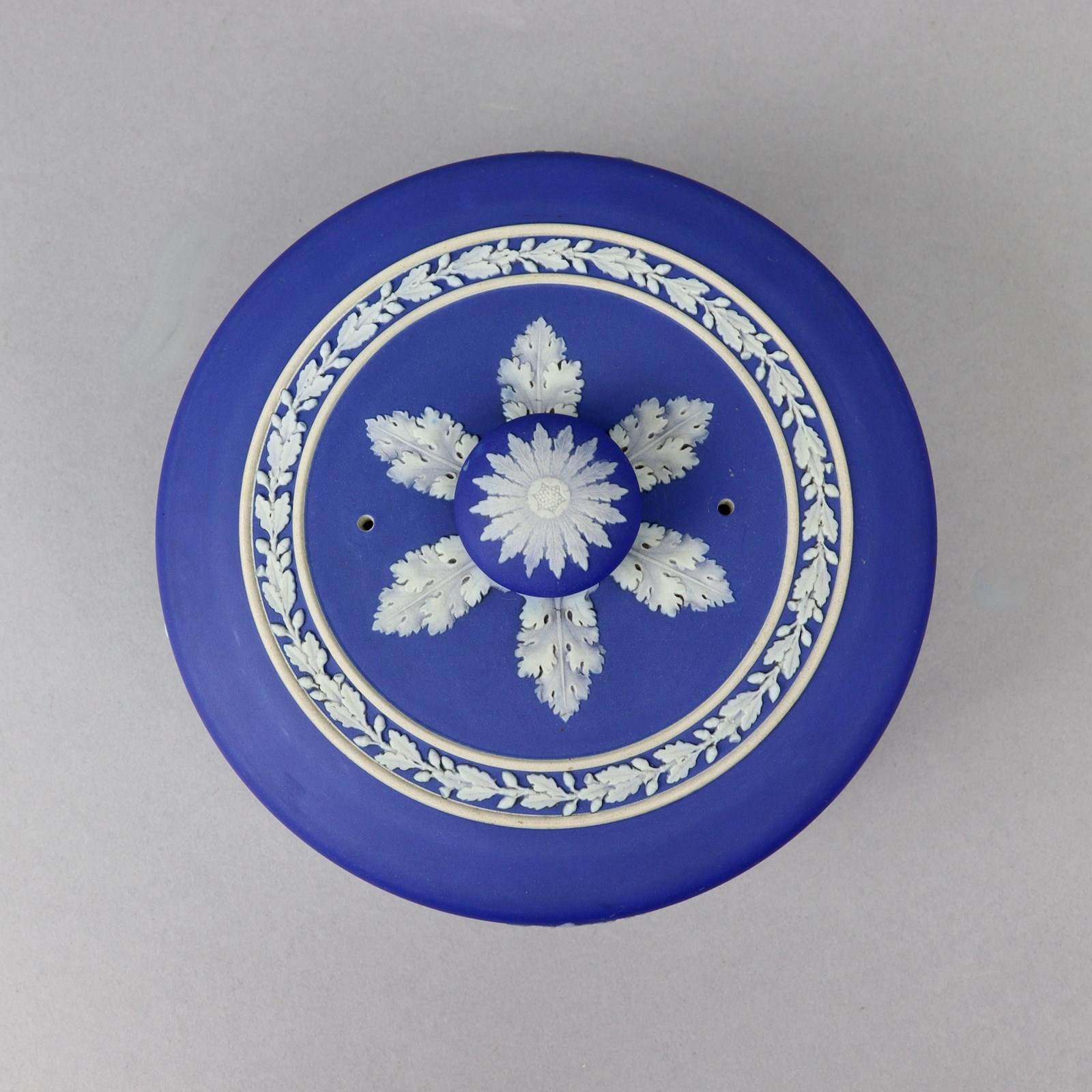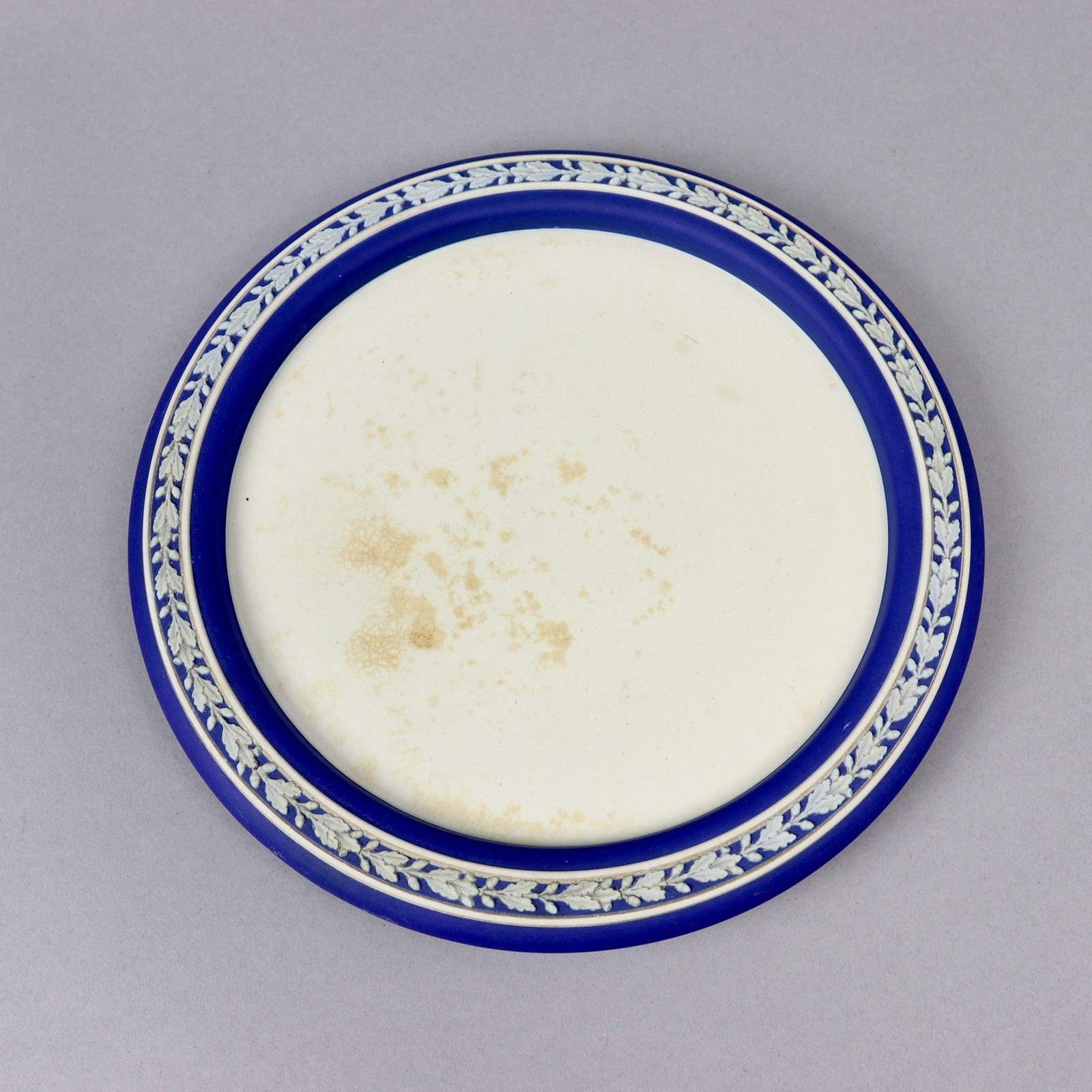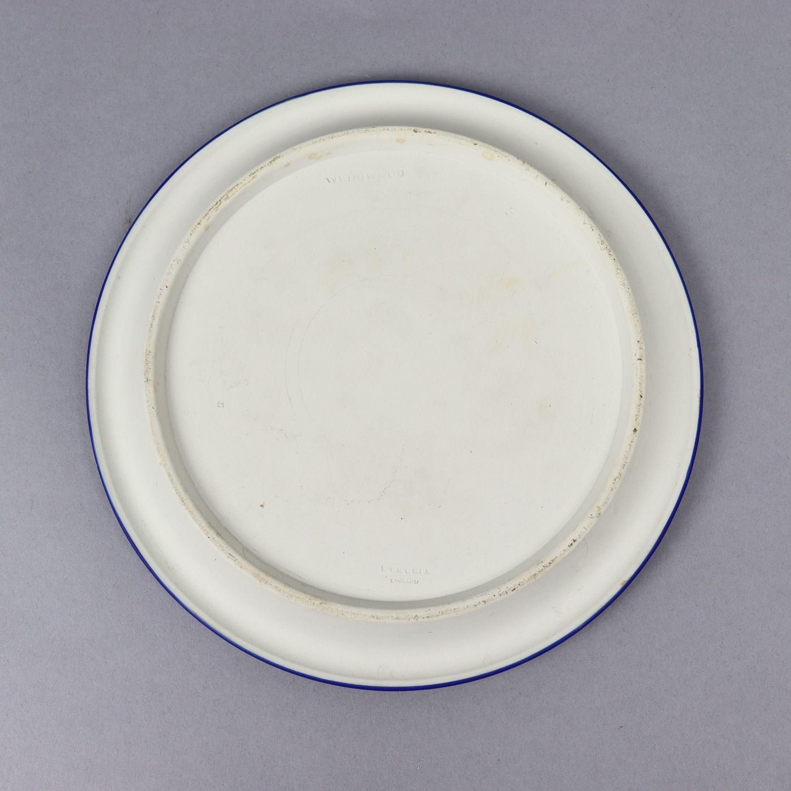 A Wedgwood, dark blue jasper dip cheese plate and dome. This is marked “WEDGWOOD ETRURIA ENGLAND” and it dates from c.1895. This marks was only used for about five years around this date. It is also impressed with a letter ‘H’ which could be a workman’s mark. The base is decorated, in white relief, with a border of acorns and oak leaves and the dome has a continuous band of classical subjects. To the top is an acorn and oak leaf border matching the base and there are acanthus leaves around the handle. There is slight staining to the plate, from use, but other than that both parts are in excellent condition.
