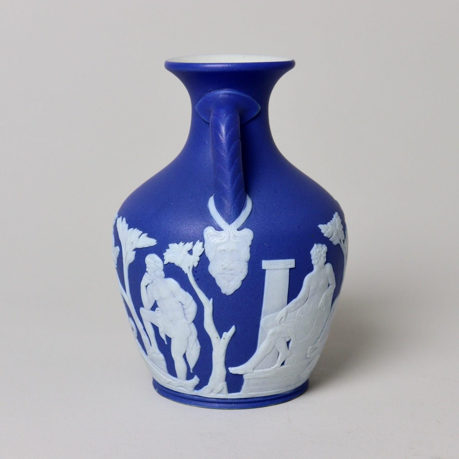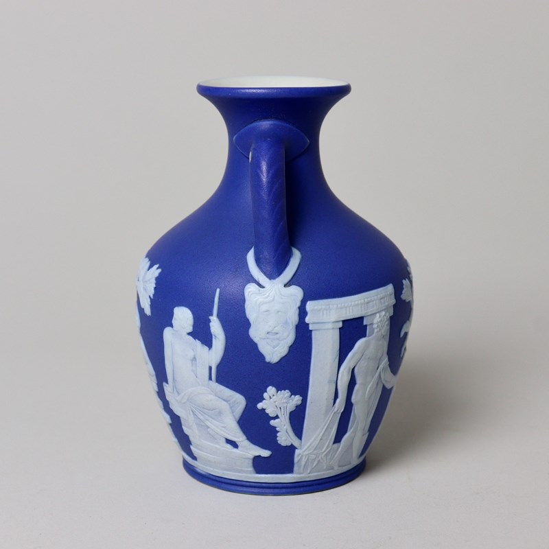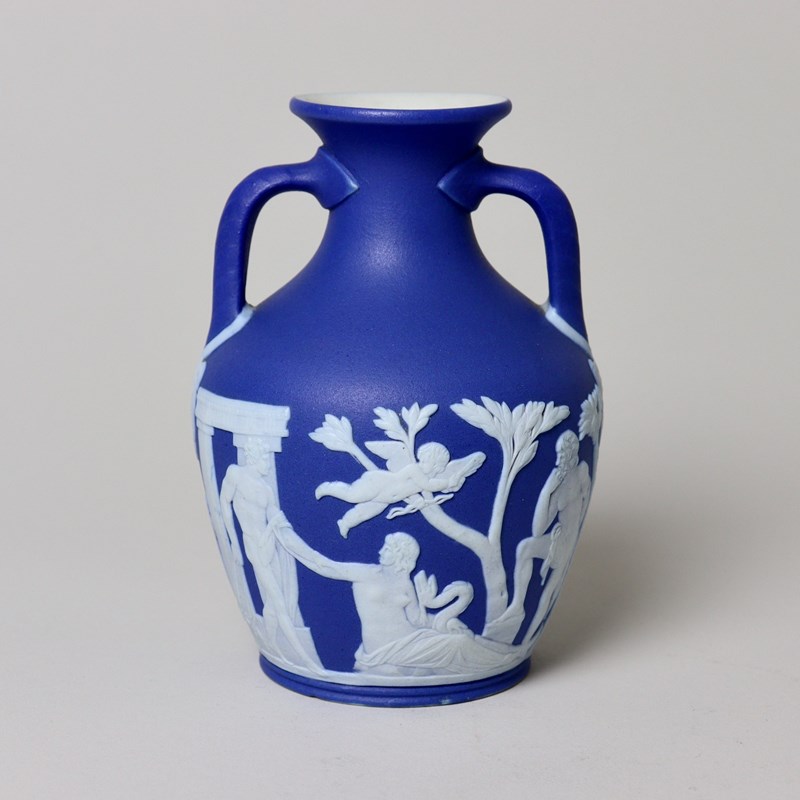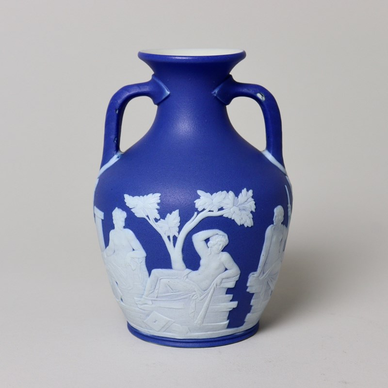 A Wedgwood, dark blue jasper dip copy of the Portland Vase. This is marked “WEDGWOOD” and it dates from c.1840. There is also a small, impressed workman’s mark. Wedgwood produced copies of the Portland vase in many different colours and sizes ranging from miniatures to the full size, ten inch version. This example is quite small but it does have some slight flaws from the manufacture. Something has touched the handles during the firing and this has resulted in marks and glaze loss. This can be seen in the images. There is no damage since manufacture.The reliefs are good quality and the jasper dip is a rich shade of blue.