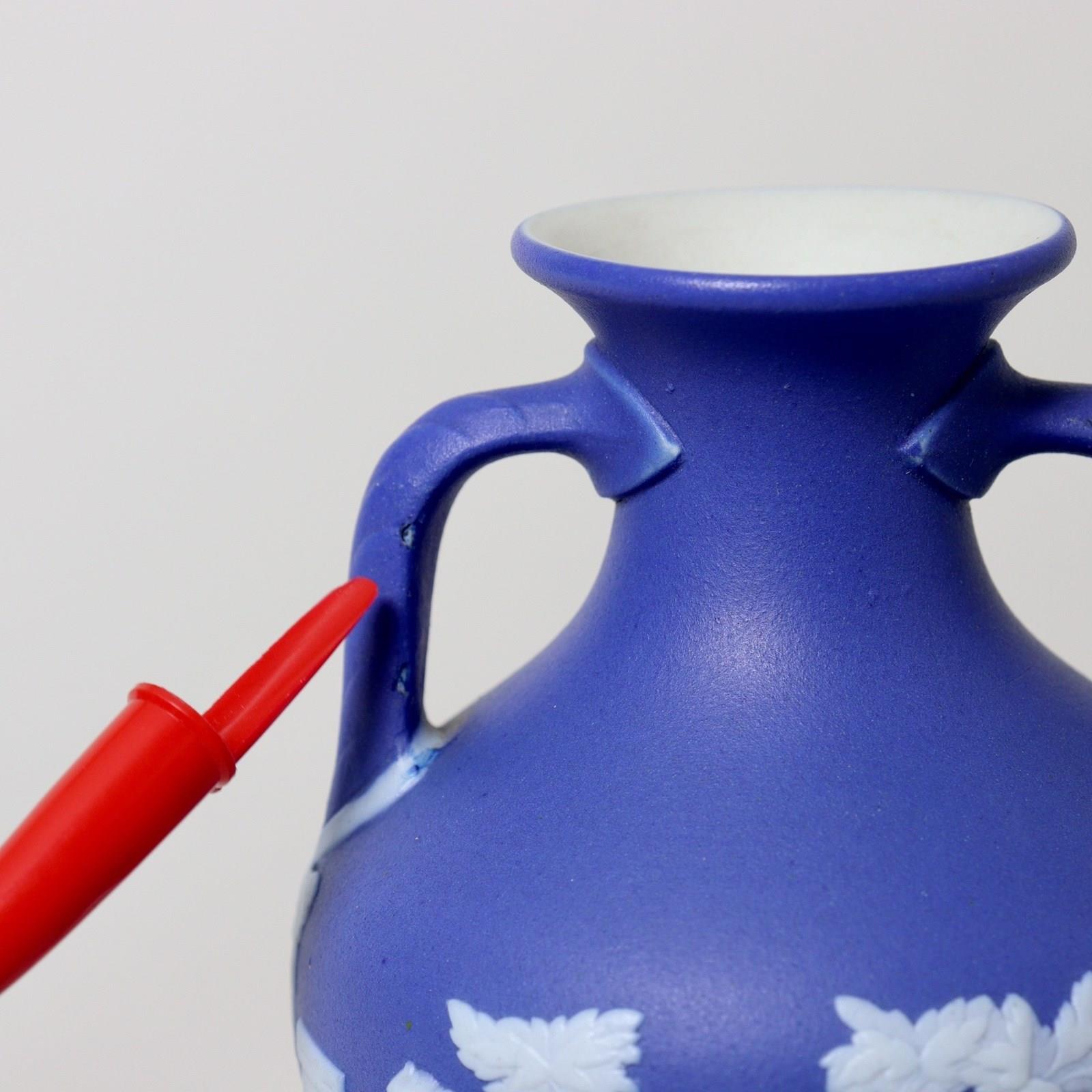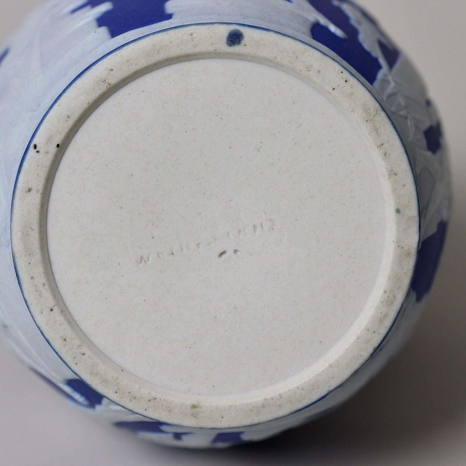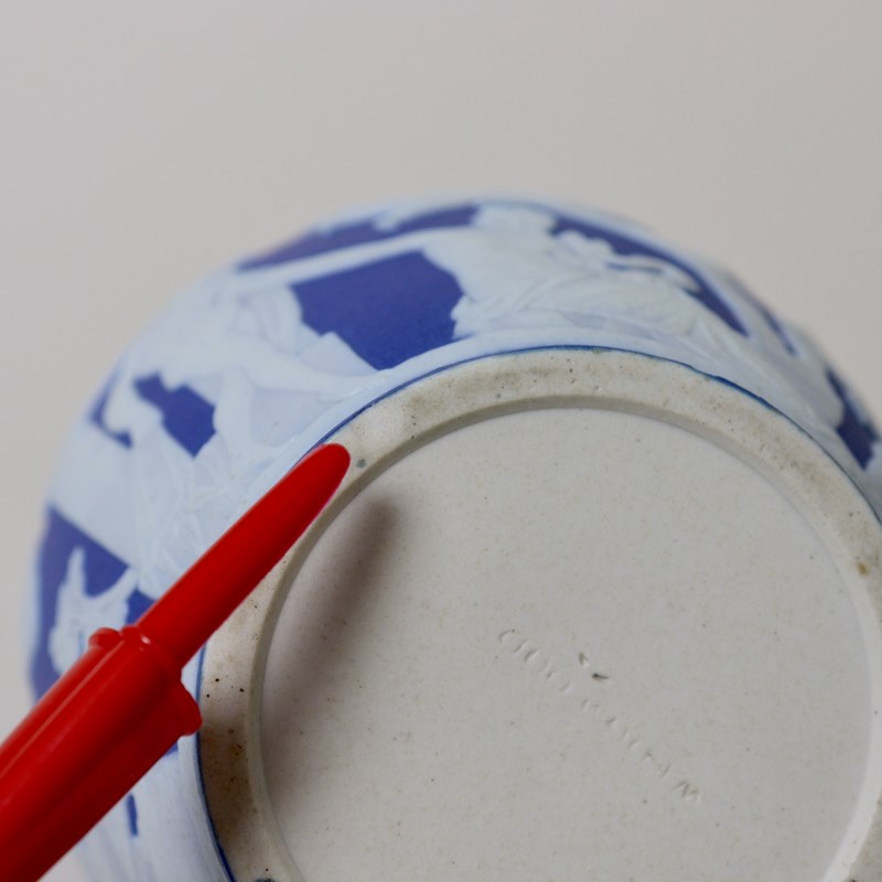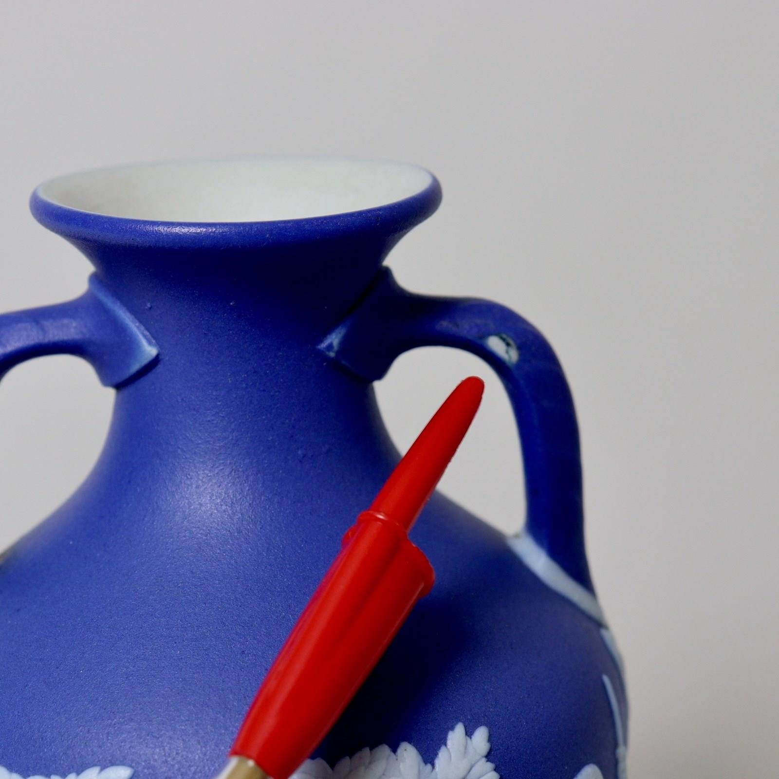 A Wedgwood, dark blue jasper dip copy of the Portland Vase. This is marked “WEDGWOOD” and it dates from c.1840. There is also a small, impressed workman’s mark. Wedgwood produced copies of the Portland vase in many different colours and sizes ranging from miniatures to the full size, ten inch version. This example is quite small but it does have some slight flaws from the manufacture. Something has touched the handles during the firing and this has resulted in marks and glaze loss. This can be seen in the images. There is no damage since manufacture.The reliefs are good quality and the jasper dip is a rich shade of blue.