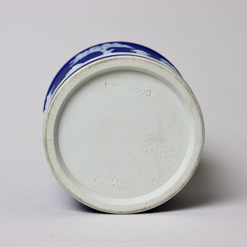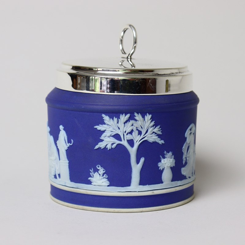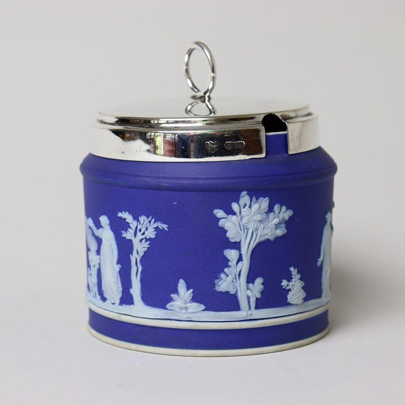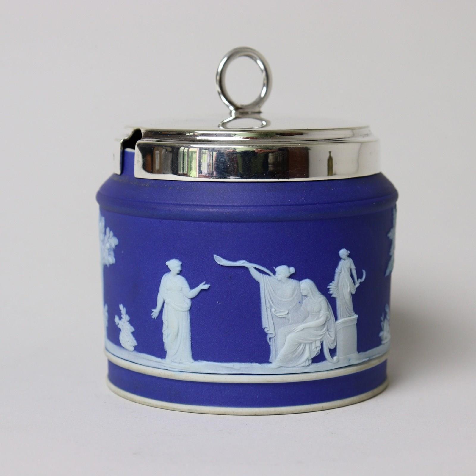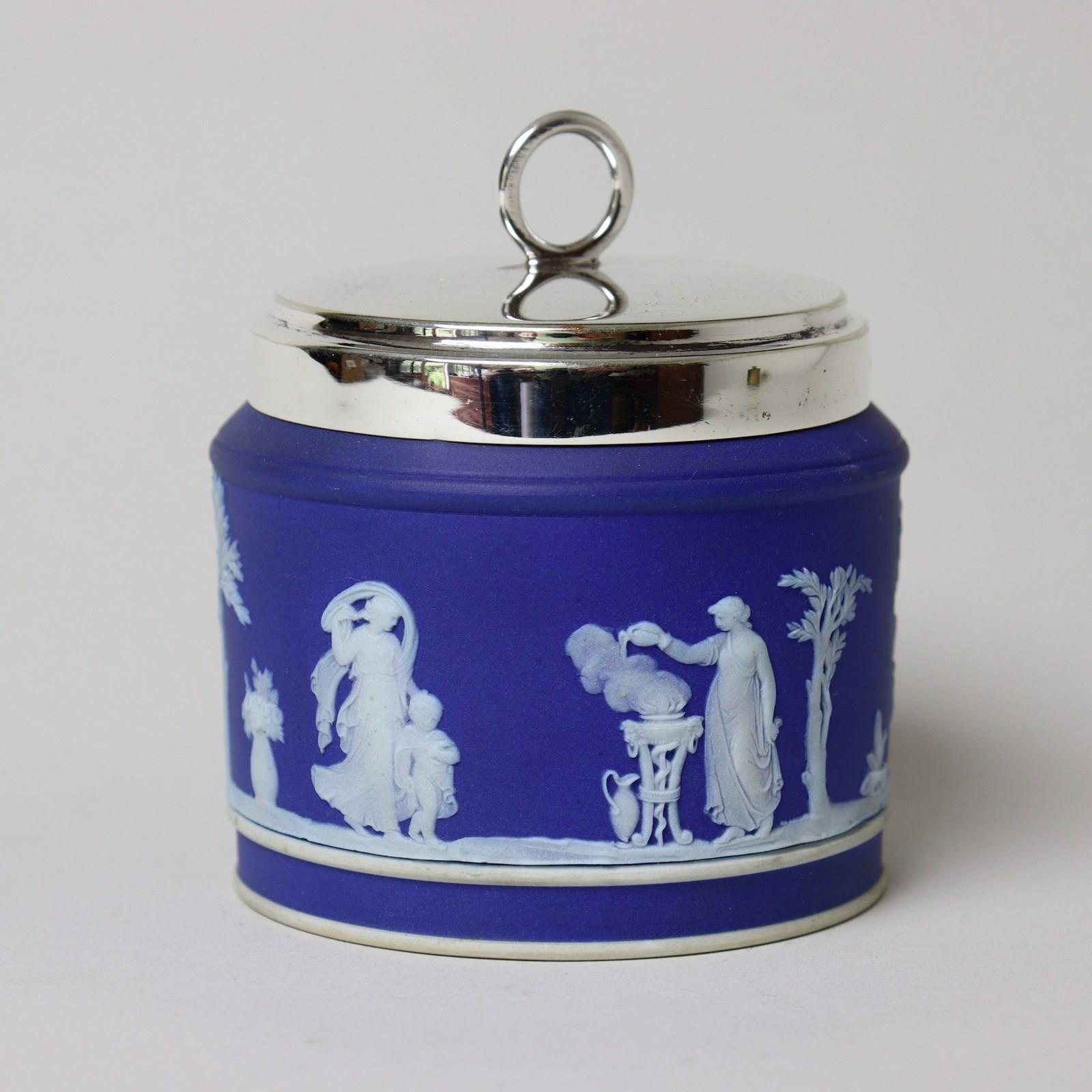 A Wedgwood, dark blue jasper dip preserve pot with a silver plated lid. This is marked “WEDGWOOD MADE IN ENGLAND” and it dates from c.1920. The lid is stamped “E.P.N.S”. The pot is decorated, in white relief, with a continuous band of classical maidens between trees and foliage. The reliefs are all good quality and the jasper dip is a rich shade of blue. The piece is in excellent condition.
