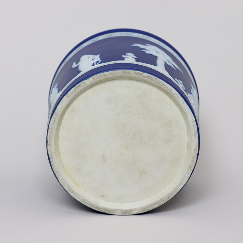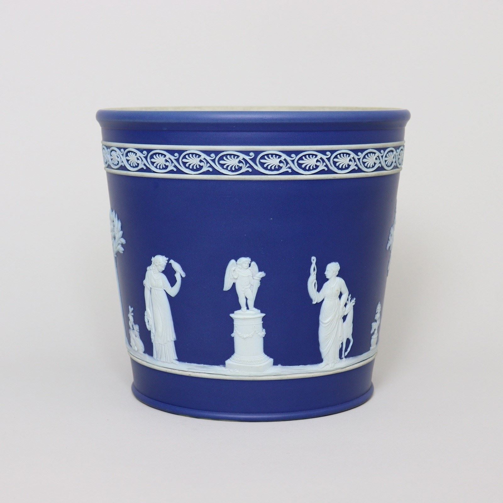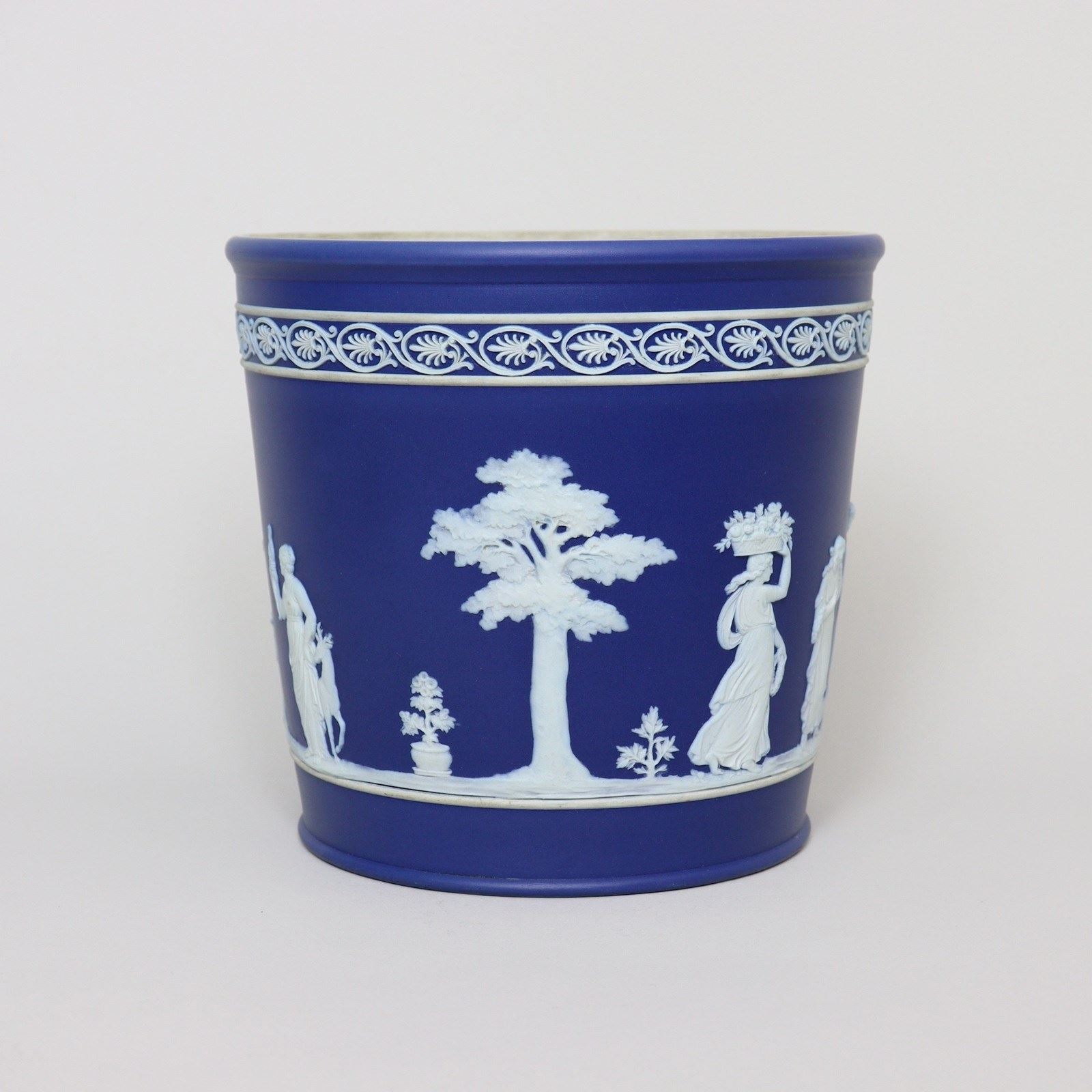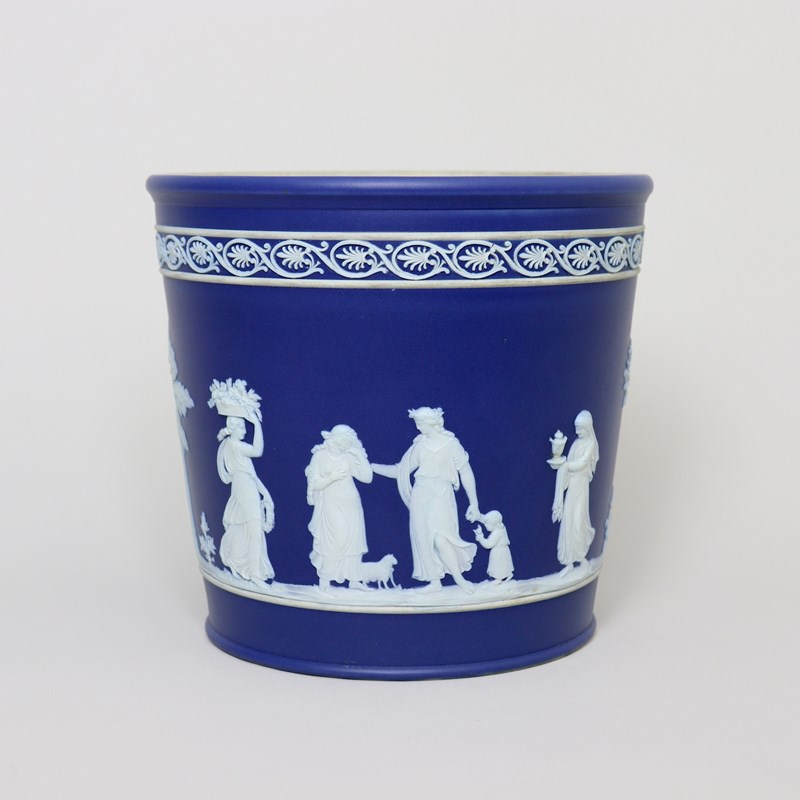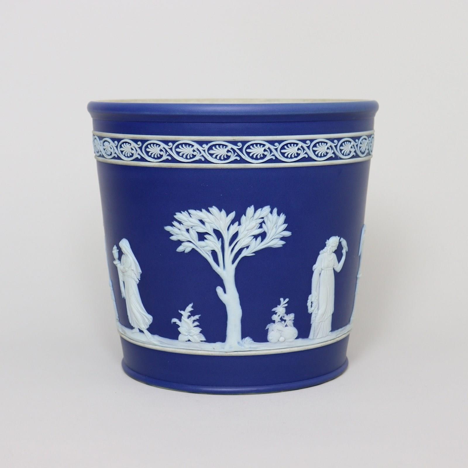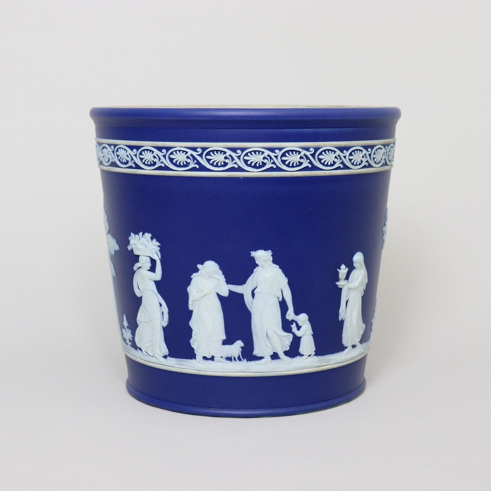 A Wedgwood, dark blue jasper dip, tapered jardiniere. This is marked ”WEDGWOOD ENGLAND” and it dates from c.1900. This is quite an unusual shape of jardiniere and this shape was generally produced only in the much smaller sizes. It is decorated, in white relief, with a band of classical maidens offering sacrifices and to the rim is an attractive, classical scroll border. The reliefs are good quality and the jasper dip is a rich shade of blue. There is staining to the interior of the jardiniere, from use, but there is no damage, it is in excellent condition.