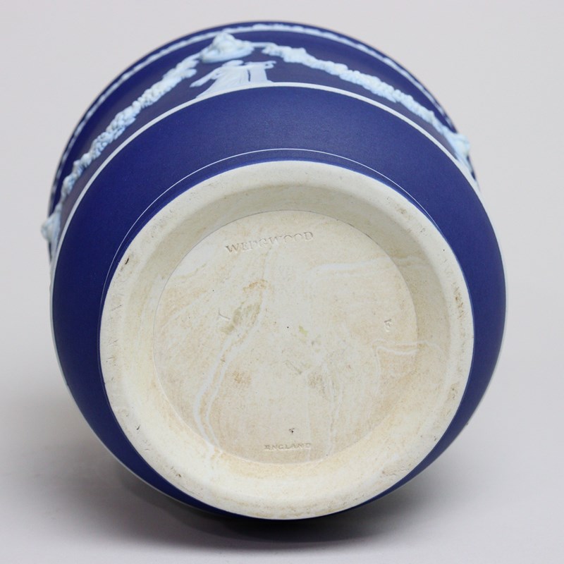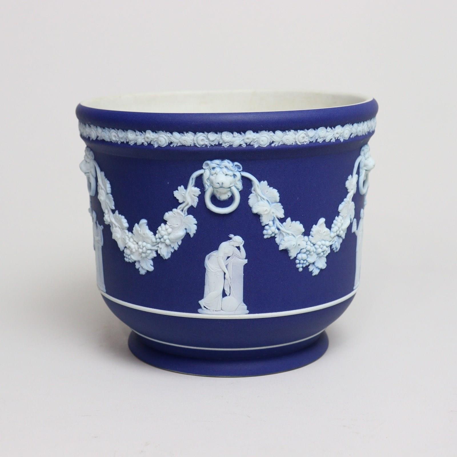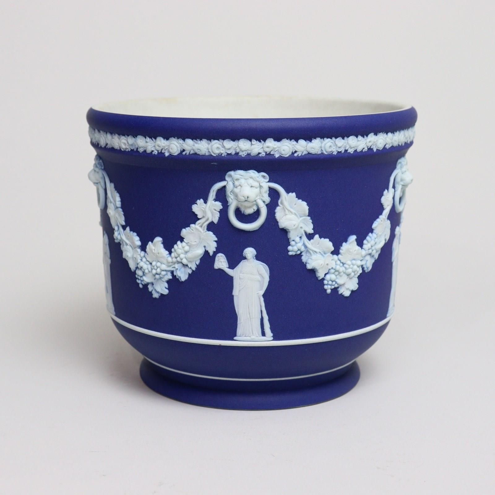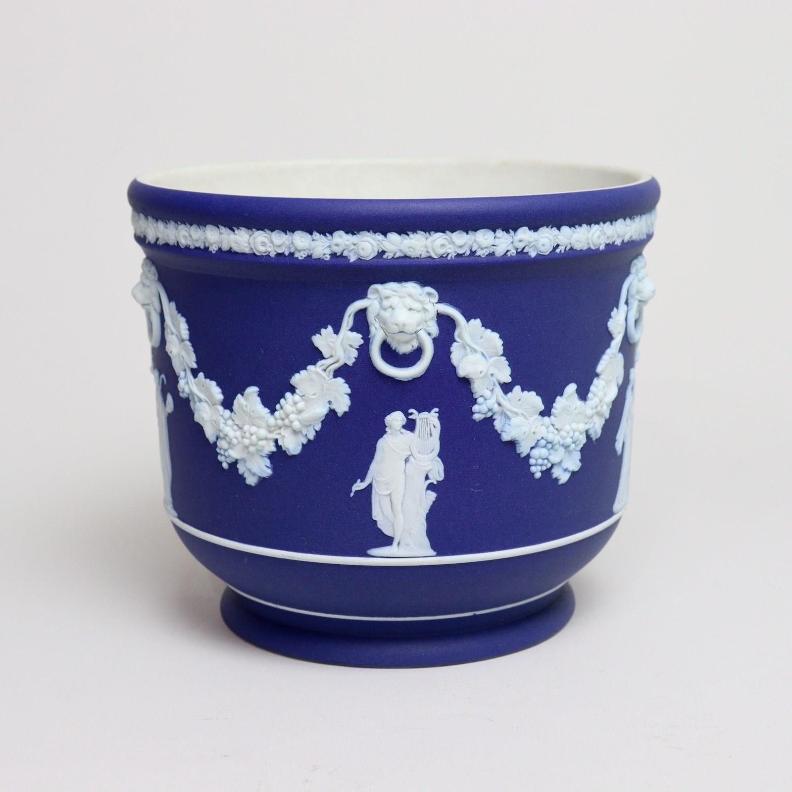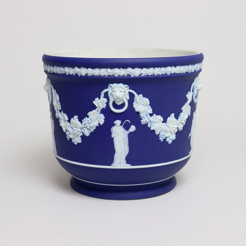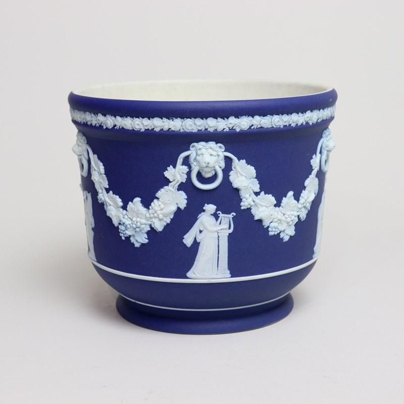 A Wedgwood, dark blue jasper dip jardiniere. This is marked “WEDGWOOD ENGLAND” and it dates from c.1900. It is decorated, in white relief, with Apollo and four of the Muses standing beneath garlands of grapes and vines which hang from lion’s heads. To the rim is a border of small flowers. The reliefs are all good quality and the jardiniere is in excellent condition. There is slight bleeding of the dark blue dip colour into the white reliefs and this can be seen in the images.