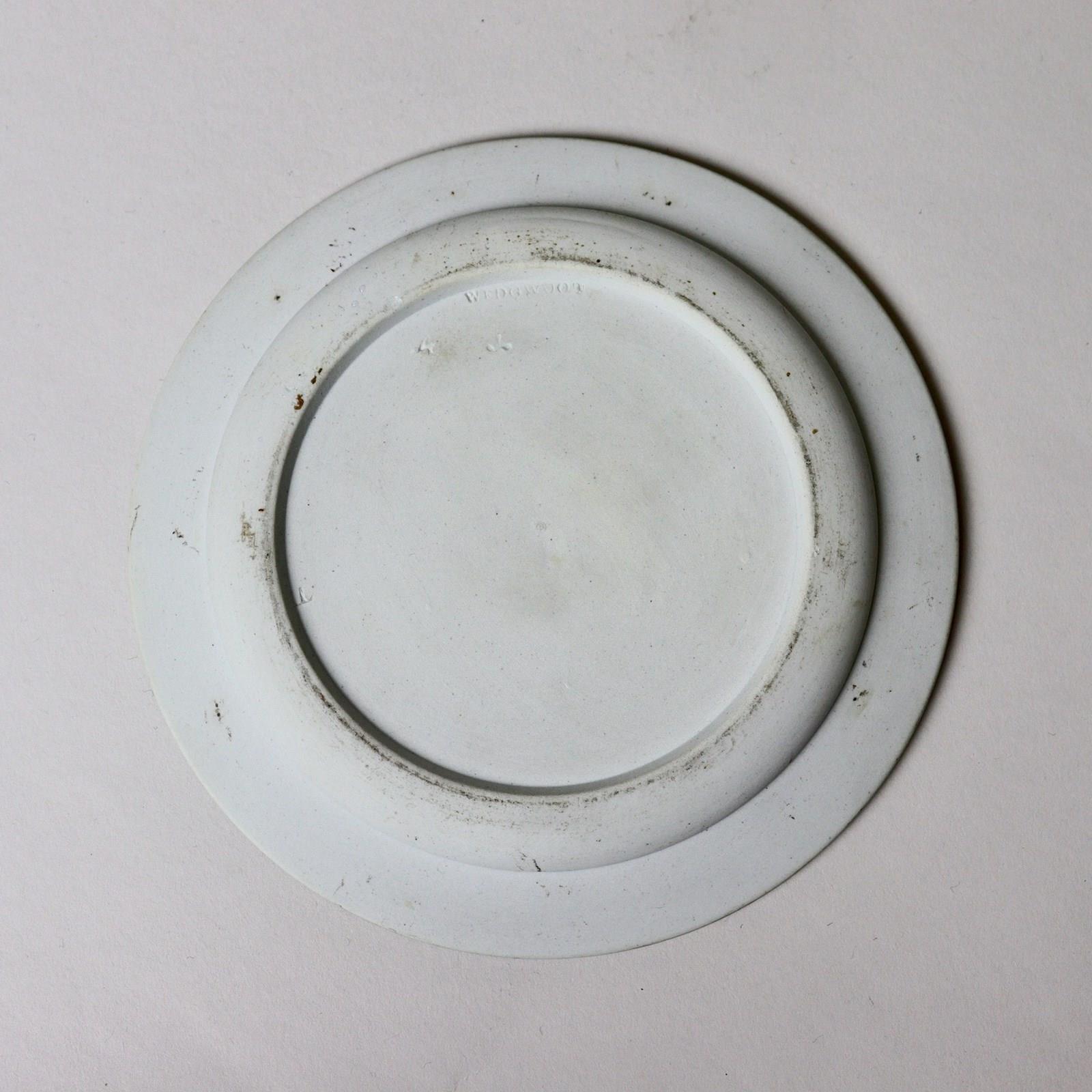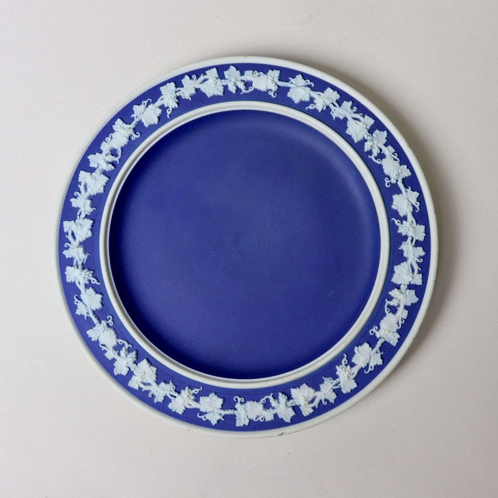 A Wedgwood, dark blue jasper dip tea plate. This is marked ”WEDGWOOD” and it dates from c.1880. It is simply decorated, in white relief, with a border of grapes and vines. The reliefs are good quality and the jasper dip is a rich shade of blue. The plate is in excellent condition.