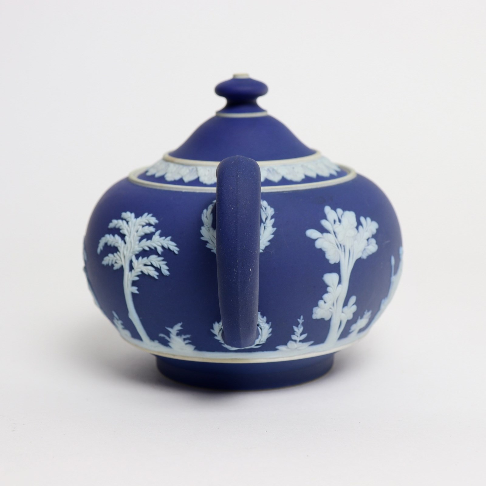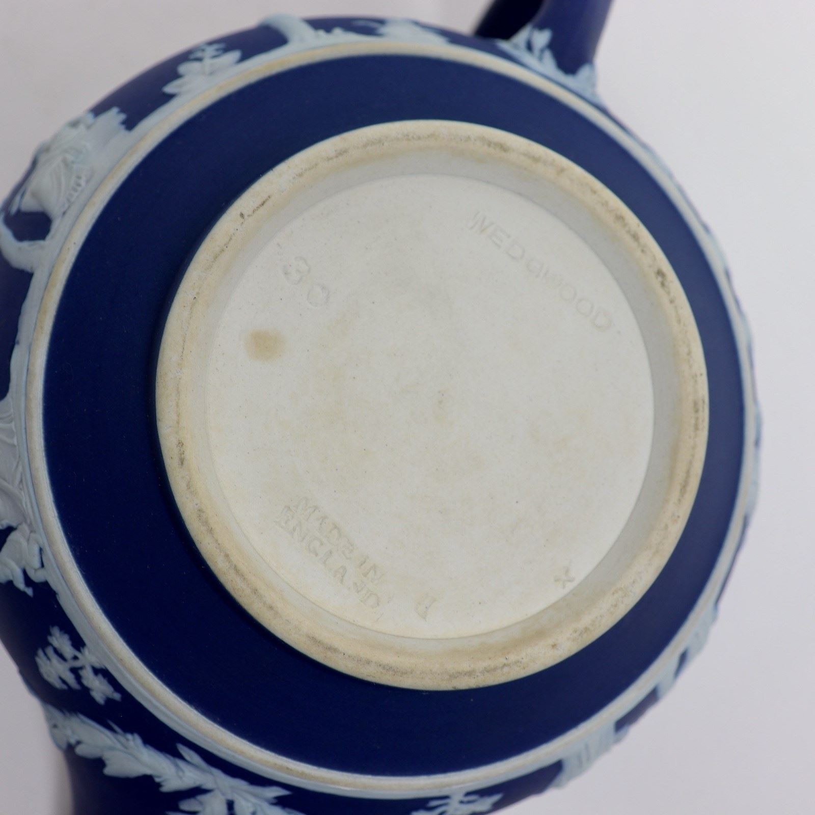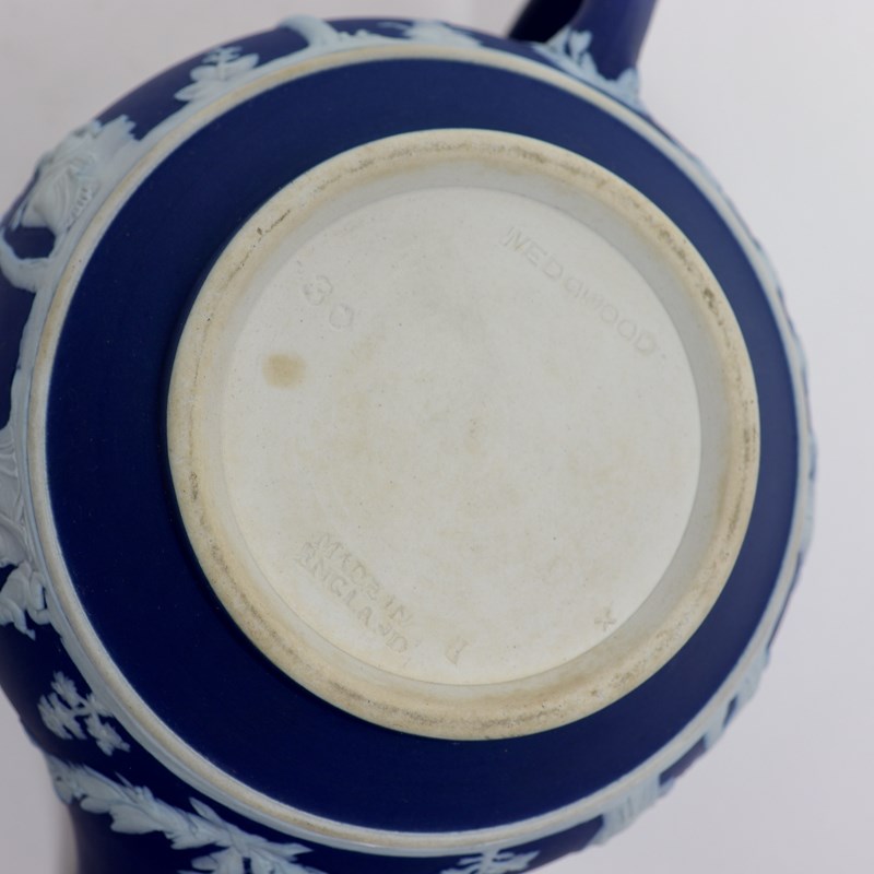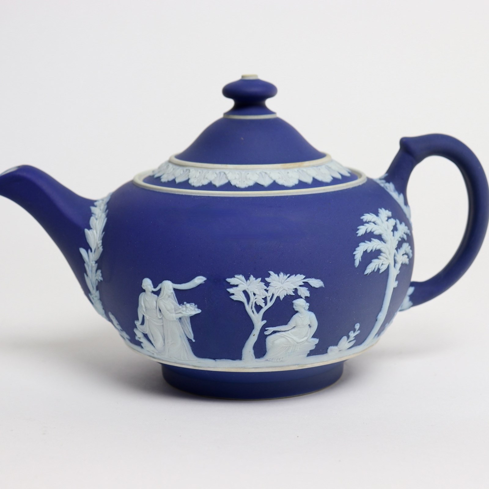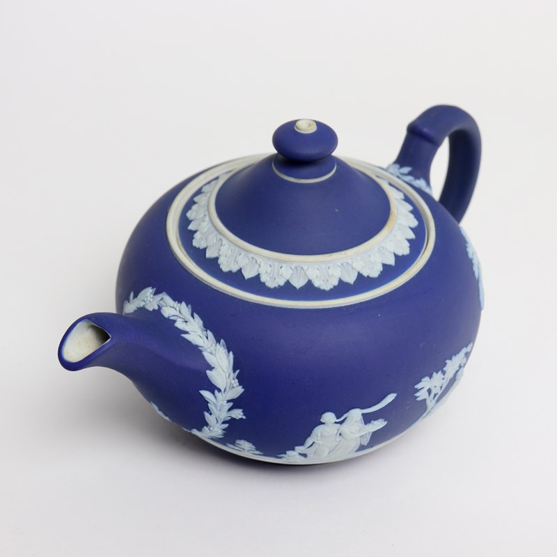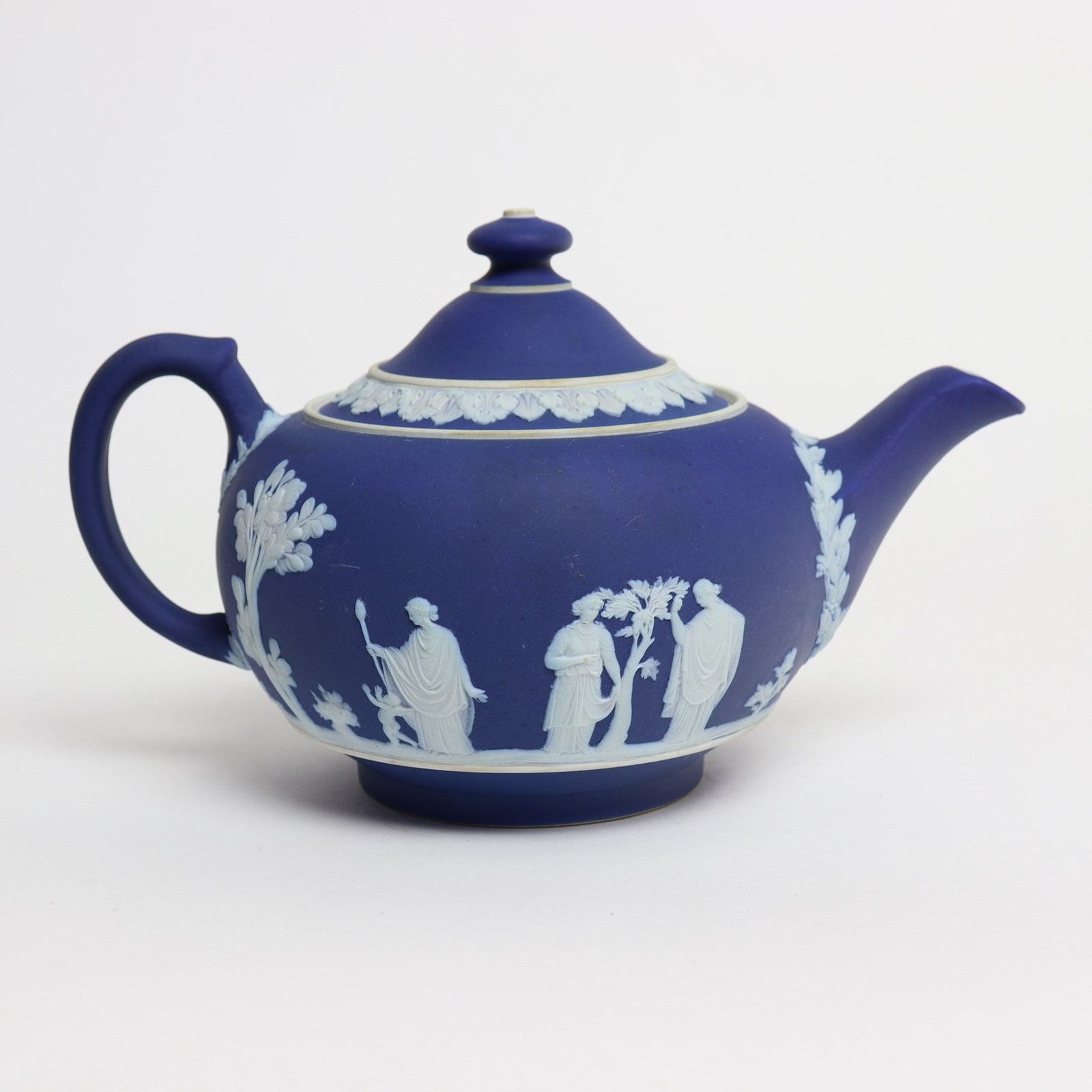 A Wedgwood, dark blue jasper dip teapot. This is marked ”WEDGWOOD MADE IN ENGLAND” and it dates from c.1920. It is also impressed with a number “30”, which would be the batch number, and two letters, an X and a B. It is decorated, in white relief, with a band of classical figures, trees and foliage. To the rim of the lid is a band of acanthus leaves. The reliefs are all good quality and the jasper dip is a rich shade of blue. The teapot and cover are in excellent condition but there is slight staining to the interior of the pot, from use.