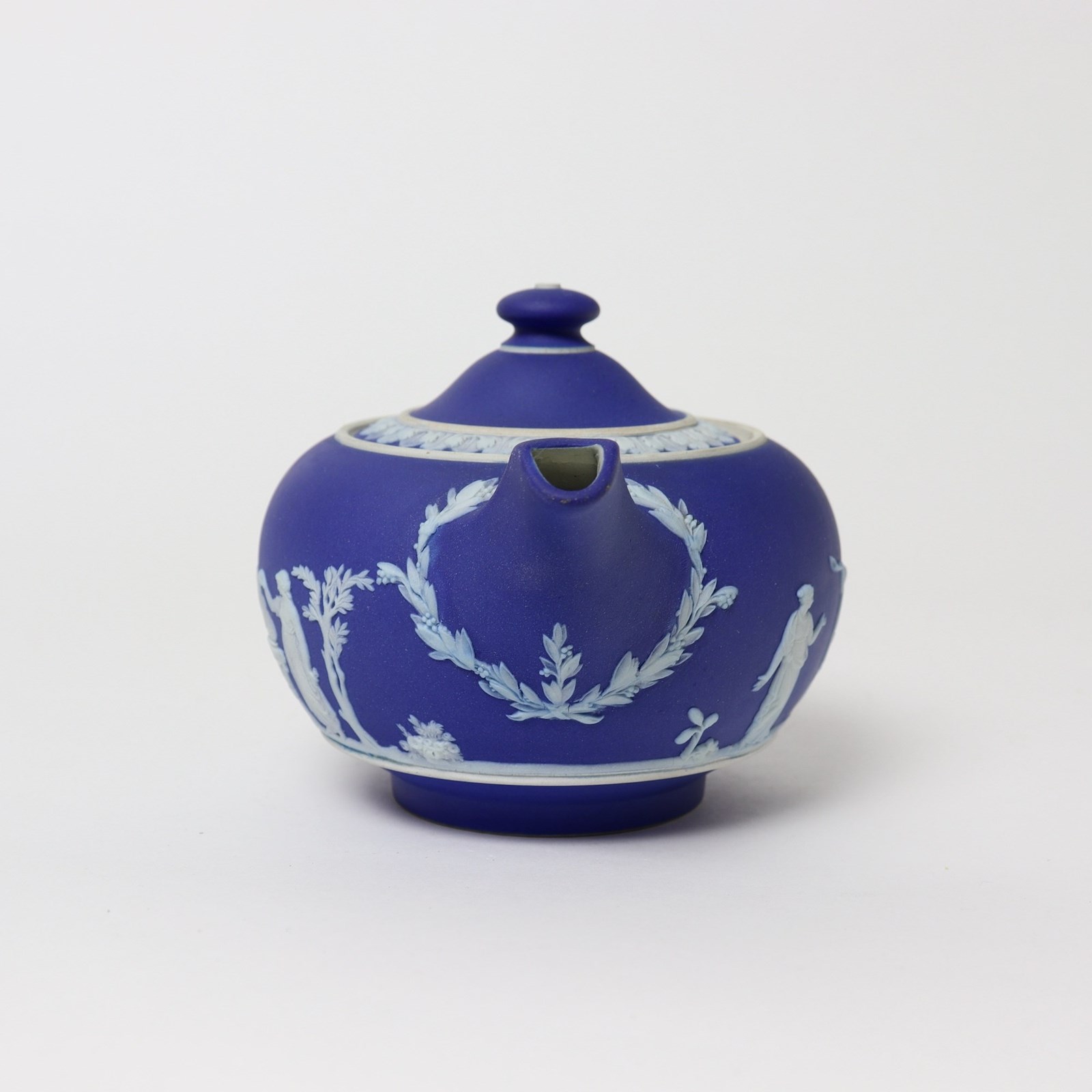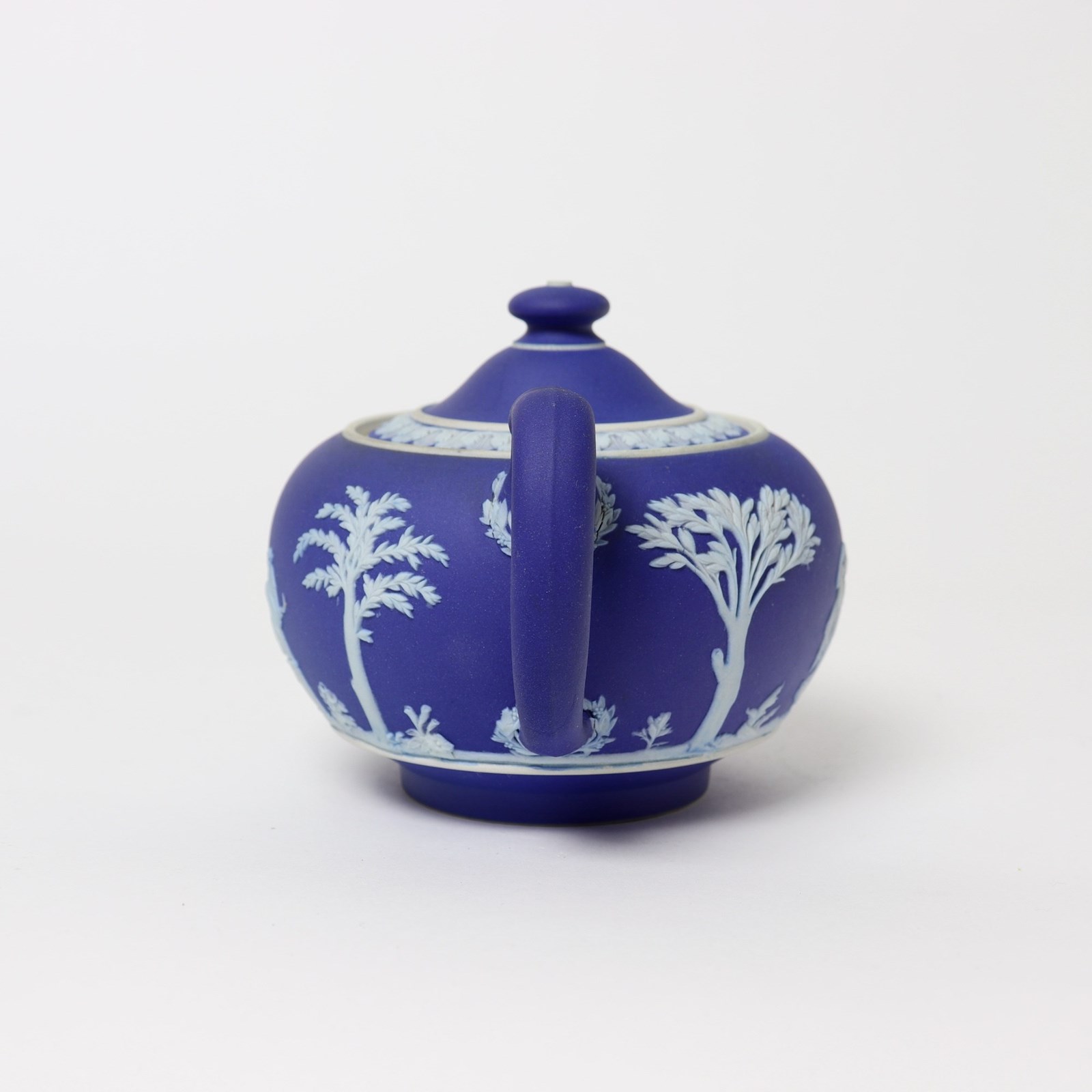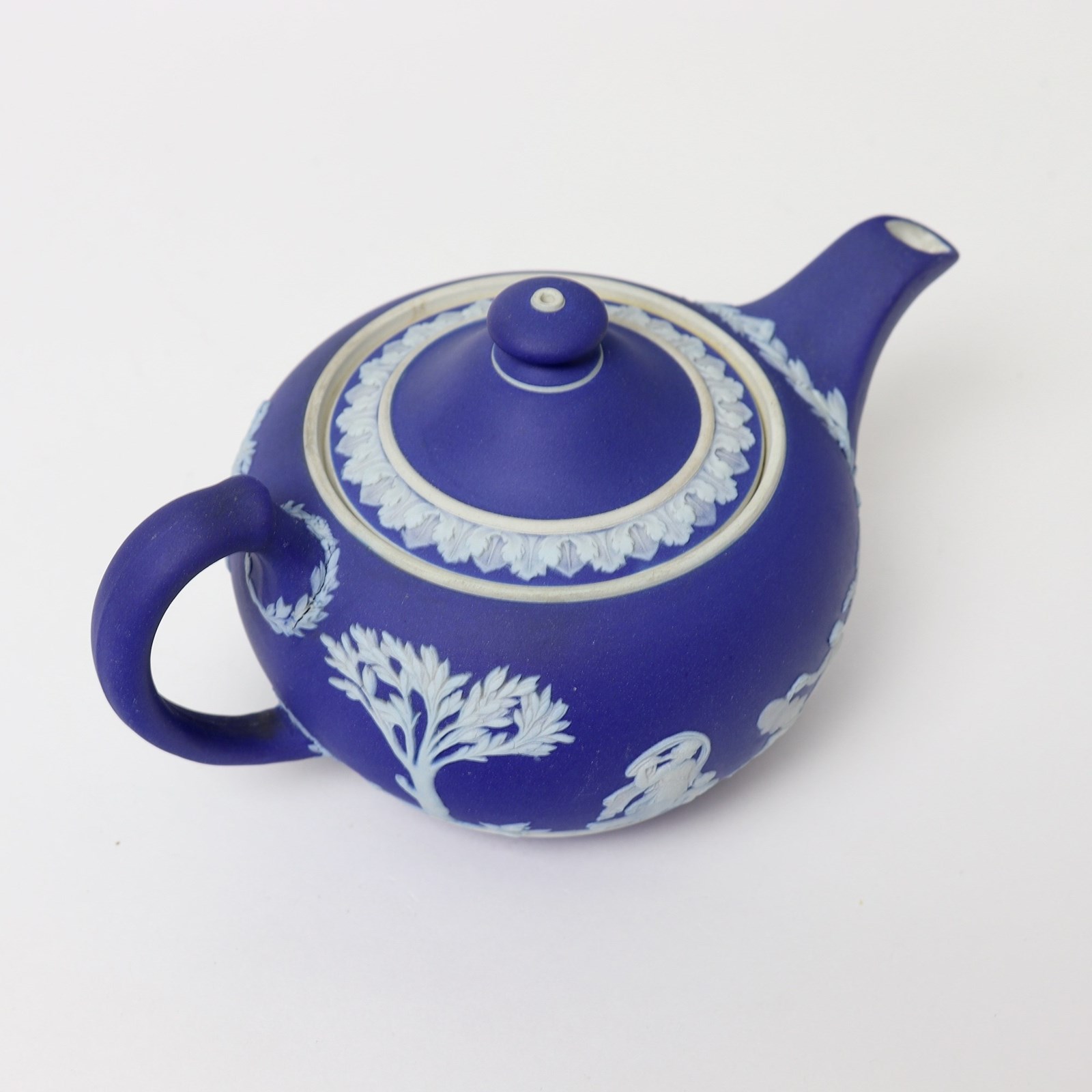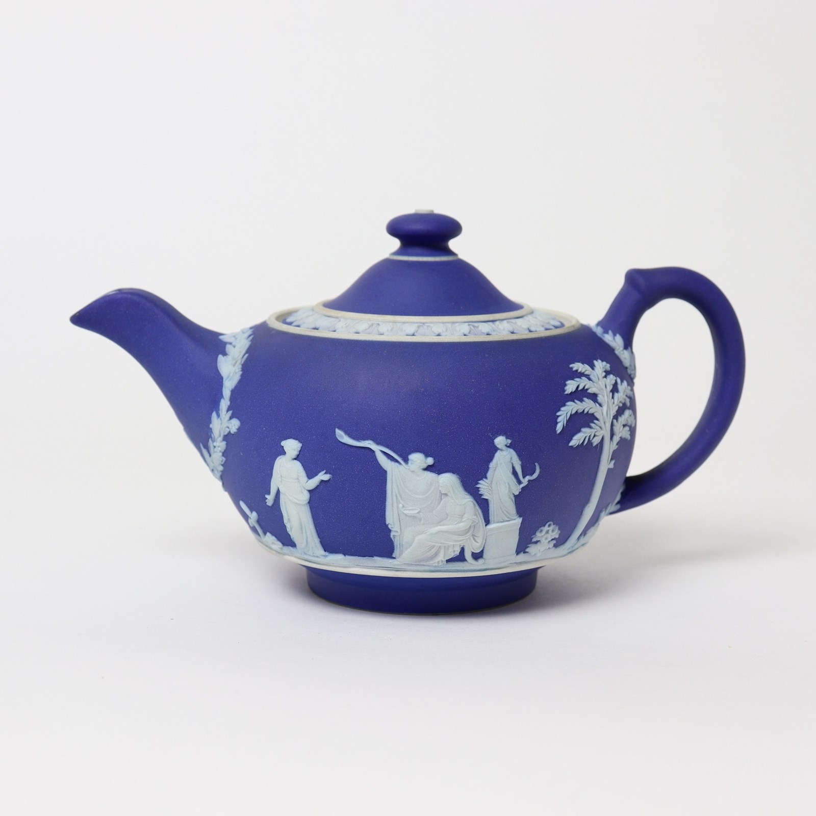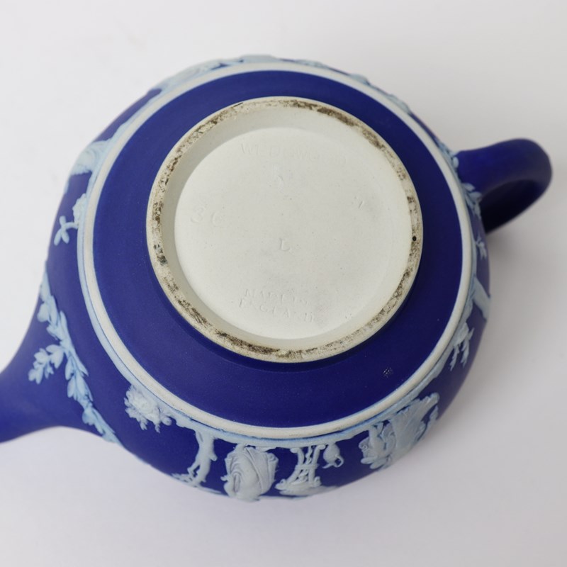 A Wedgwood, dark blue jasper dip teapot. This is marked ”WEDGWOOD MADE IN ENGLAND” and it dates from c.1920. It is also impressed with a number “36”, which would be the batch number, and a letter L. It is decorated, in white relief, with a band of classical figures, trees and foliage. To the rim of the lid is a band of acanthus leaves. The reliefs are all good quality and the jasper dip is a rich shade of blue. The teapot and cover are both in excellent condition.