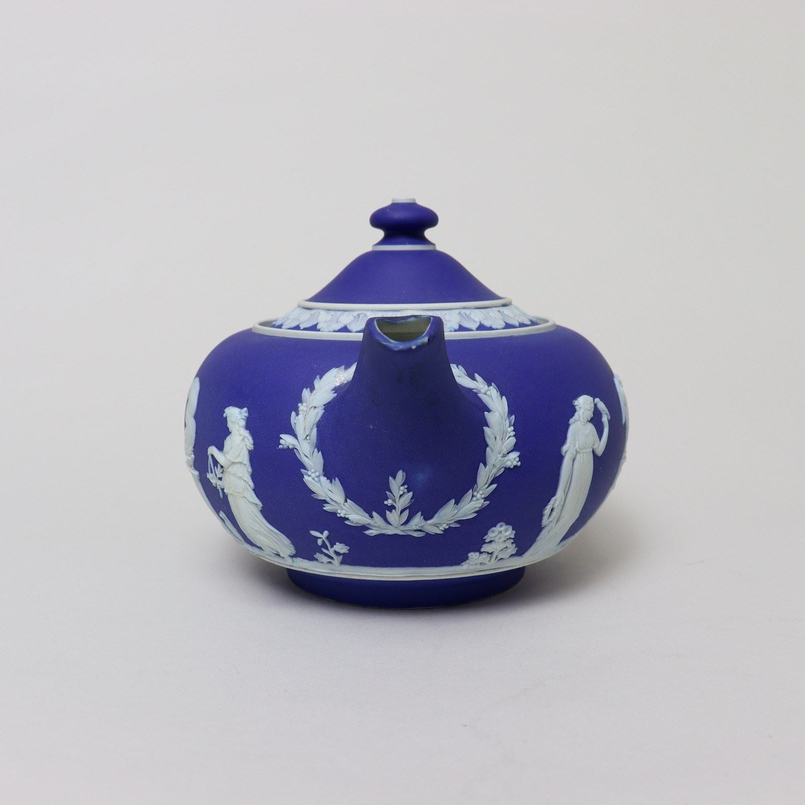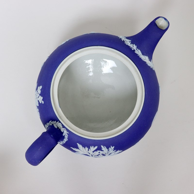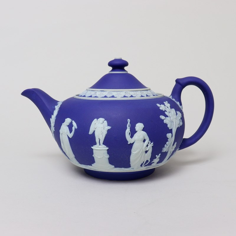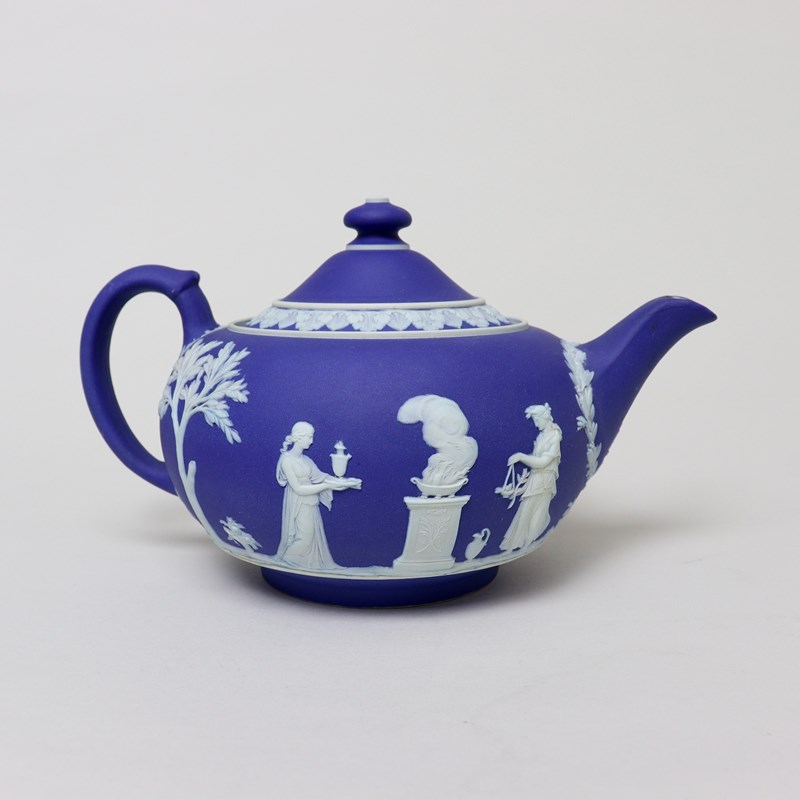 A Wedgwood, dark blue jasper dip teapot and cover. This is marked with”WEDGWOOD MADE IN ENGLAND” and it dates from c.1920. It is decorated, in white relief, with a band of classical maidens offering sacrifices. There are bands of laurel leaves and berries around the spout and the handle, and the lid has a border of acanthus leaves. There are two very tiny chips to the end of the spout but otherwise it is in good condition.