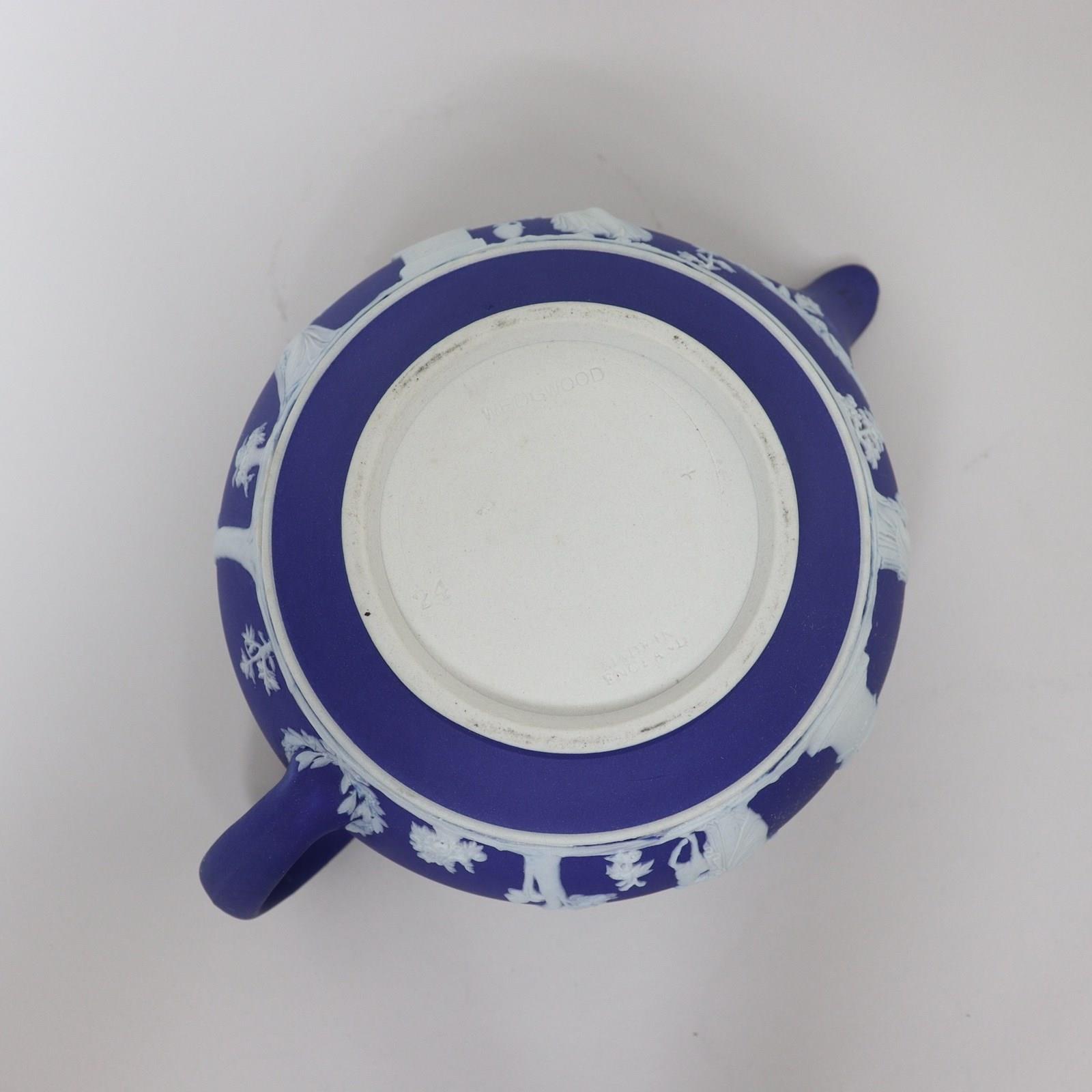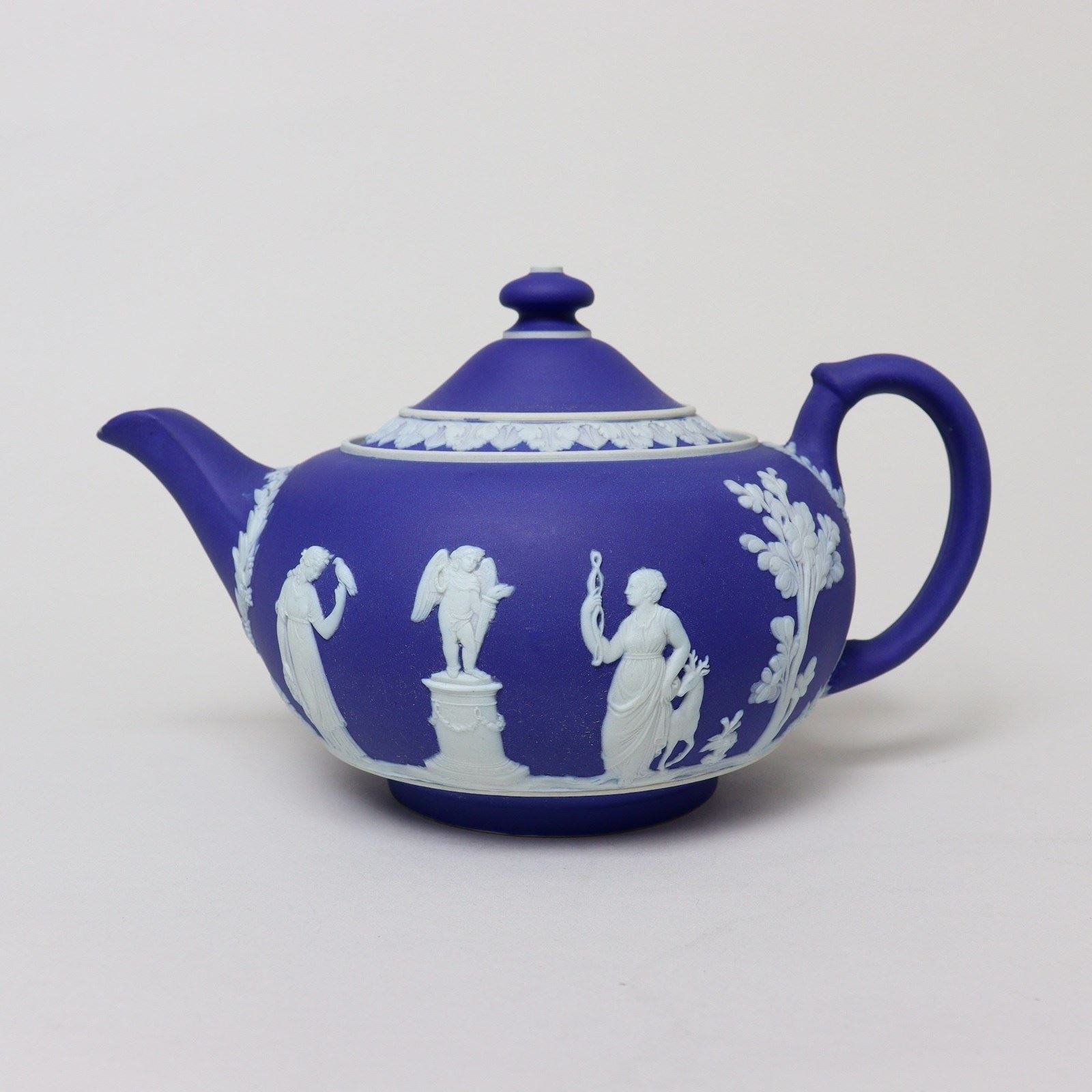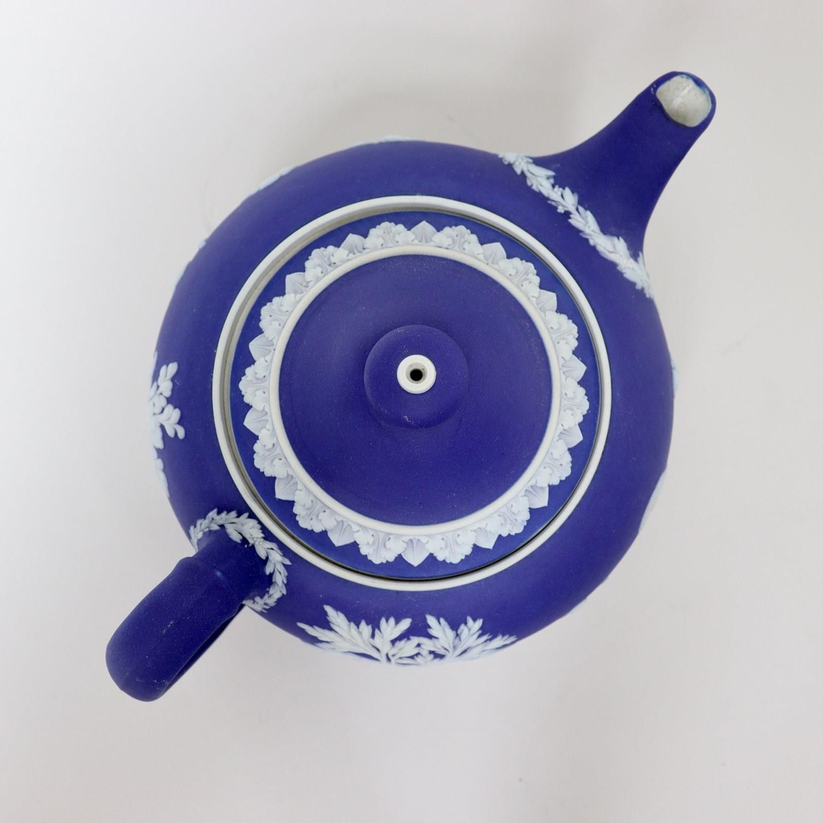 A Wedgwood, dark blue jasper dip teapot and cover. This is marked with”WEDGWOOD MADE IN ENGLAND” and it dates from c.1920. It is decorated, in white relief, with a band of classical maidens offering sacrifices. There are bands of laurel leaves and berries around the spout and the handle, and the lid has a border of acanthus leaves. There are two very tiny chips to the end of the spout but otherwise it is in good condition.