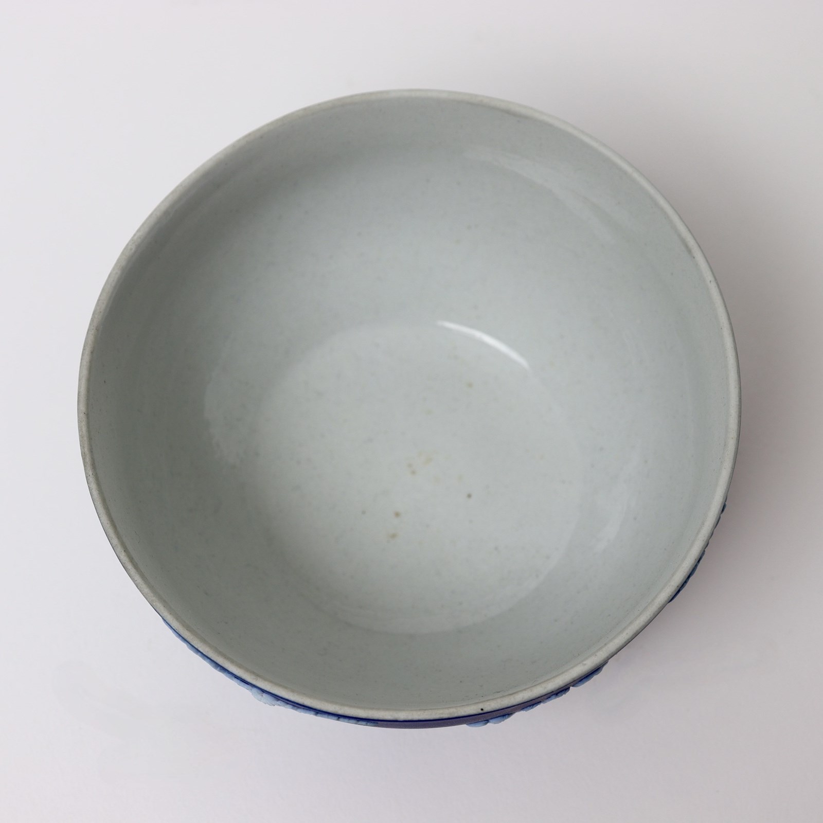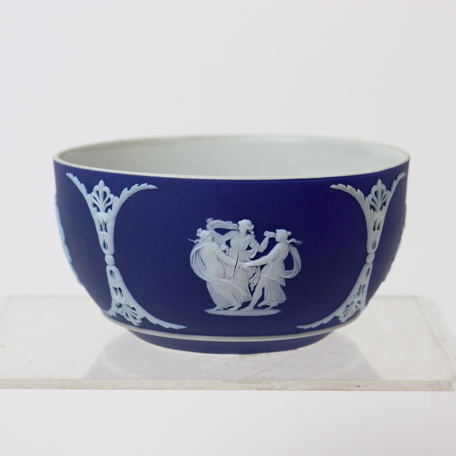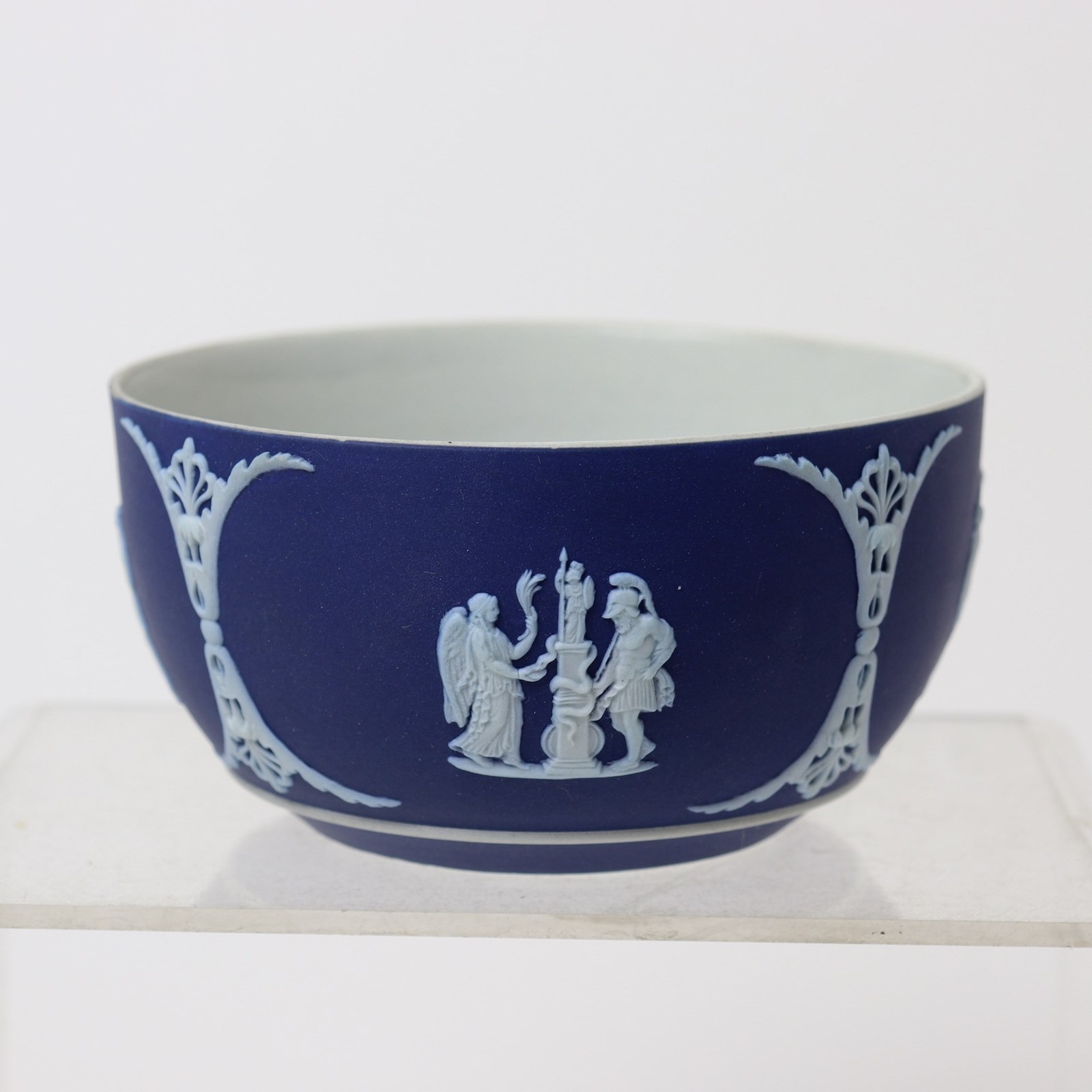 A small, Wedgwood, dark blue jasper dip bowl. This is marked ”WEDGWOOD ENGLAND” and it dates from c.1900. There are also a couple of very small, indistinct, impressed marks. The bowl is decorated, in white relief, with four different classical subjects, including the Three Graces and Pegasus all set between anthemion. The reliefs are good quality and the jasper dip is a very deep shade of blue. The piece is in excellent condition.