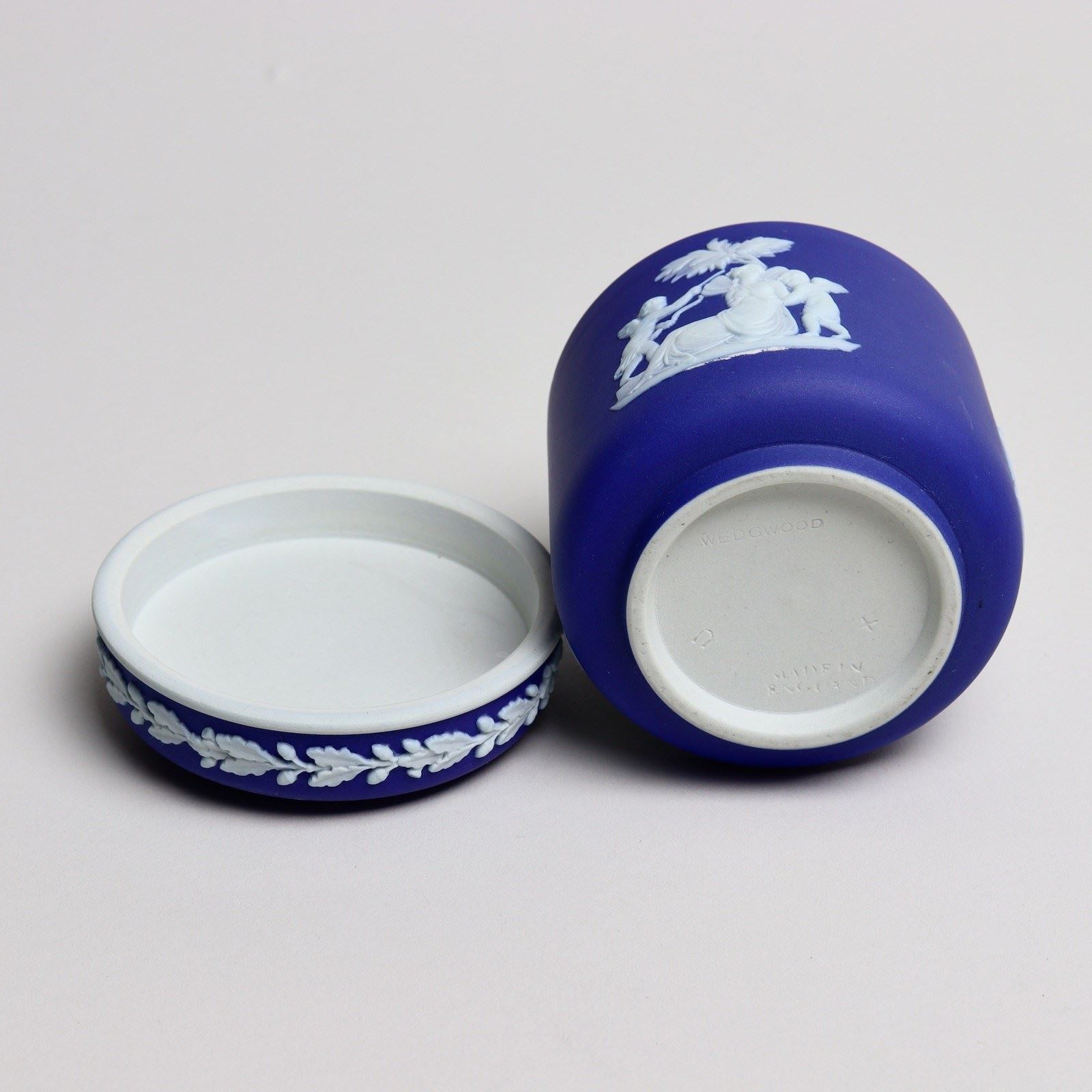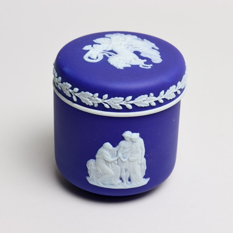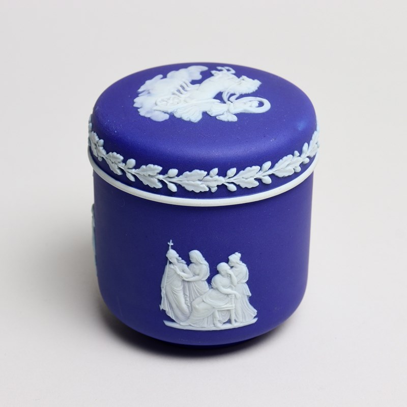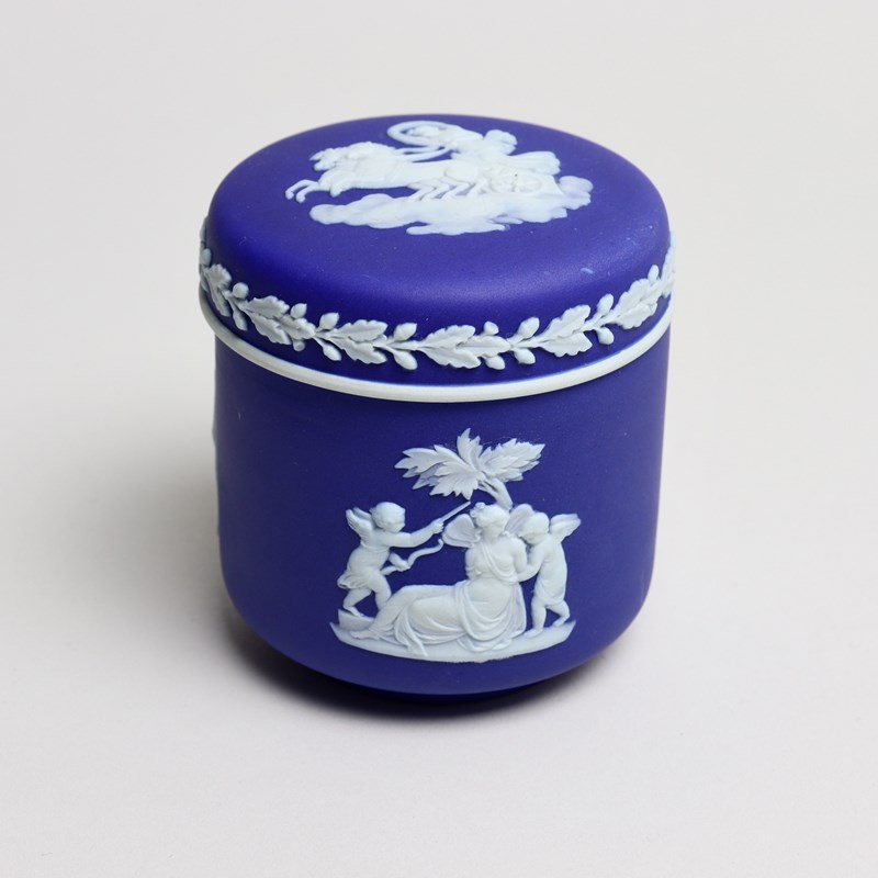 A Wedgwood, dark blue jasper dip lidded pot from a dressing table set. This is marked “WEDGWOOD MADE IN ENGLAND” and it dates from c.1920. It is also impressed with a large letter ‘U’, which could be a workman’s mark, and a cross. It is decorated, in white relief, with three different classical subjects to the pot and a further one to the lid. To the rim of the lid is a border of oak leaves and acorns. The reliefs are all good quality and the jasper dip is a rich shade of blue. It is in excellent condition.