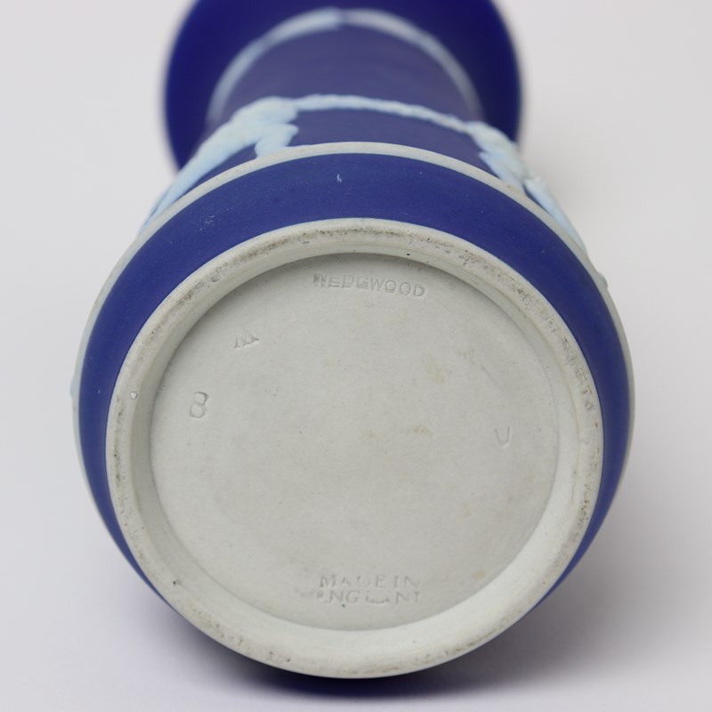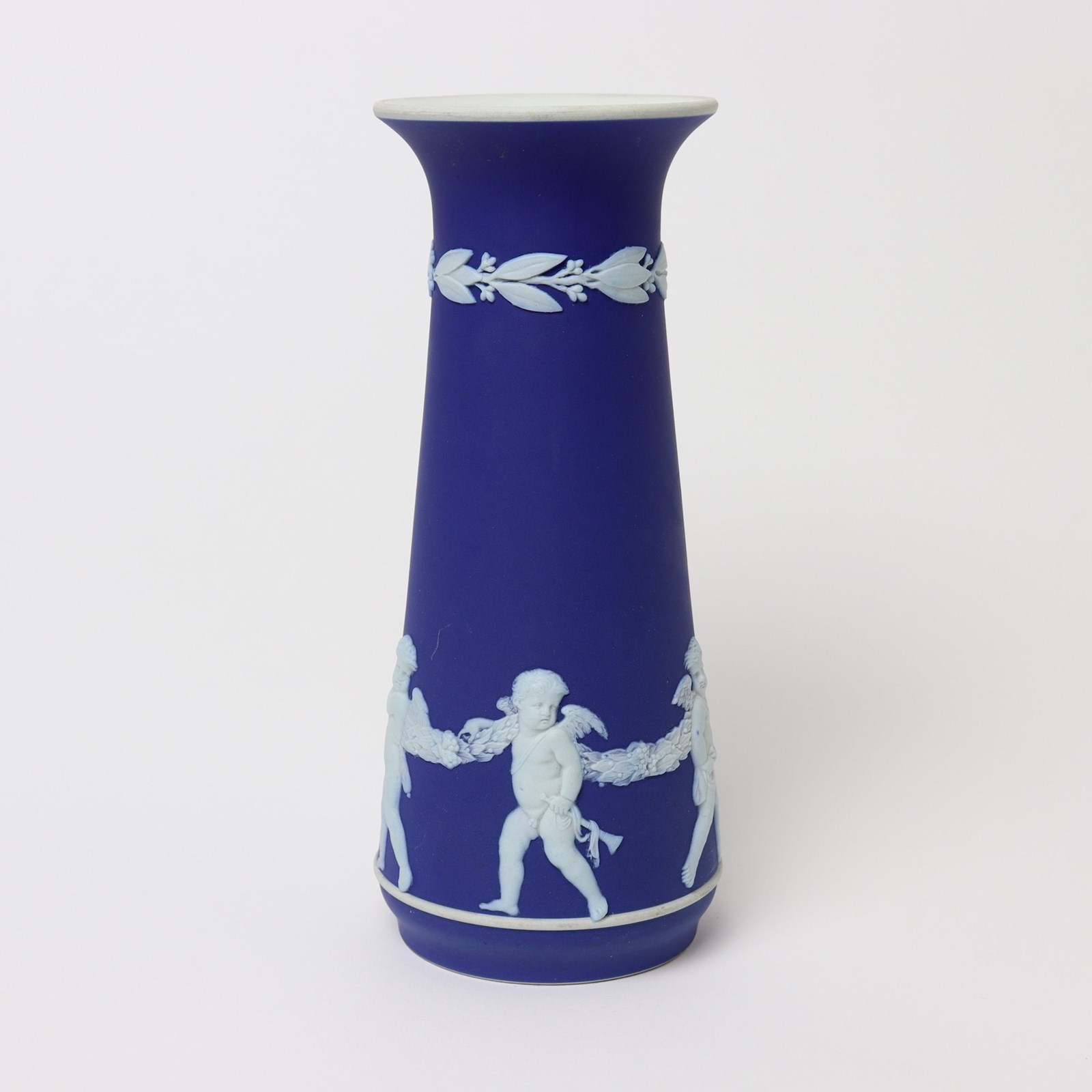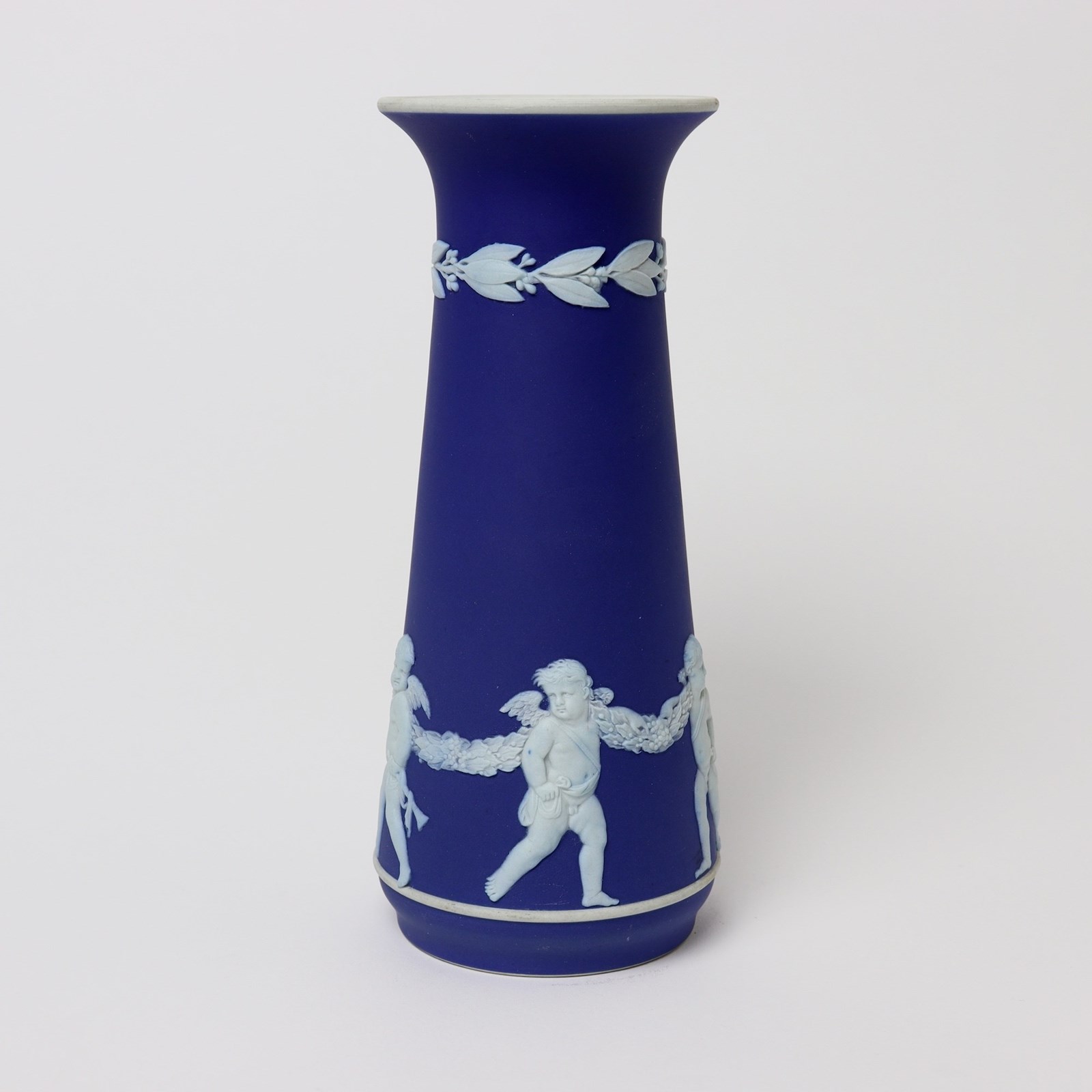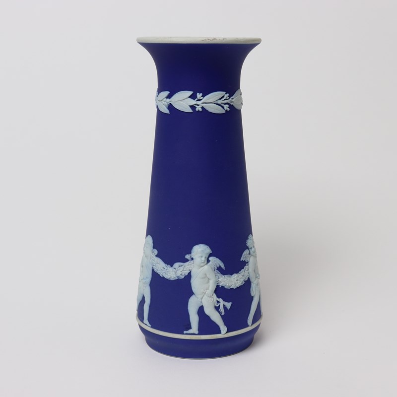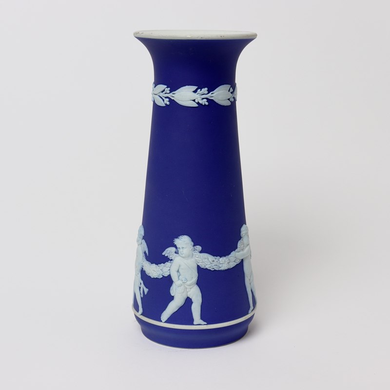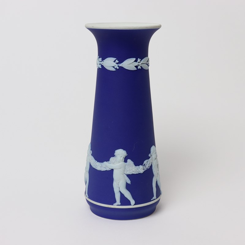 An early 20th century, Wedgwood dark blue jasper dip vase. This is marked “WEDGWOOD MADE IN ENGLAND” and it dates from c.1920. It is also impressed with a letter “W” and a number “8” which relates to the height in inches. It is decorated, in white relief, with a band of Cupids holding onto a garland. To the neck is a border of laurel leaves and berries. The design and shape is one which is more commonly associated with the Dudsons pottery. The piece is in excellent condition.