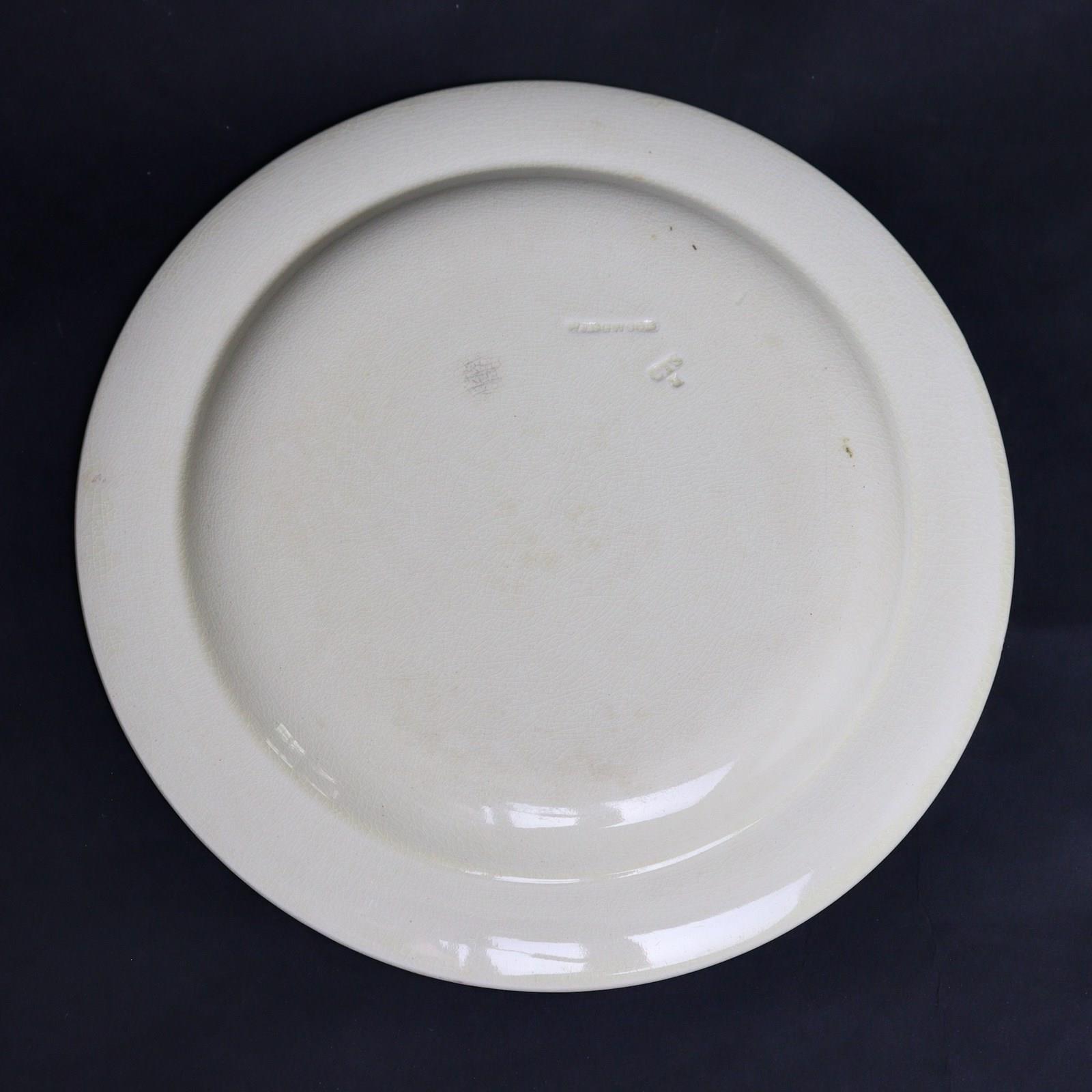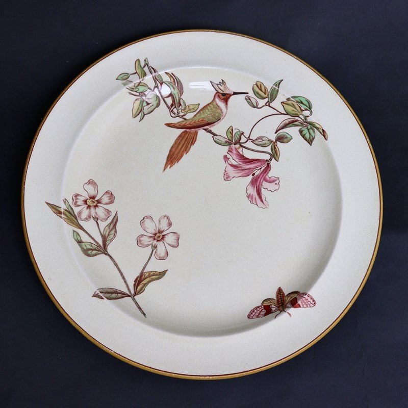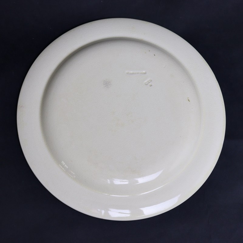 A Wedgwood, late creamware, dessert plate decorated with a bird and a butterfly. This is marked ”WEDGWOOD” and it is also impressed with the letters ”CTS” above another indistinct letter. This is the date code for the year of manufacture which is 1864. The plate is potted in a heavy creamware, which is known as late creamware, as the body is quite different to the early, lightly potted creamware of the 18th century. It is decorated with an outline transfer print in brown which is then hand coloured with polychrome enamels. There is a small stain to the reverse of the plate but otherwise it is in good condition.