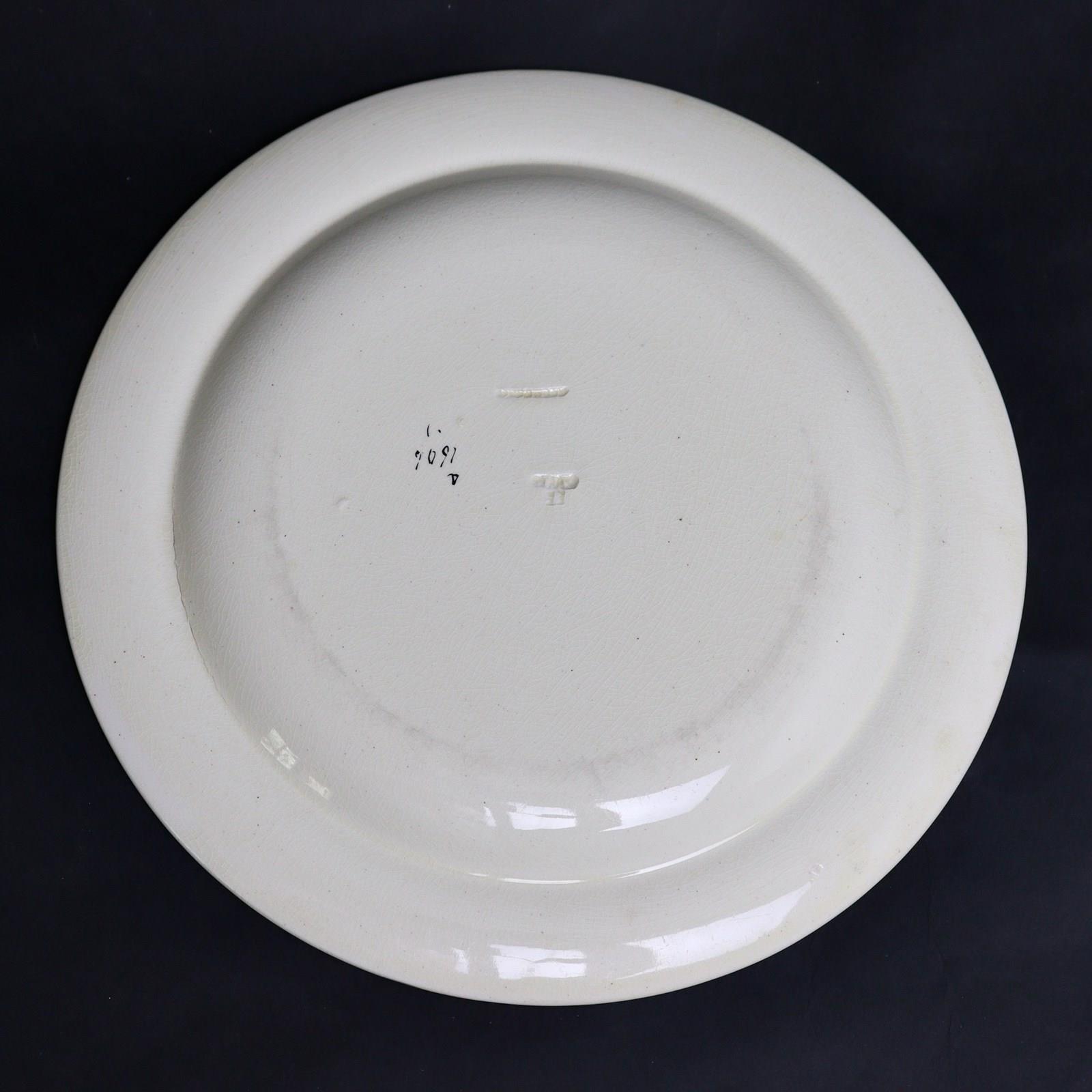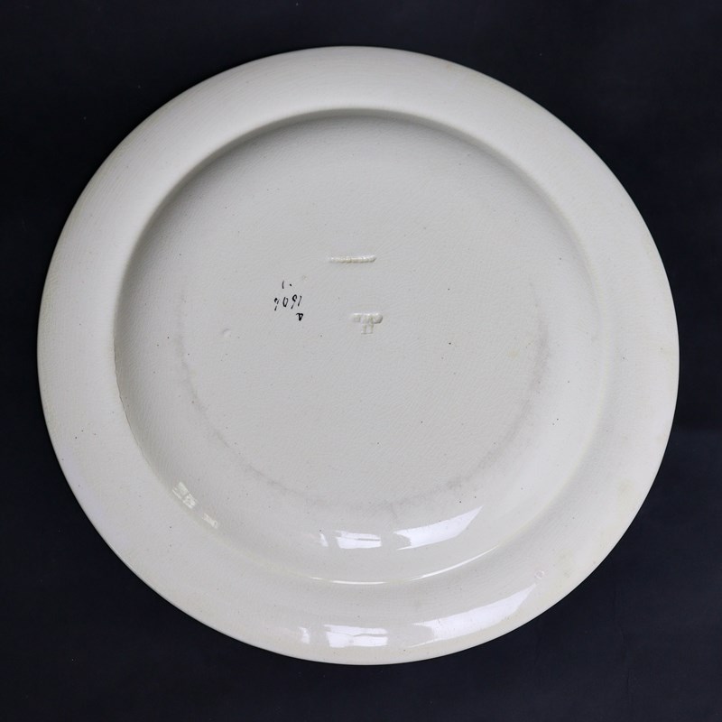 A Wedgwood, late creamware, dessert plate decorated with a bird and a butterfly. This is marked ”WEDGWOOD” and it is also impressed with an indistinct, three letter date code. It also has a pattern number “A1606” over “P” in black enamel and it dates from c1870. The plate is potted in a heavy creamware, which is known as late creamware, as the body is quite different to the early, lightly potted creamware of the 18th century. It is decorated with an outline transfer print in brown which is then hand coloured with polychrome enamels. There is very slight wear to the enamel colours but otherwise it is in good condition.