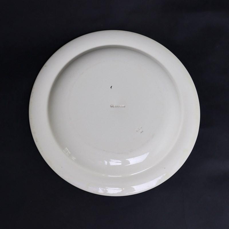 A Wedgwood, late creamware, dinner plate decorated with a bird and a butterfly. This is marked ”WEDGWOOD” and it is also impressed with the letters ”YTR” beneath a letter “W”. This is the date code for the year of manufacture which is 1863. The plate is potted in a heavy creamware, which is known as late creamware, as the body is quite different to the early, lightly potted creamware of the 18th century. It is decorated with an outline transfer print in brown which is then hand coloured with bright, polychrome enamels. It is in excellent condition.
