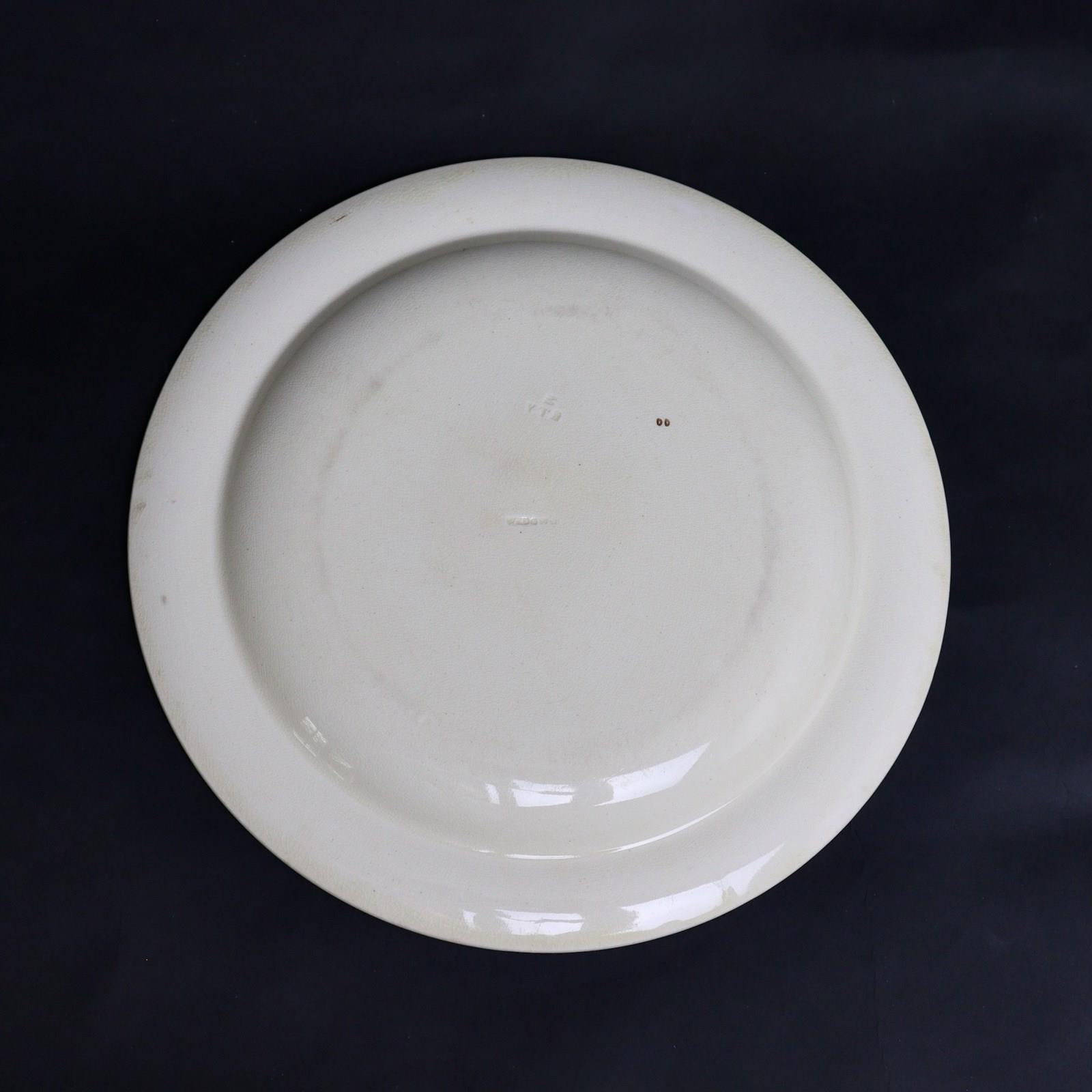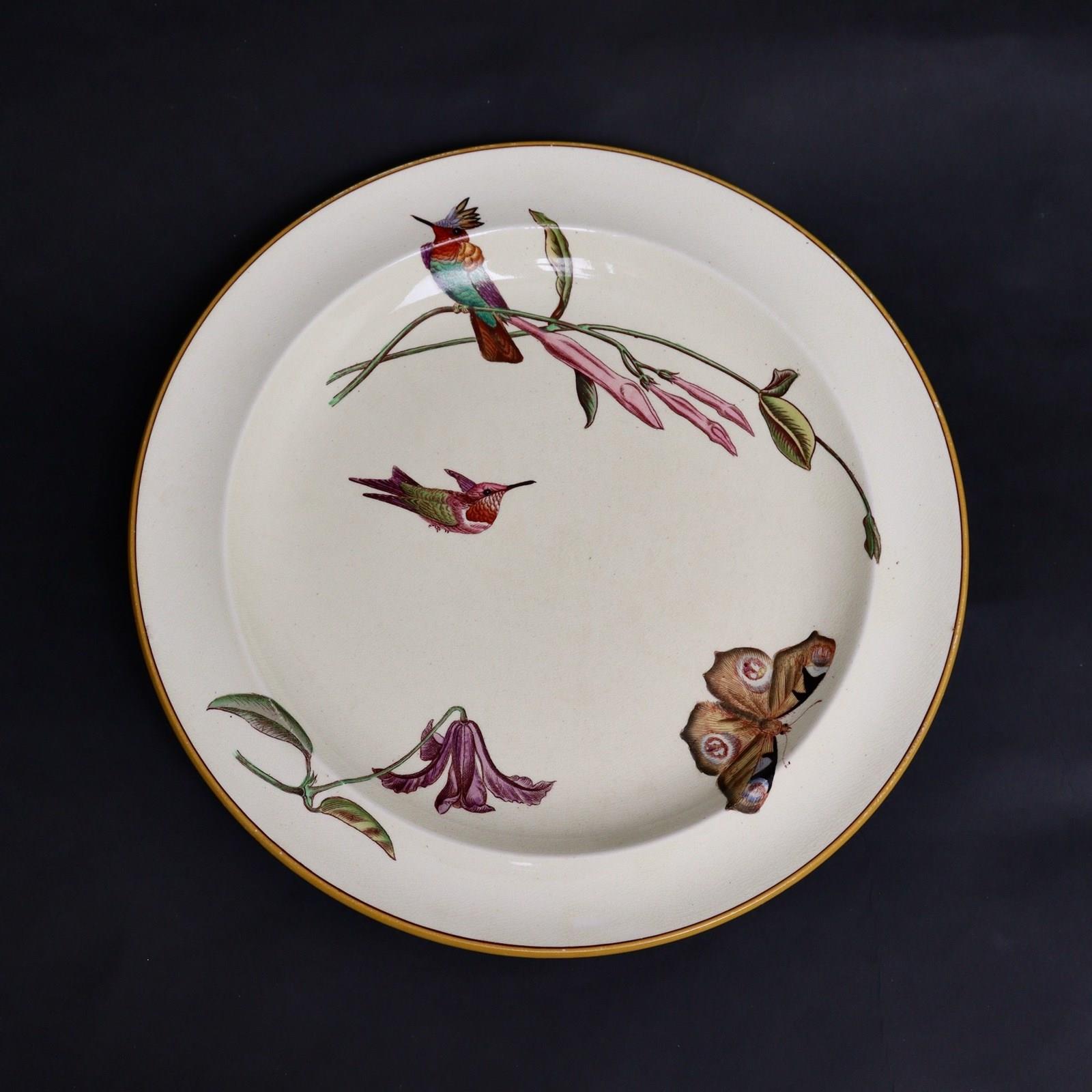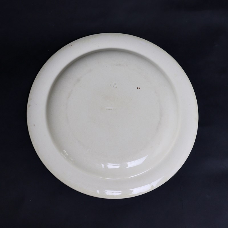 A Wedgwood, late creamware, dinner plate decorated with birds and a butterfly. This is marked ”WEDGWOOD” and it is also impressed with the letters ”YTR” above a letter “M”. This is the date code for the year of manufacture which is 1863. The plate is potted in a heavy creamware, which is known as late creamware, as the body is quite different to the early, lightly potted creamware of the 18th century. It is decorated with an outline transfer print in brown which is then hand coloured with bright, polychrome enamels. It is in excellent condition.