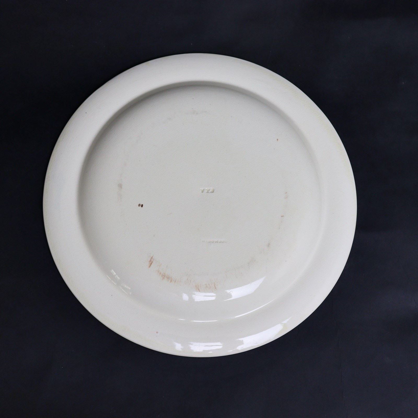 A Wedgwood, late creamware, dinner plate decorated with birds and insects. This is marked ”WEDGWOOD” and it is also impressed with the letters ”YTR”. This is the date code for the year of manufacture which is 1863. The plate is potted in a heavy creamware, which is known as late creamware, as the body is quite different to the early, lightly potted creamware of the 18th century. It is decorated with an outline transfer print in brown which is then hand coloured with bright, polychrome enamels. There is a very small chip to the ochre enamel on the rim but otherwise it is in good condition.