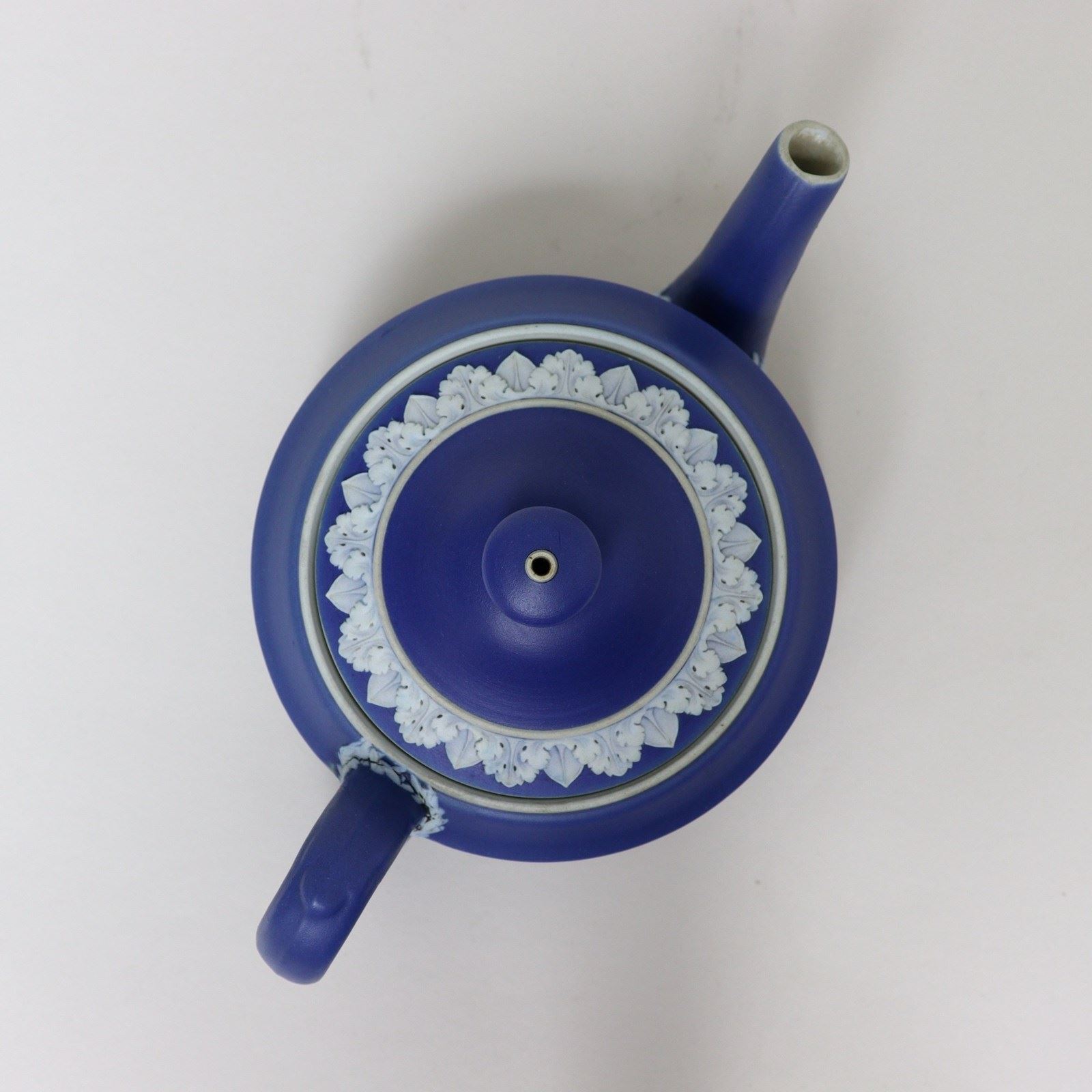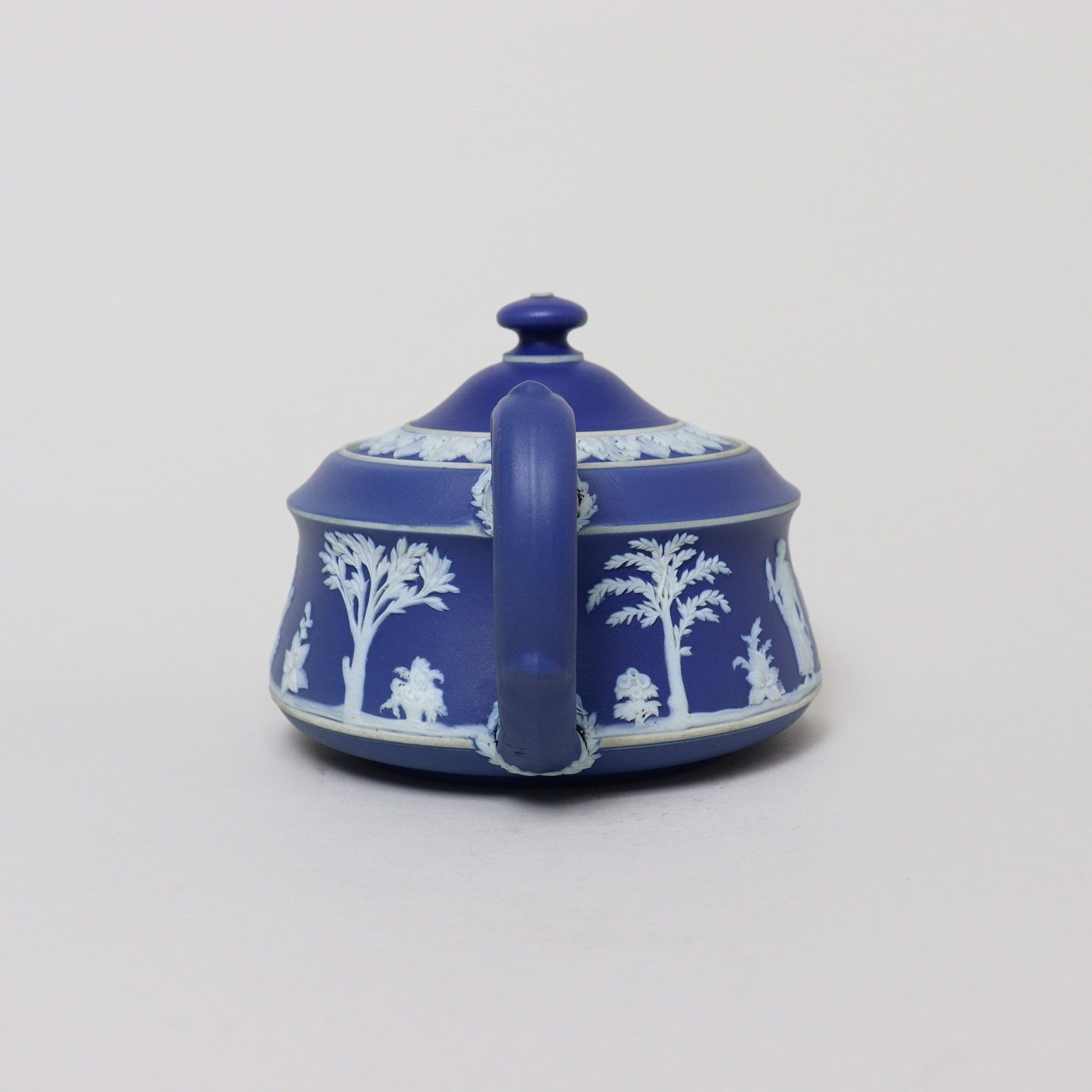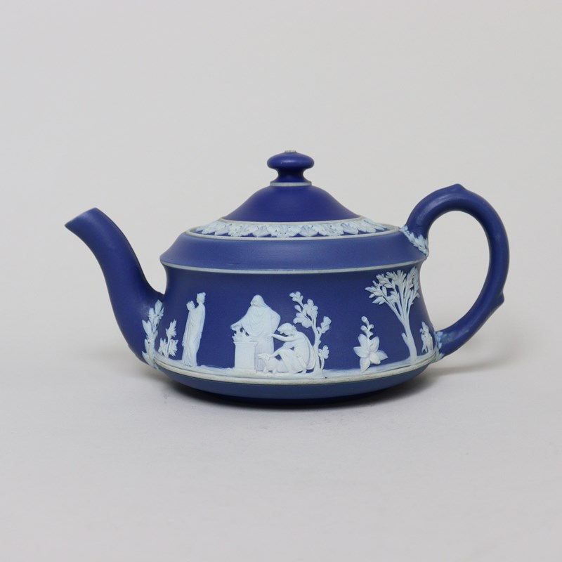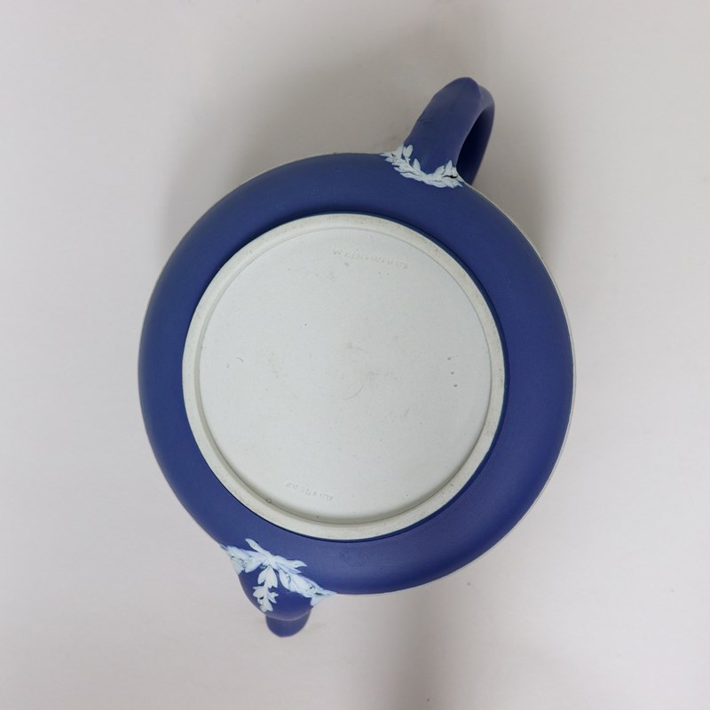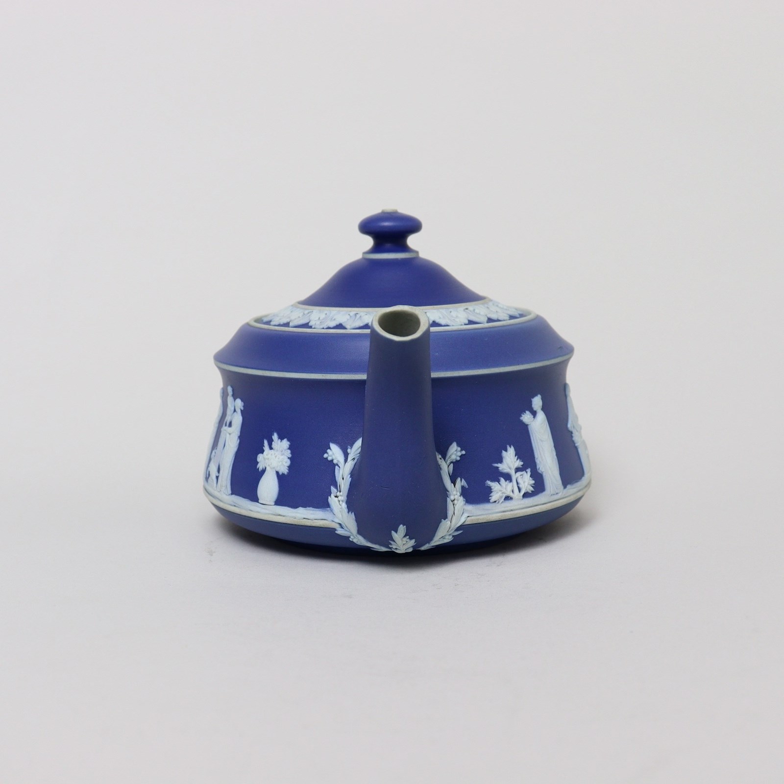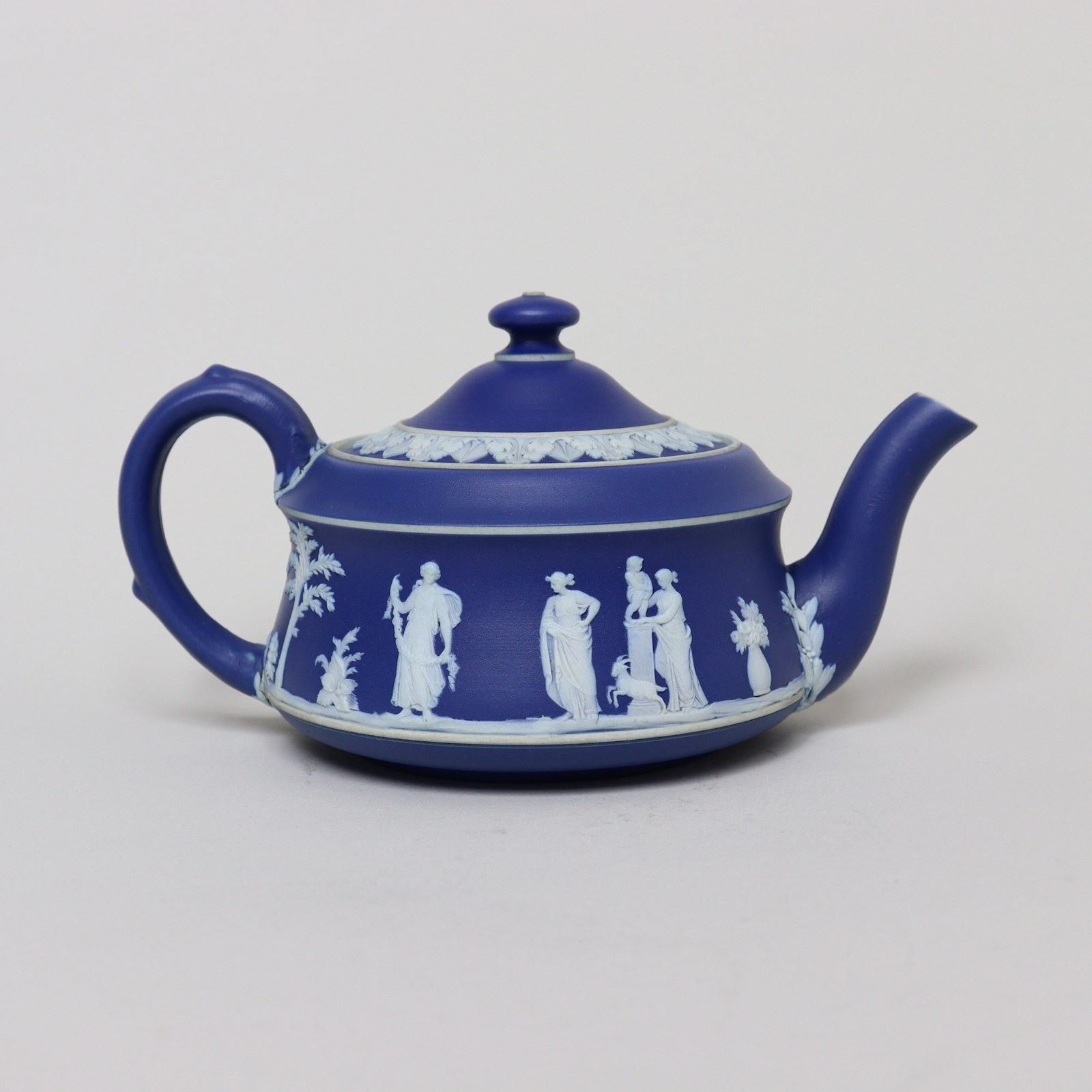A Wedgwood dark blue jasper dip teapot and cover. This is marked ”WEDGWOOD ENGLAND” and it dates from c.1900. This shape of teapot was classified, in Wedgwood’s catalogues, as the Etruscan shape. It is decorated, in white relief, with a continuous band of classical figures set between trees and foliage, and there is a classical leaf border to the lid. The reliefs are good quality and the jasper dip is a very deep, rich shade of blue. Both the pot and cover are in excellent condition.