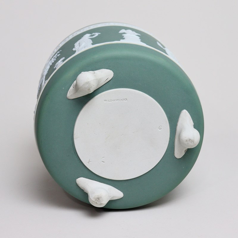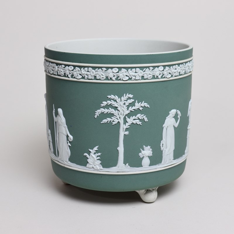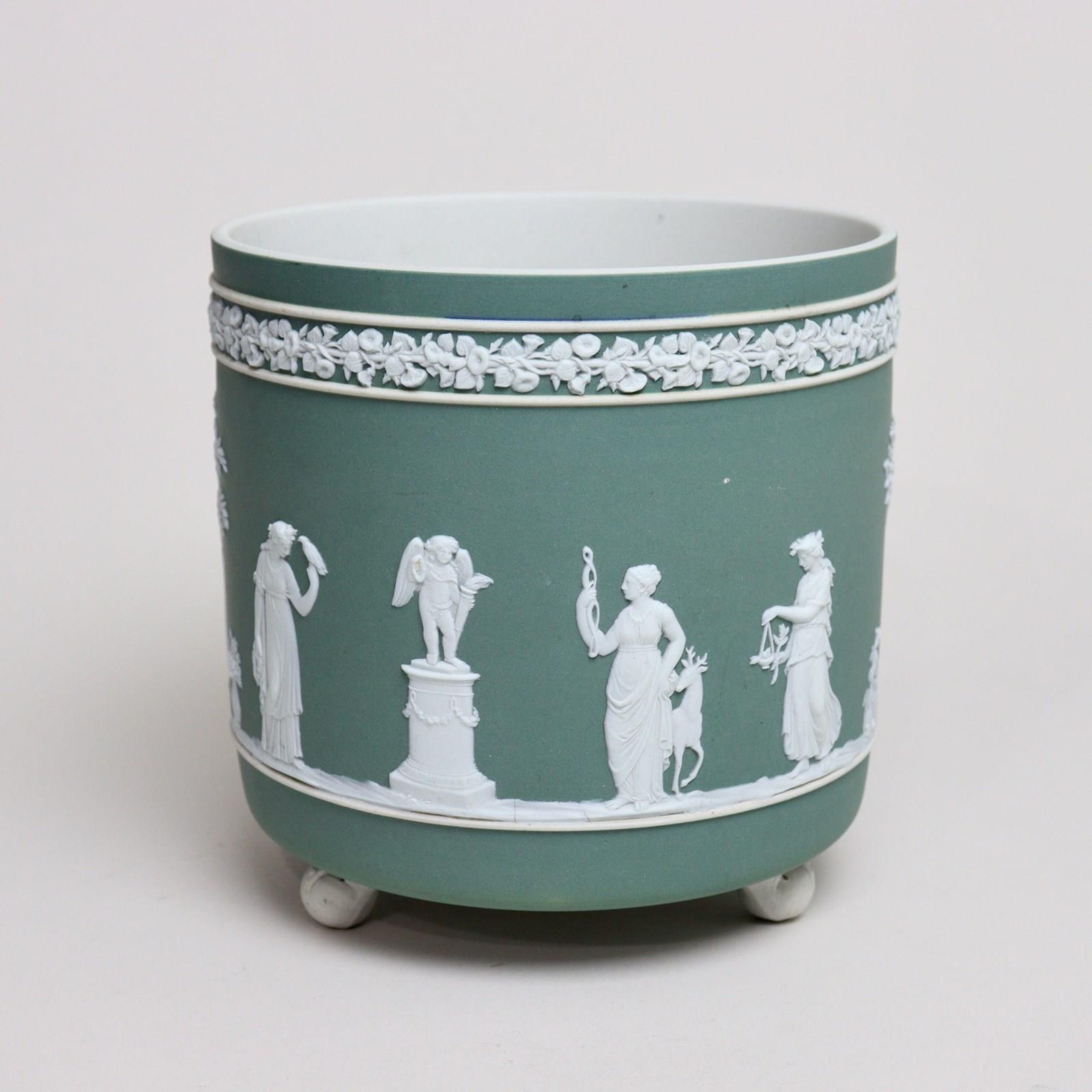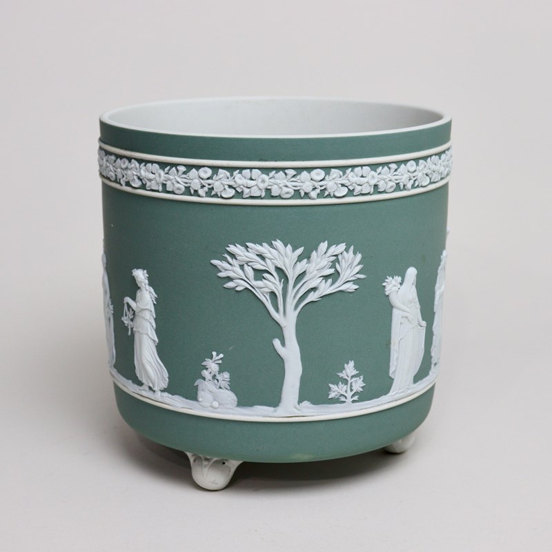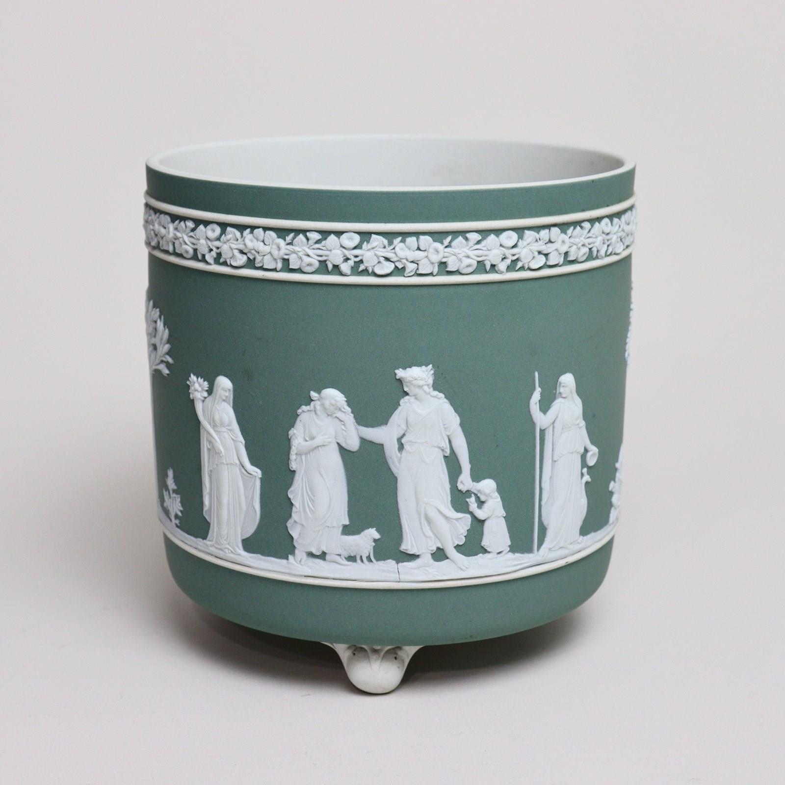 A nineteenth century, Wedgwood green jasper dip jardiniere standing on three ball and claw feet. This is marked “WEDGWOOD” and it dates from c.1860. It is also impressed with the letter “X” and the number “6”, which relates to the size in inches. It is decorated, in white relief, with a continuous band of classical figures, trees and foliage and to the rim is a border of convolvulus. The reliefs are all good quality. There are a couple of small firing cracks in the reliefs but otherwise the piece is in very good condition.