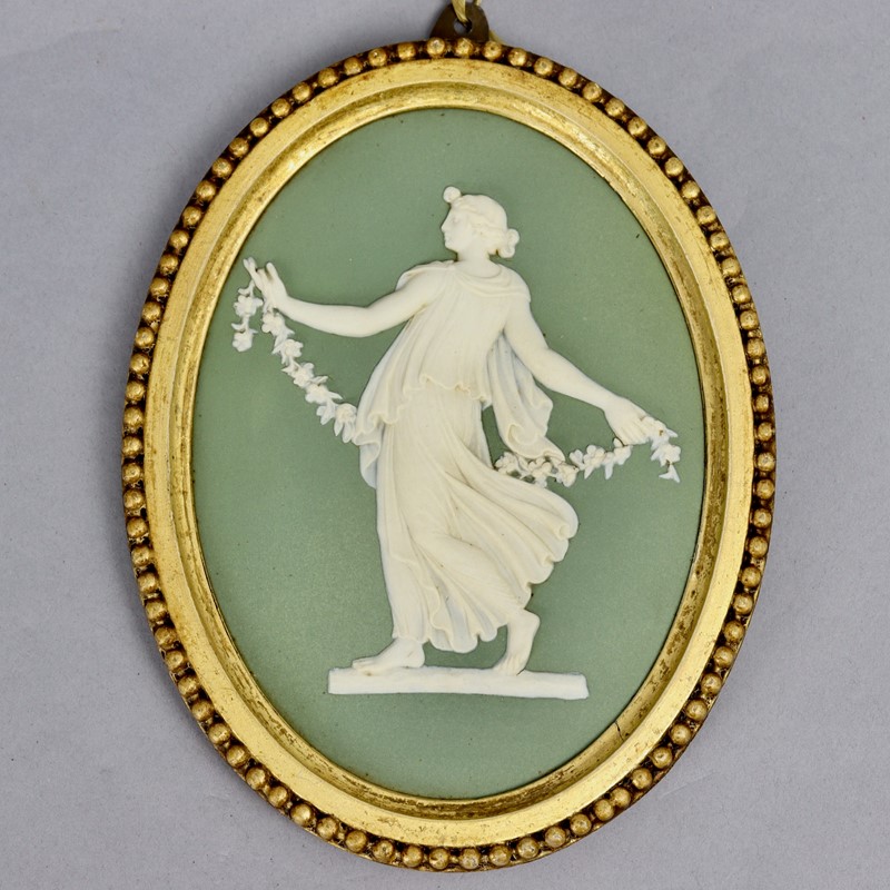 A 19th century Wedgwood, green jasper dip plaque in a later gilt frame. There is a back on the frame but we have removed this to see the marks. It is impressed “WEDGWOOD”, and there is also a large letter ‘M’, and it dates from c.1860. The plaque is decorated, in white relief, with a classical maiden carrying a garland of flowers. The relief is very good quality and the plaque is in excellent condition. Dimensions of plaque: Height 14.5cm. Width 10.8cm. Overall size with frame: Height 17.5cm. Width 14.5cm. Depth 2.2cm. Price includes postage within the U.K. Shipping to the U.S.A. add £20. Most of Western Europe add £10.