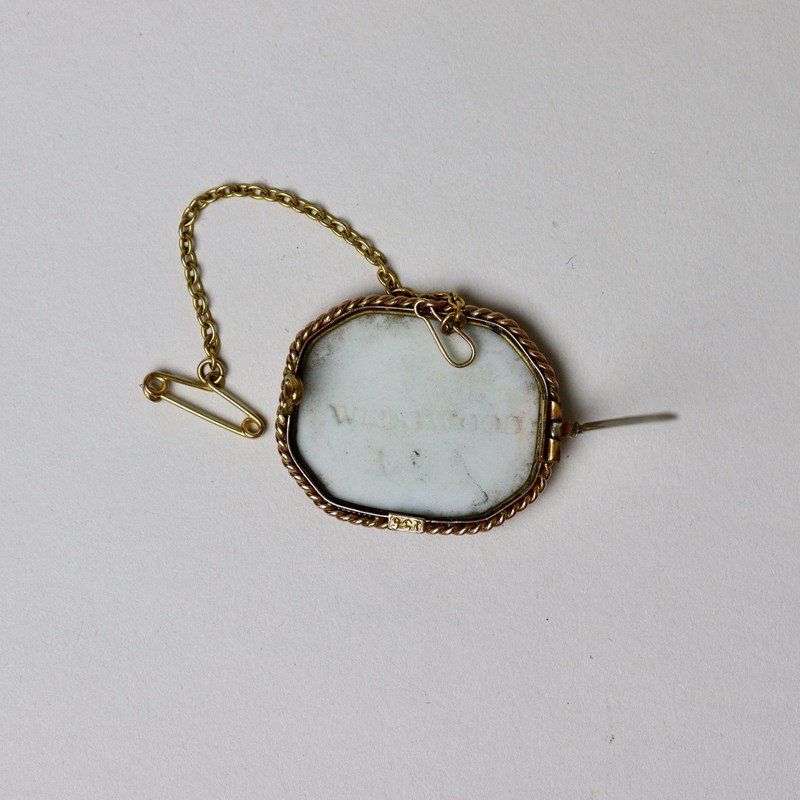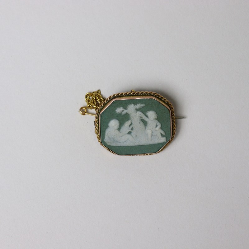 A small, 19th century, Wedgwood, green jasper dip broach. This is marked ”WEDGWOOD” and it dates from c.1880. The octagonal, green jasper dip cameo is decorated with a group of putti at play. This is set into a gold mount which marked “9CT”. The piece is in excellent condition.