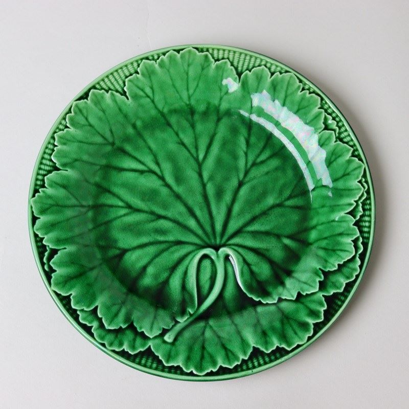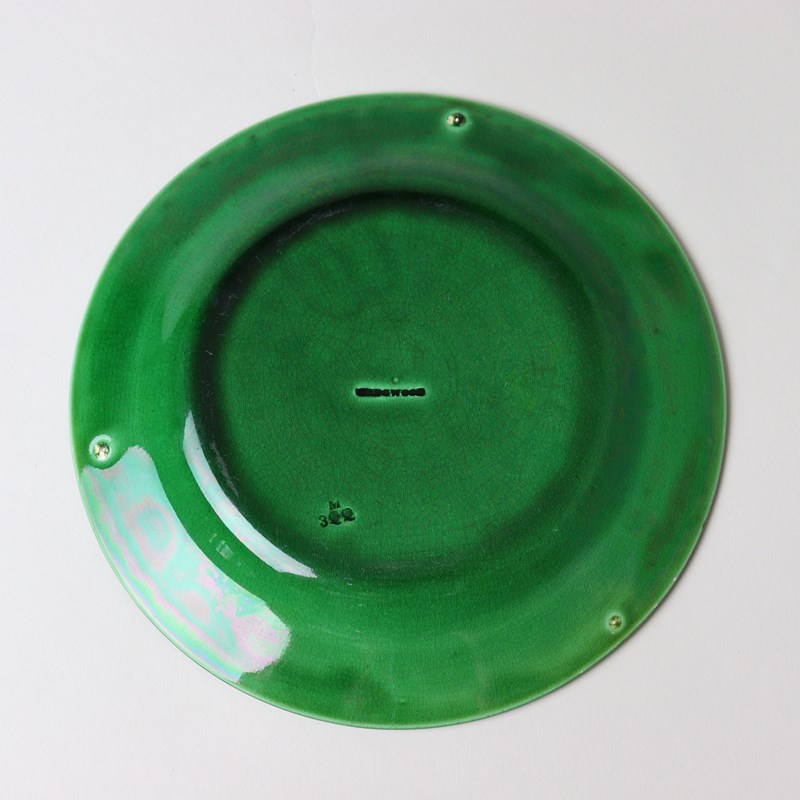 A Wedgwood, dark green, majolica glazed plate. This is marked ”WEDGWOOD” and it is also impressed with the date code “3QQ” under the letter “M”. This code dates the year of manufacture of the plate to 1914. The plate is moulded with a cabbage leaf design which is then covered in a deep green, majolica glaze. It is in excellent condition.