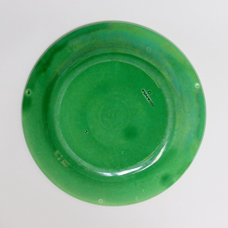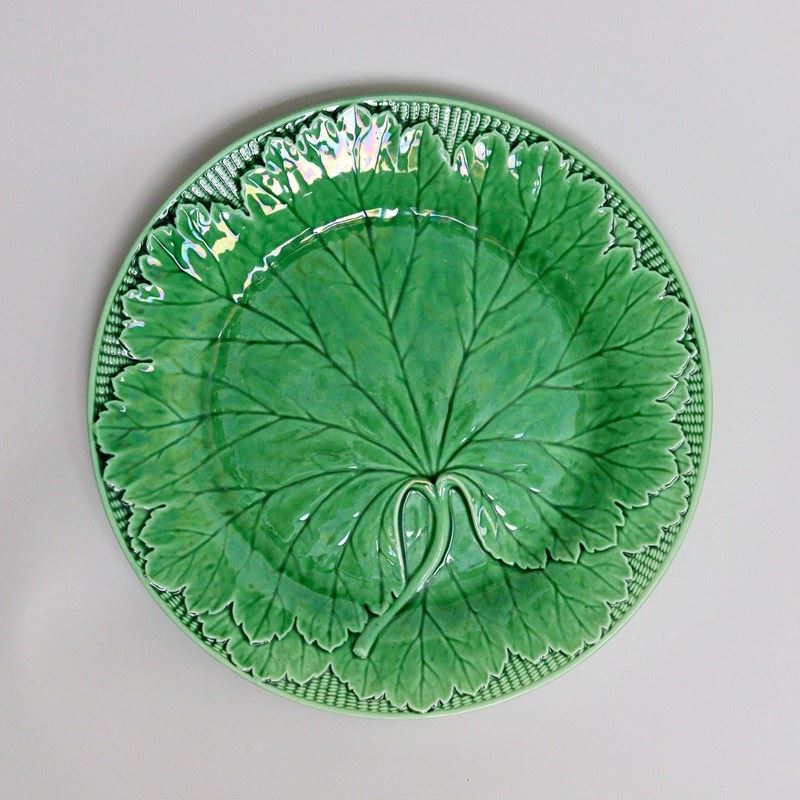 A Wedgwood, green majolica glazed leaf plate. This is marked “WEDGWOOD” and it dates from c.1860. There is also an impressed “O” and an “X”. The plate is moulded with a cabbage leaf deign against a basket weave background and this is covered in a rich, green majolica glaze. It is in excellent condition.