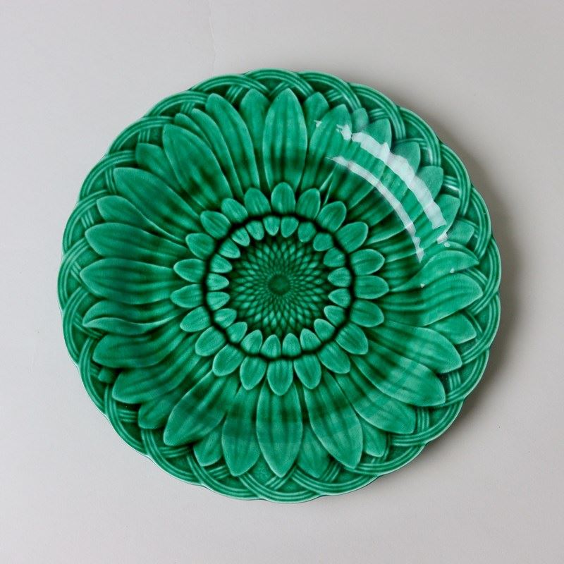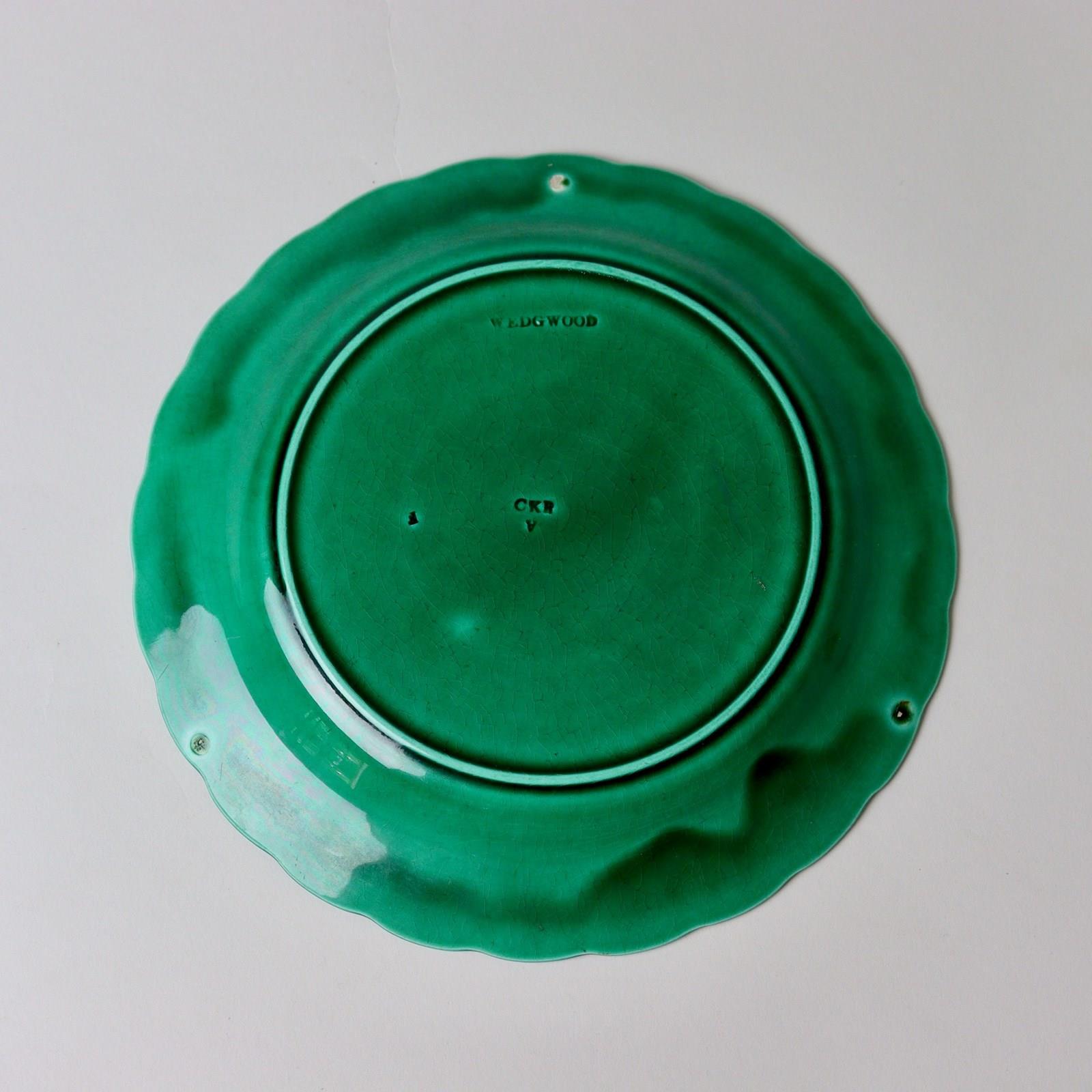 A Wedgwood, dark green, majolica glazed plate moulded with a sunflower. This is marked ”WEDGWOOD” and it is also impressed with the letters “CKR”. This is the date code for the year of manufacture which was 1863. There are two further impressed letters, an “A” and an “F”. These could be workman’s marks. The moulded design shows a sunflower against a basket weave border and it is covered in a dark green, majolica glaze. It is in excellent condition.