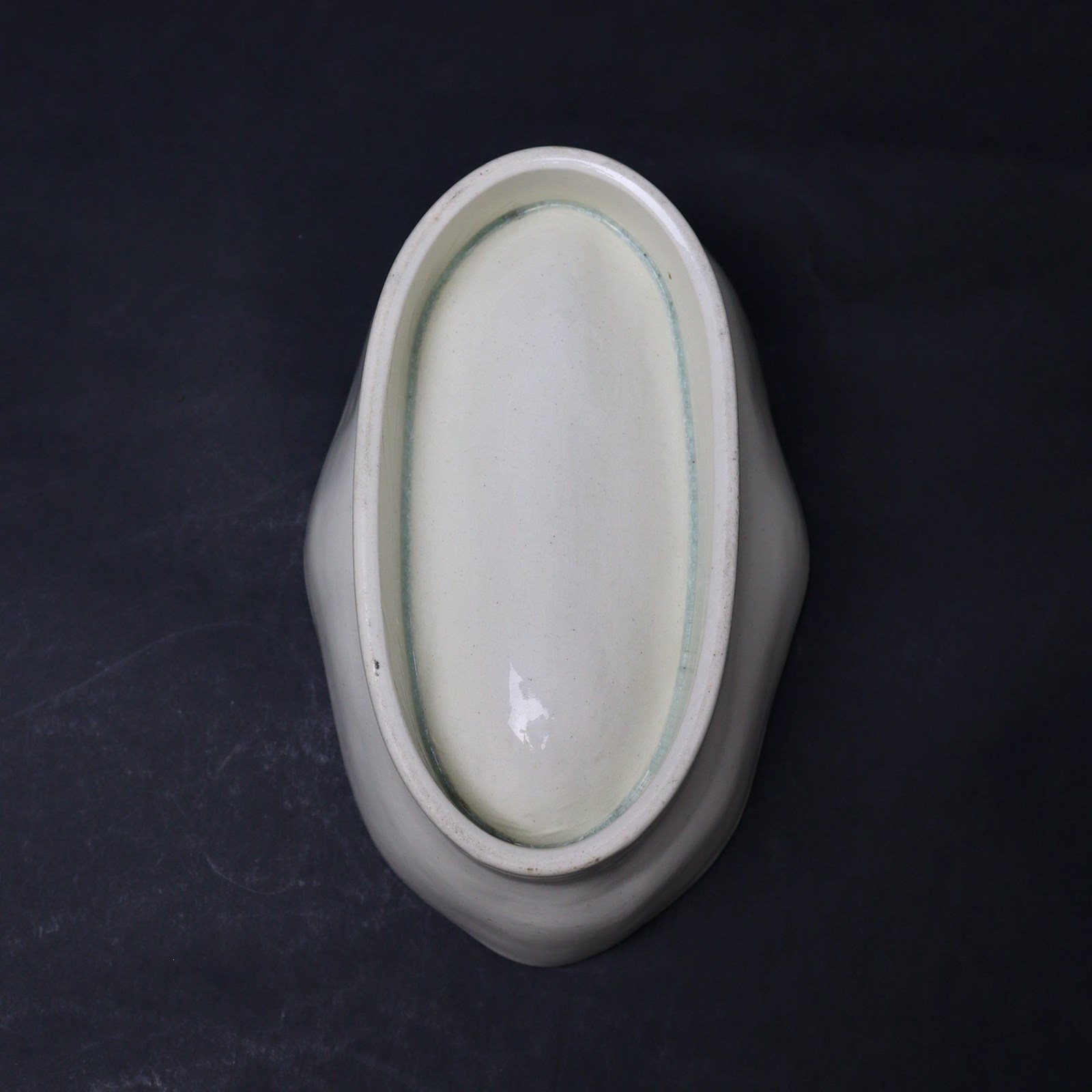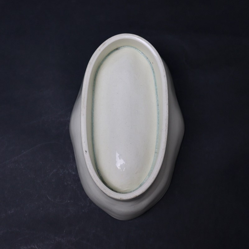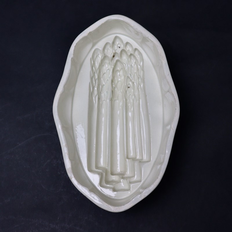 A nineteenth century, Wedgwood pearlware mould with a bunch of asparagus to the base. This is impressed “WEDGWOOD” and it is also impressed with a number ”60” which is the pattern number. It dates from c.1820. The moulding of the design is very deep and well detailed. There is a very fine glaze crack to one end of the mould. This is visible on the interior but it does not go through to the exterior.