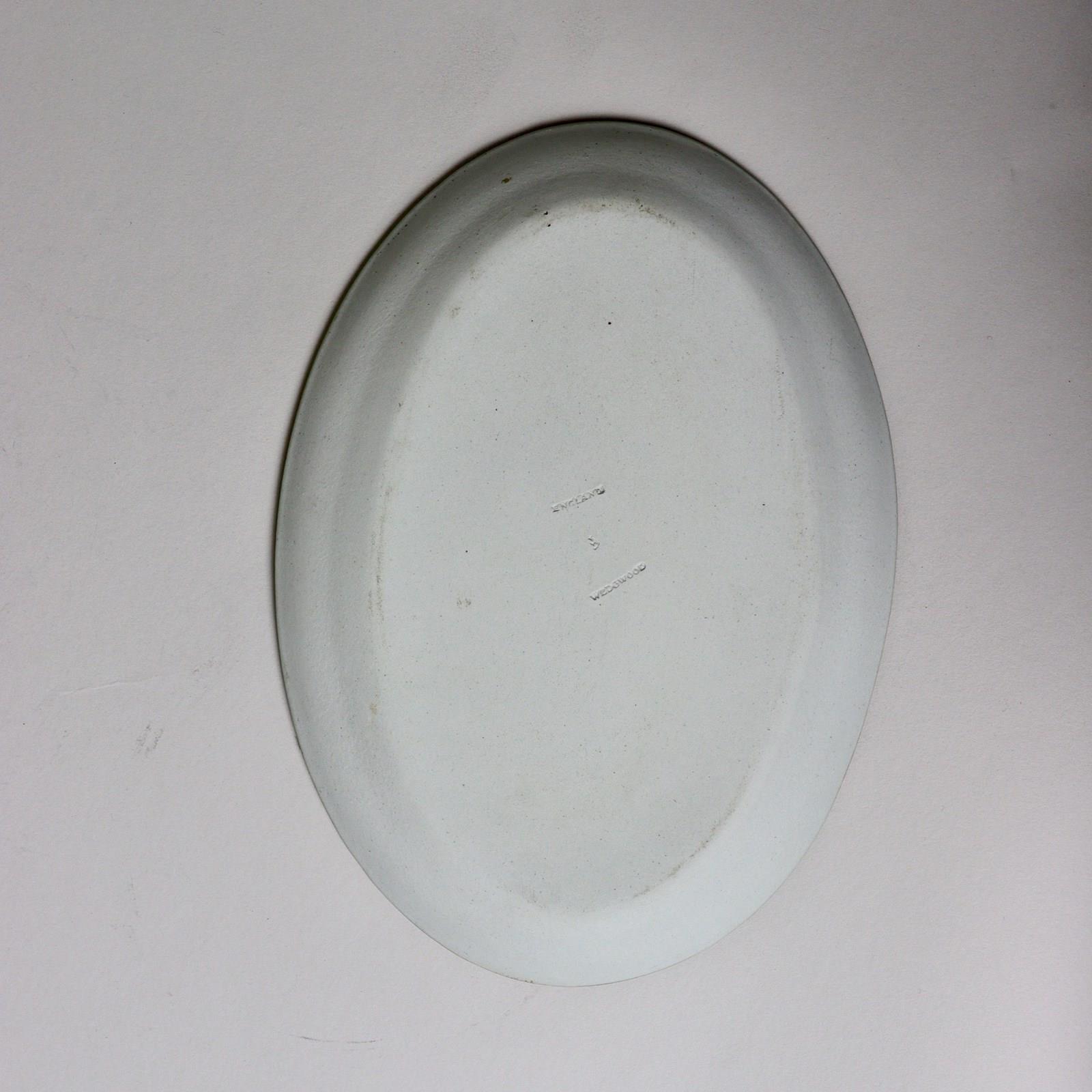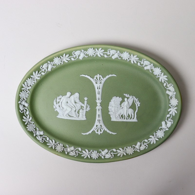 A Wedgwood, pale green jasper dip dressing table tray. This is marked “WEDGWOOD ENGLAND” and it dates from c.1900. It is also impressed with a letter “F” which would be the workman’s mark. It is decorated, in white relief, with two classical subjects divided by an anthemion. To the border is a very attractive, floral border depicting passion flowers. The reliefs are all very good quality and the piece is in excellent condition.