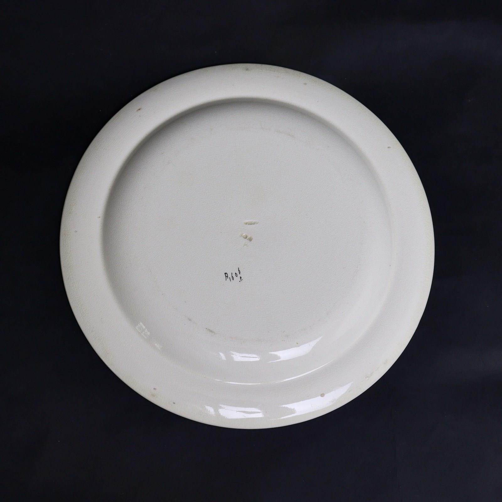 A Wedgwood, late creamware, dinner plate decorated with birds and a butterfly. This is marked ”WEDGWOOD” and it is also impressed with the letters ”SOA” above a letter “T”. This is the date code for the year of manufacture which is 1872. It also has a pattern number “A1606” over “P” in black enamel. The plate is potted in a heavy creamware, which is known as late creamware, as the body is quite different to the early, lightly potted creamware of the 18th century. It is decorated with an outline transfer print in dark red which is then hand coloured with bright, polychrome enamels. It is in excellent condition.