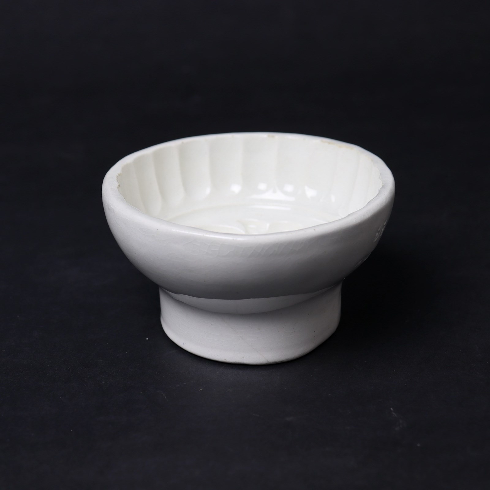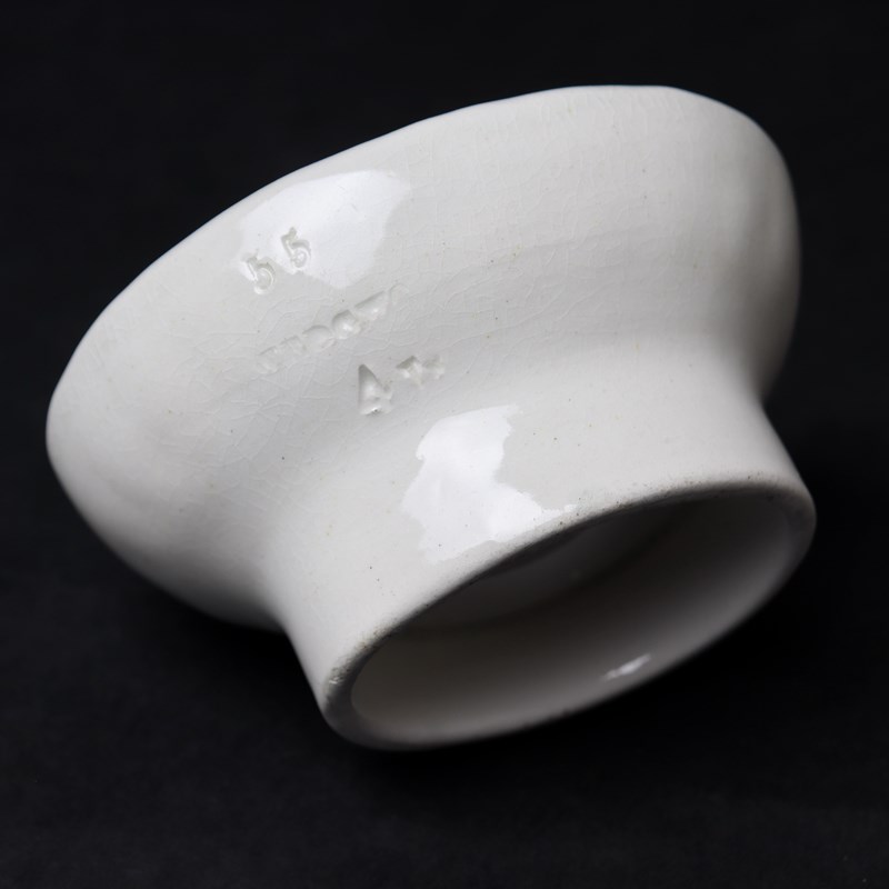 A small, Wedgwood earthenware jelly mould with flowers and buds to the base. This is marked “WEDGWOOD” and it is also impressed with the pattern number “55” and “4 IN” which relates to the length in inches. The design has good detail and would turn out well. There is a feint hairline crack in the foot rim of the mould but this does not affect the body so it does not affect the usability of the mould. Otherwise it is in good condition.