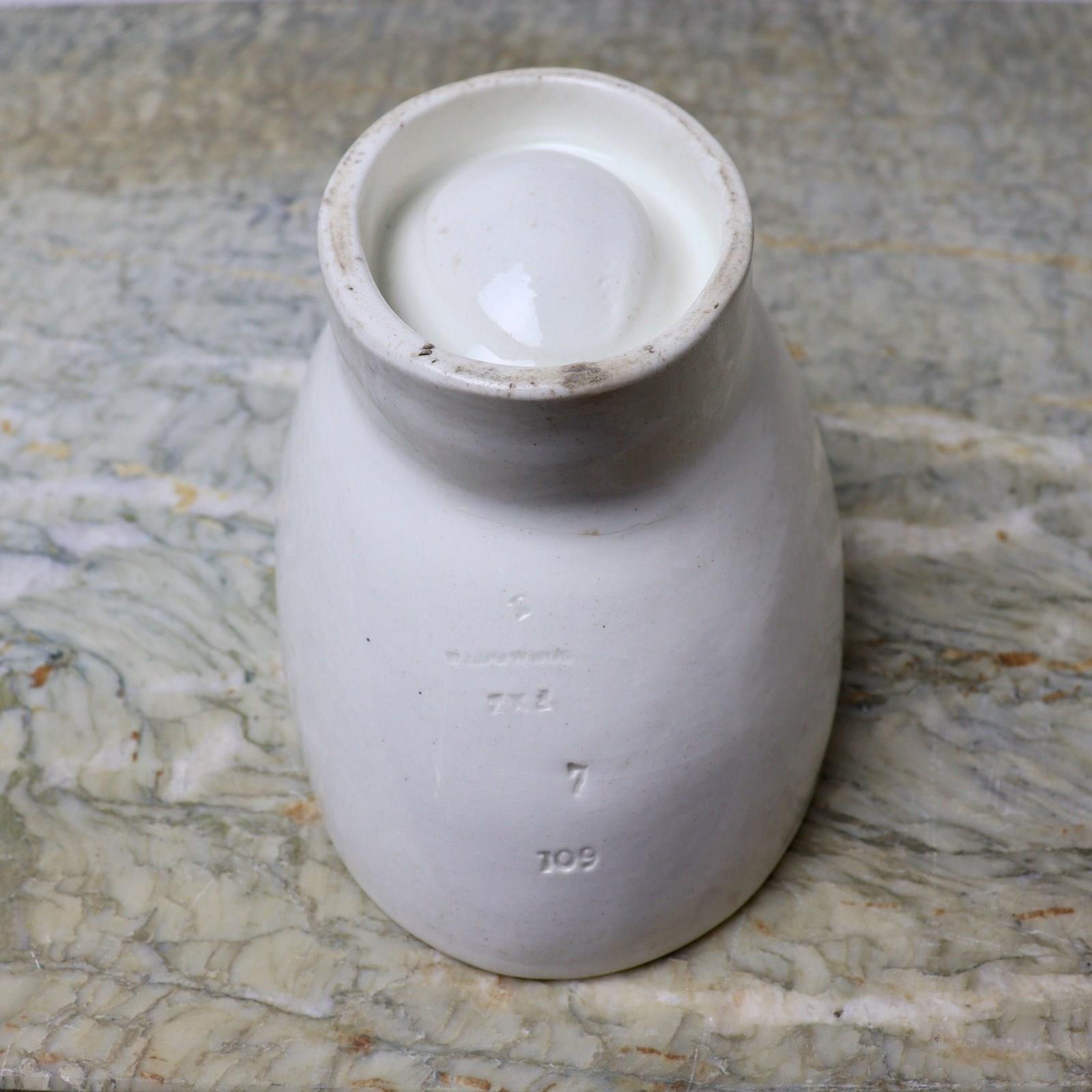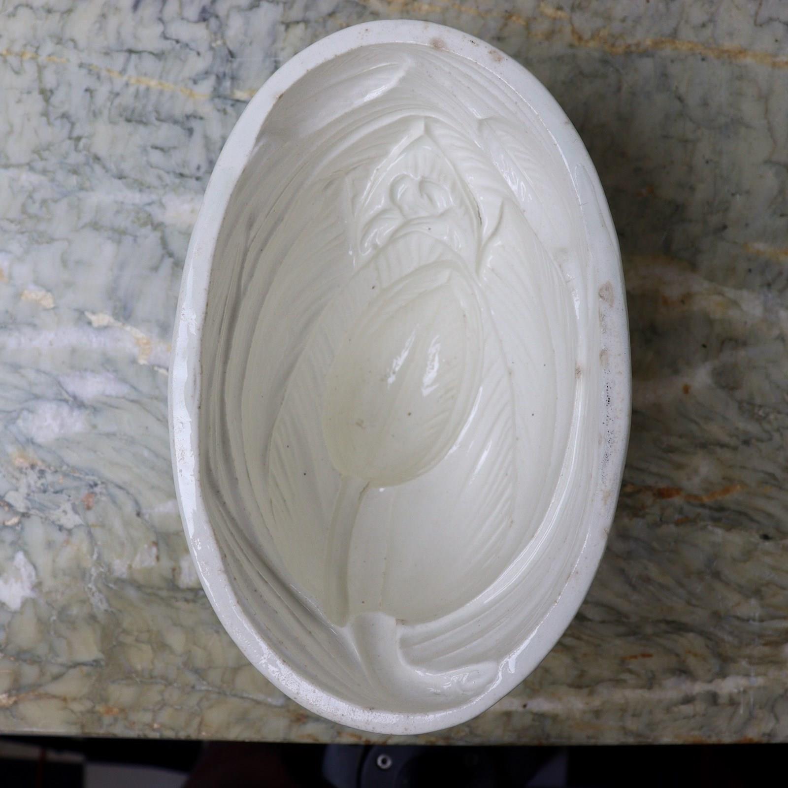 A Wedgwood pottery jelly mould with a tulip design. This is marked ”WEDGWOOD”, “7”, “109” and “FXZ”. FXZ is the Wedgwood date code for the year of manufacture which was 1871, 109 is the pattern number and 7 relates to the length in inches. The design consists of a tulip on top of a mound of leaves. It is well detailed and would turn out well. There are a couple of small stains within the mould but otherwise it is in good condition.
