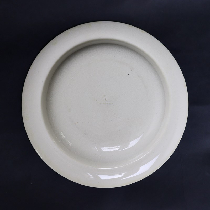 A Wedgwood, late creamware, soup plate decorated with a bird and a butterfly. This is marked ”WEDGWOOD” and it is also impressed with an indistinct date code which ends in the letters “MS”. This is the date code for the year of manufacture which is 1864. The soup plate is potted in a heavy creamware, which is known as late creamware, as the body is quite different to the early, lightly potted creamware of the 18th century. It is decorated with an outline transfer print in brown which is then hand coloured with bright, polychrome enamels. There is very slight flaking to the ochre enamel on the rim but otherwise it is in good condition.